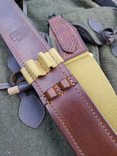 This sling has the traditional look of leather and cotton webbing.