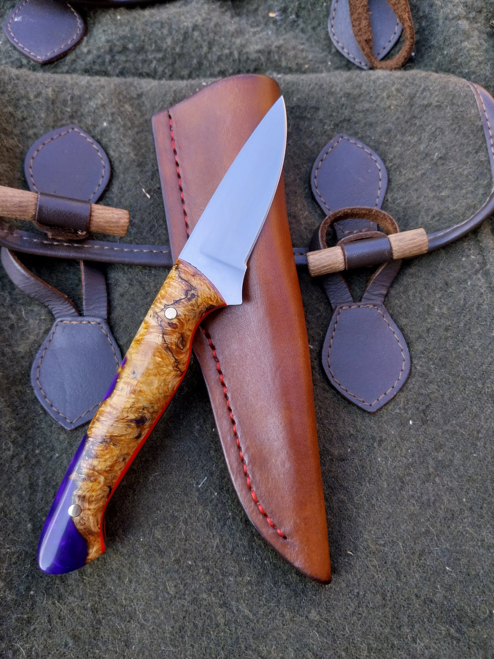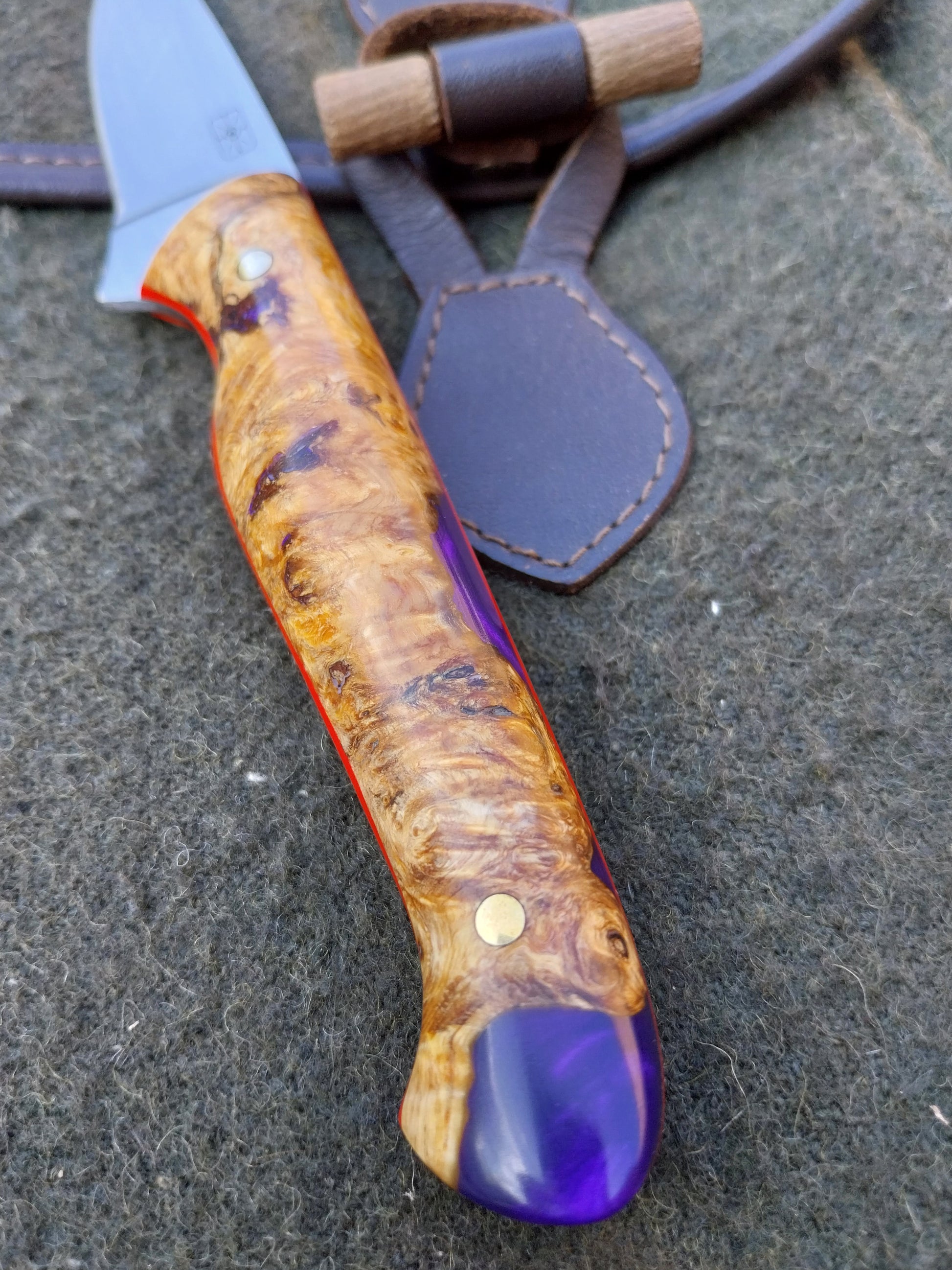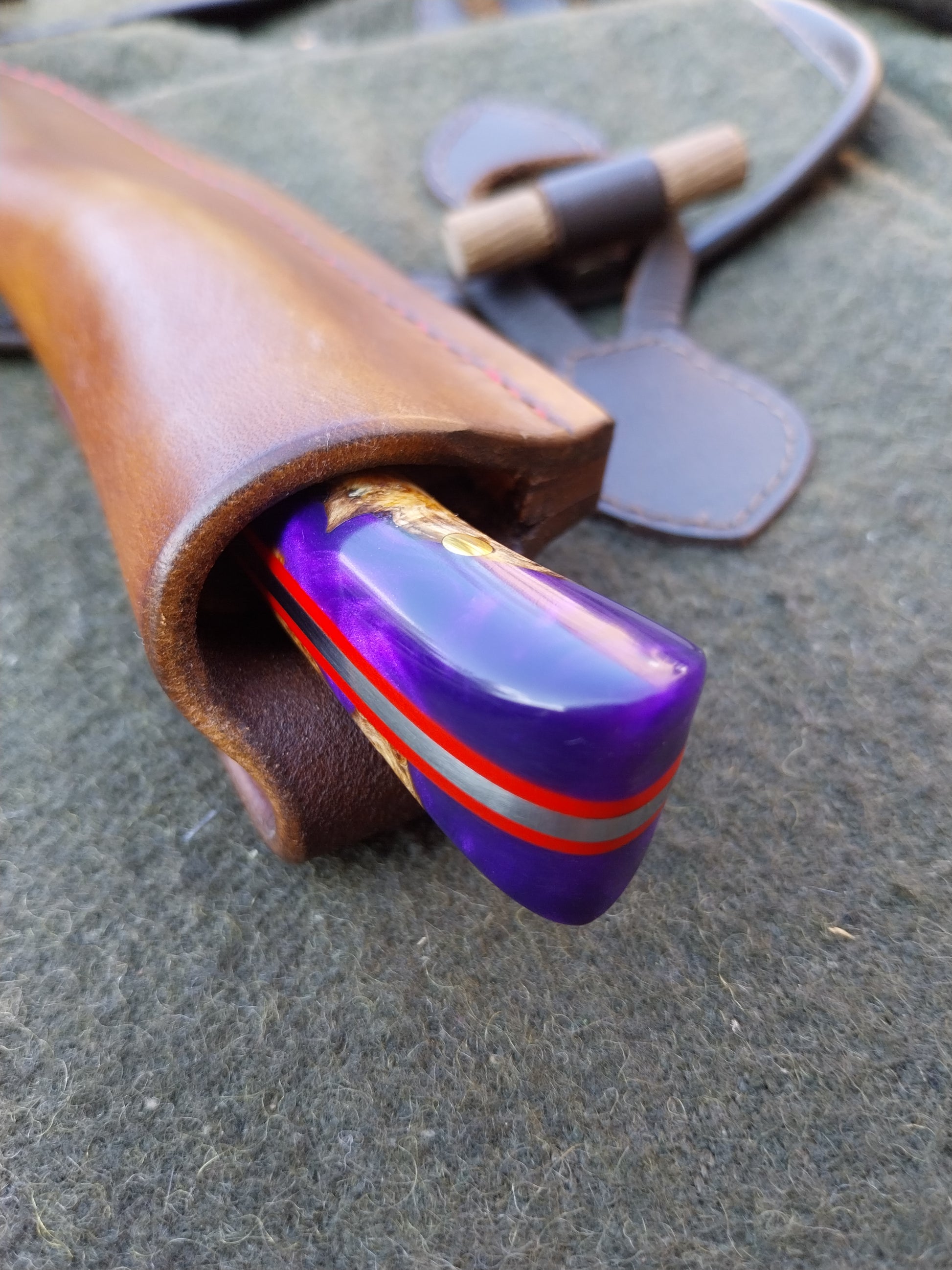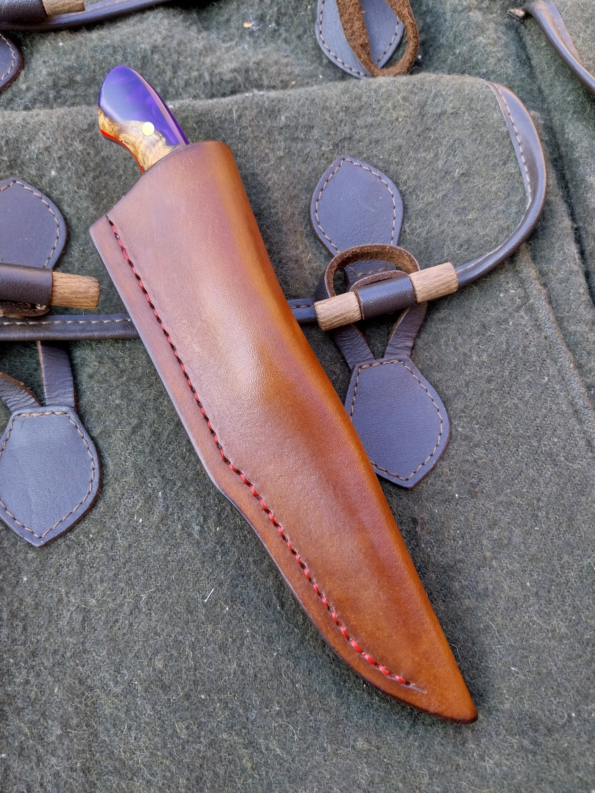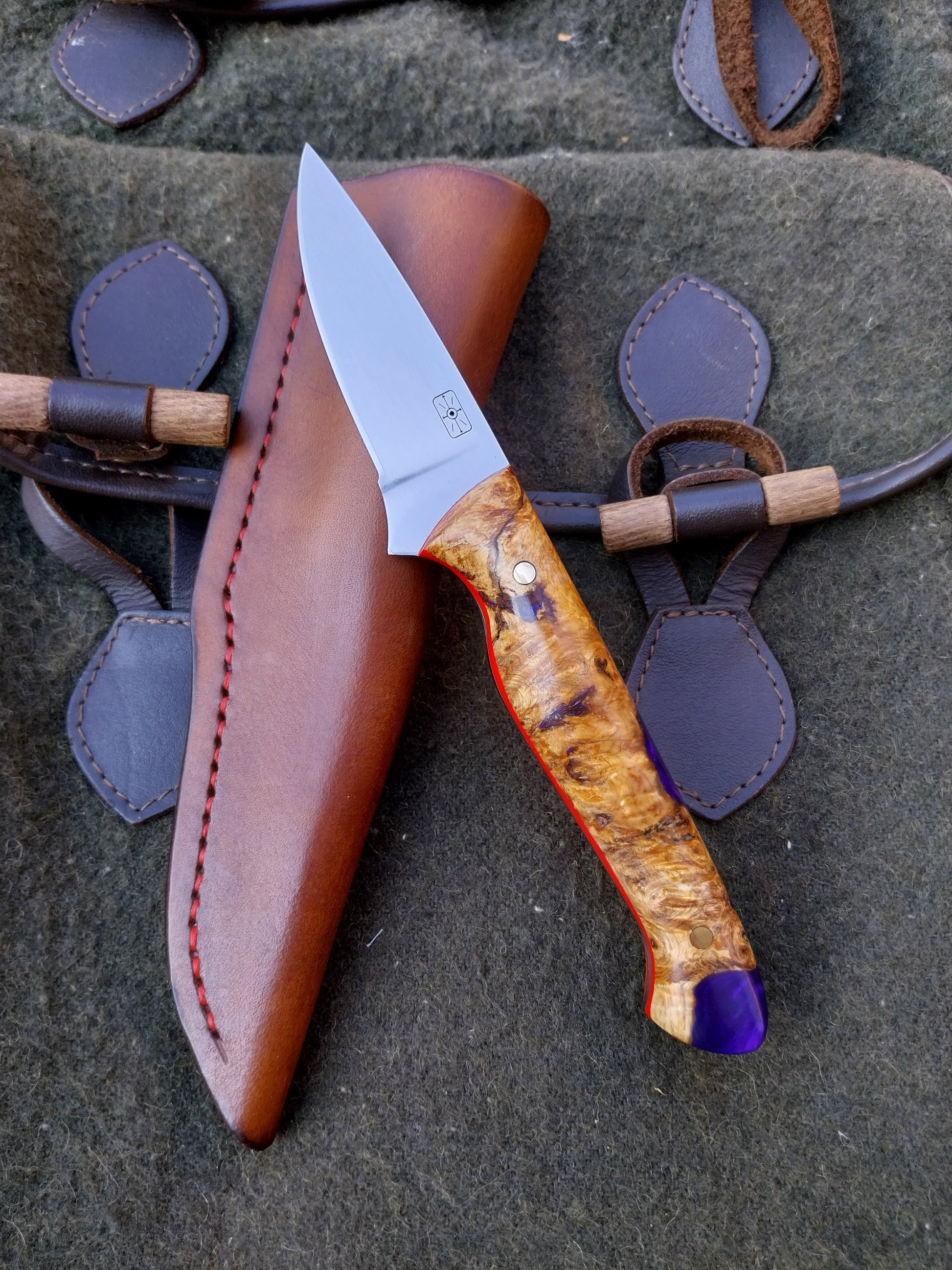 This Catcher has been fitted with stabilised Mallee burl and purple resin Scales with red G10 liners. These have been fitted to the blade with a brass pins. And comes with a walnut brown leather sheath with red stitching.