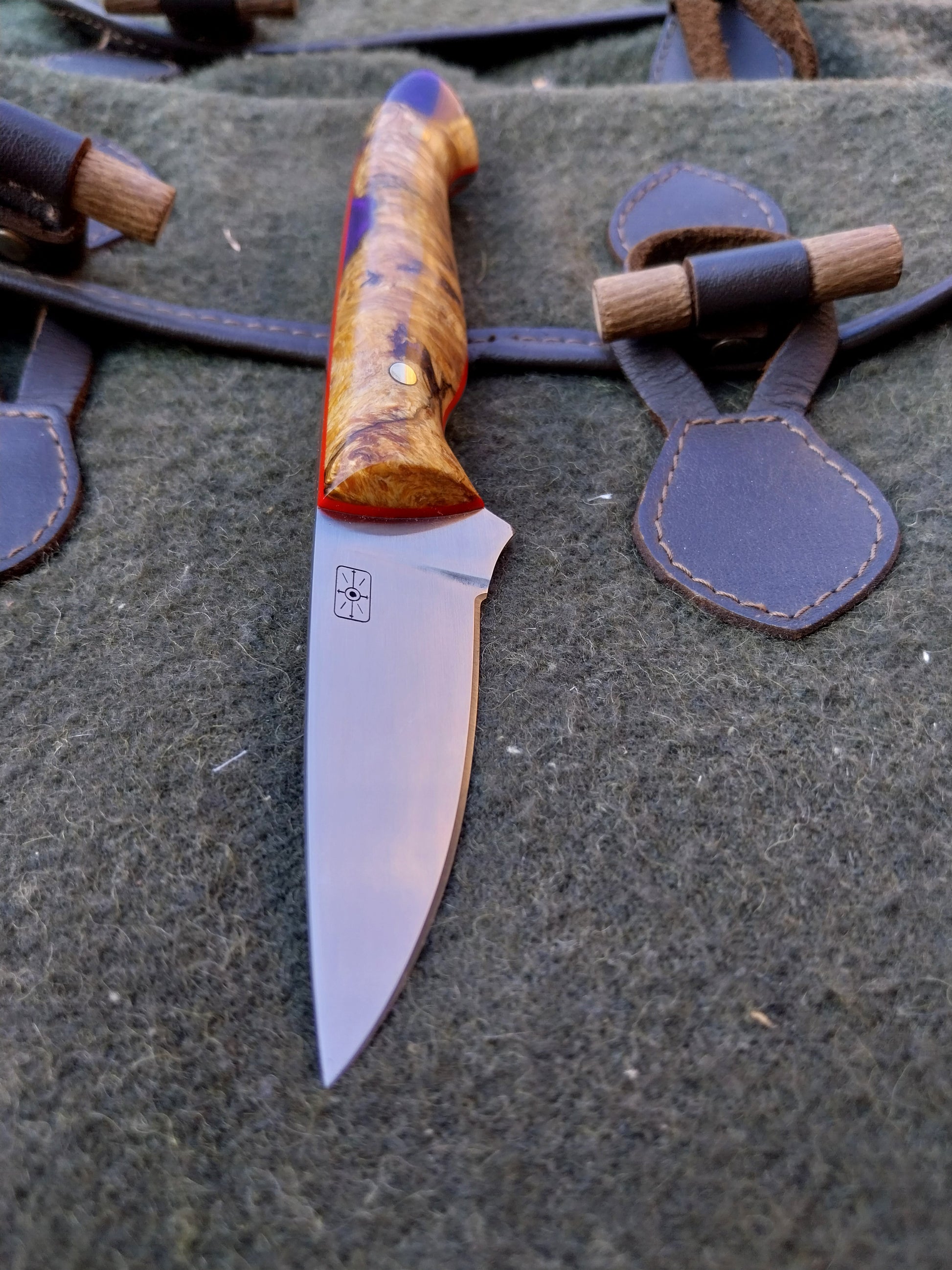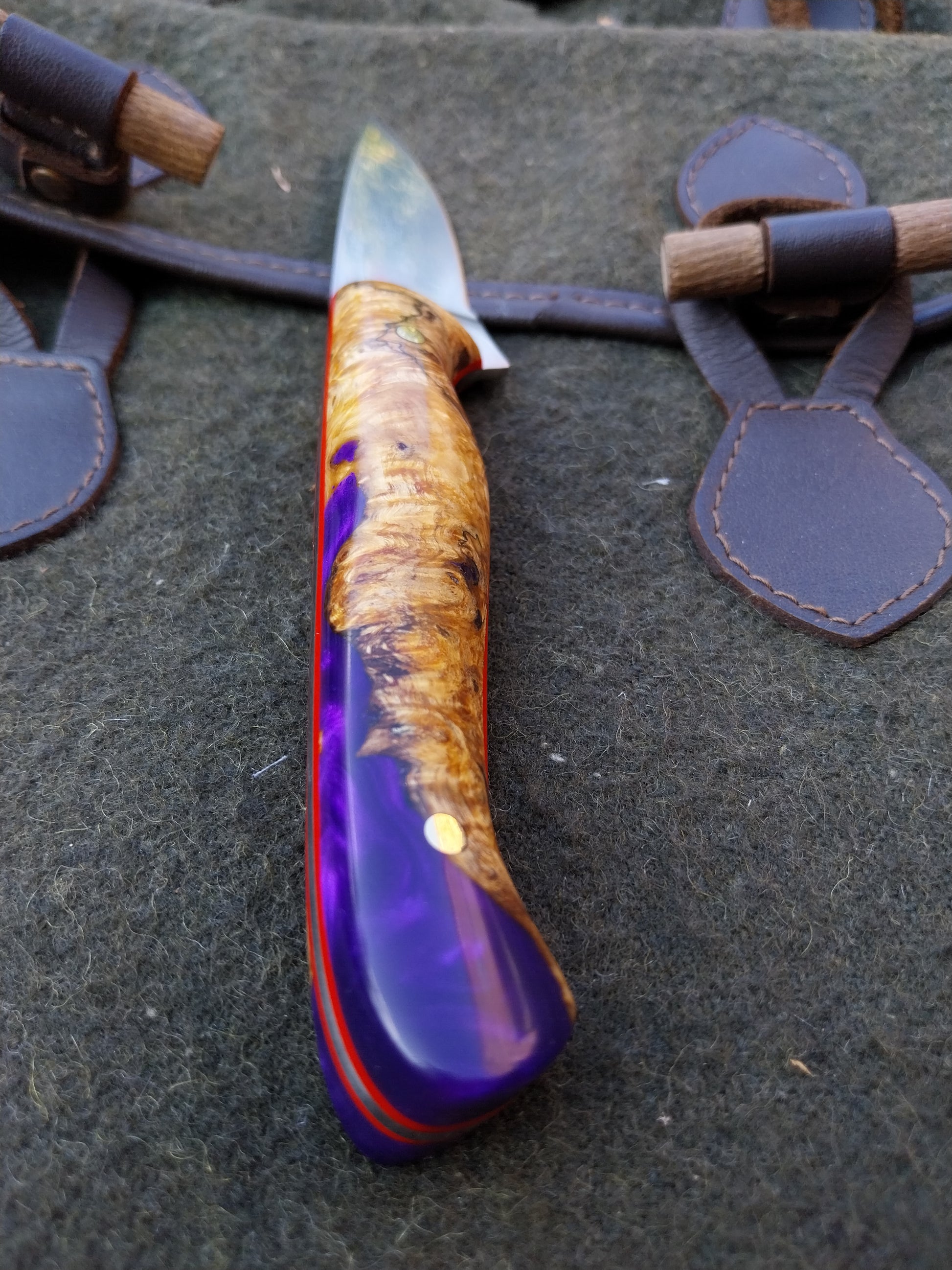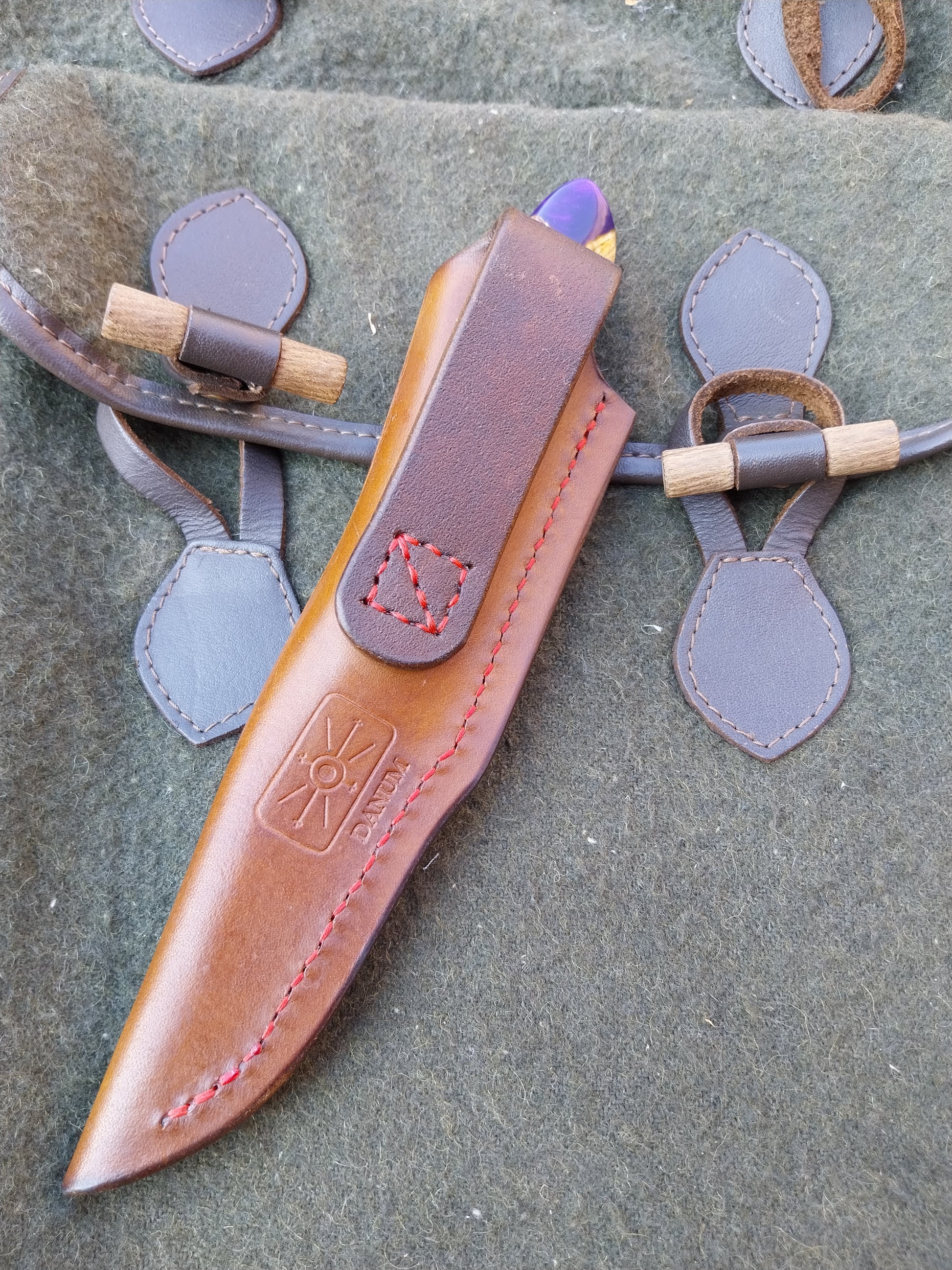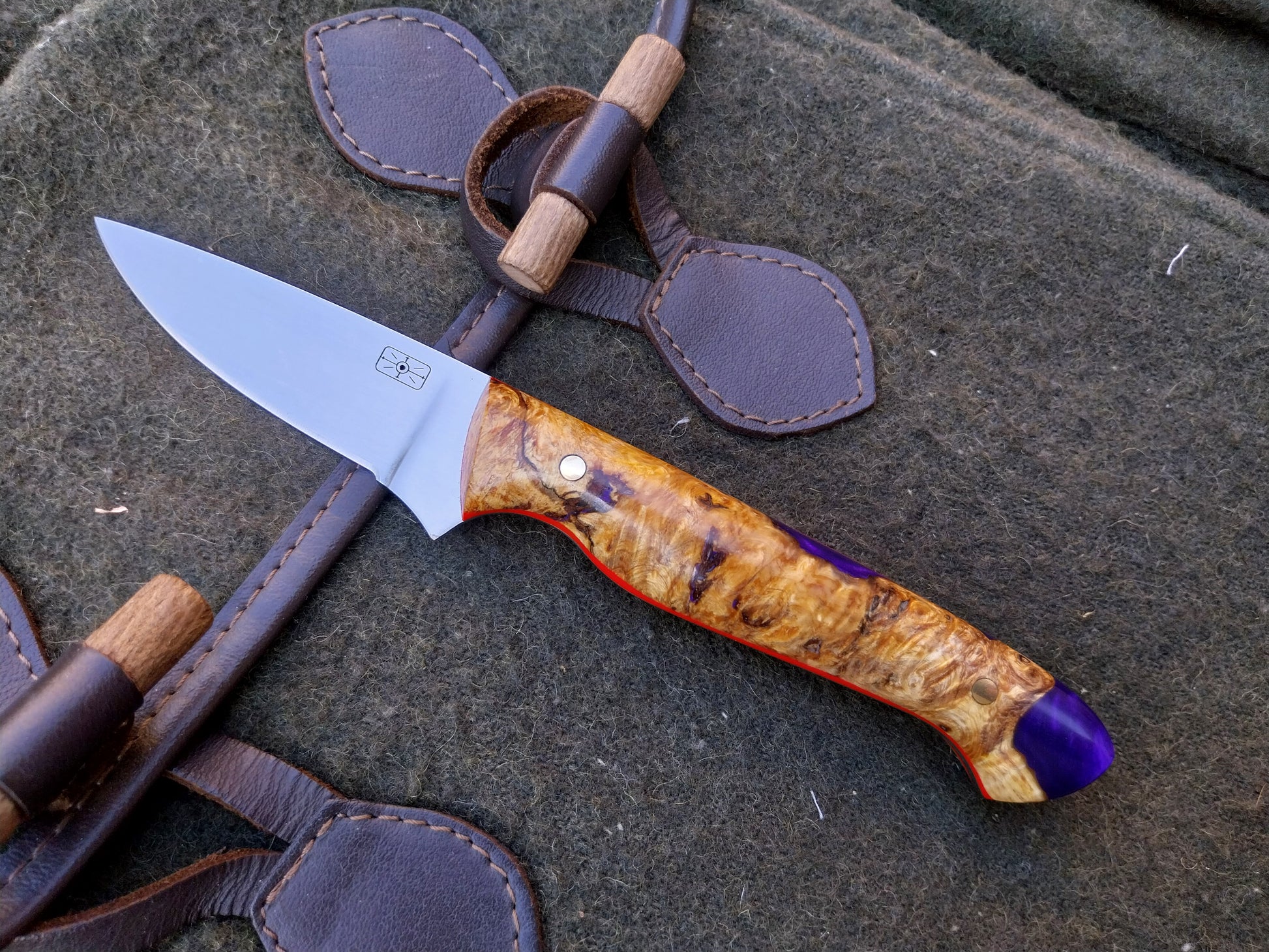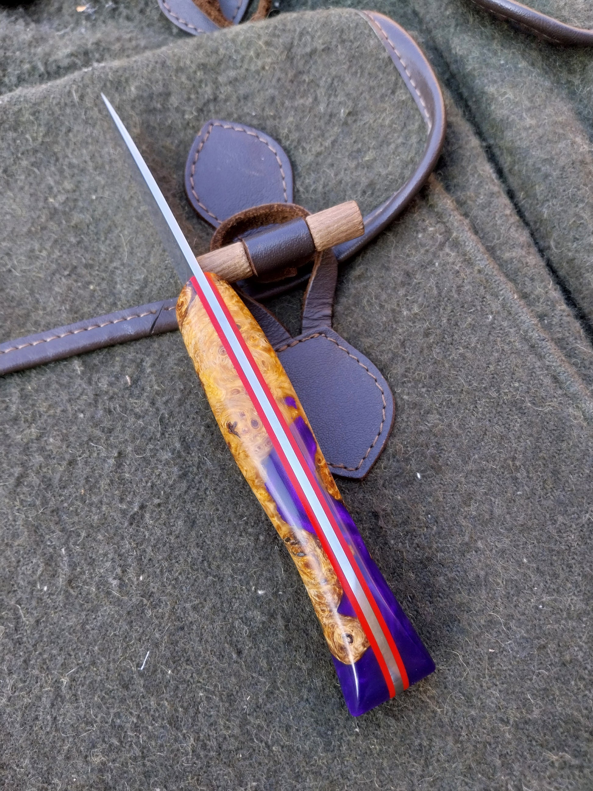This Catcher has been fitted with stabilised Mallee burl and purple resin Scales with red G10 liners. These have been fitted to the blade with a brass pins. And comes with a walnut brown leather sheath with red stitching.