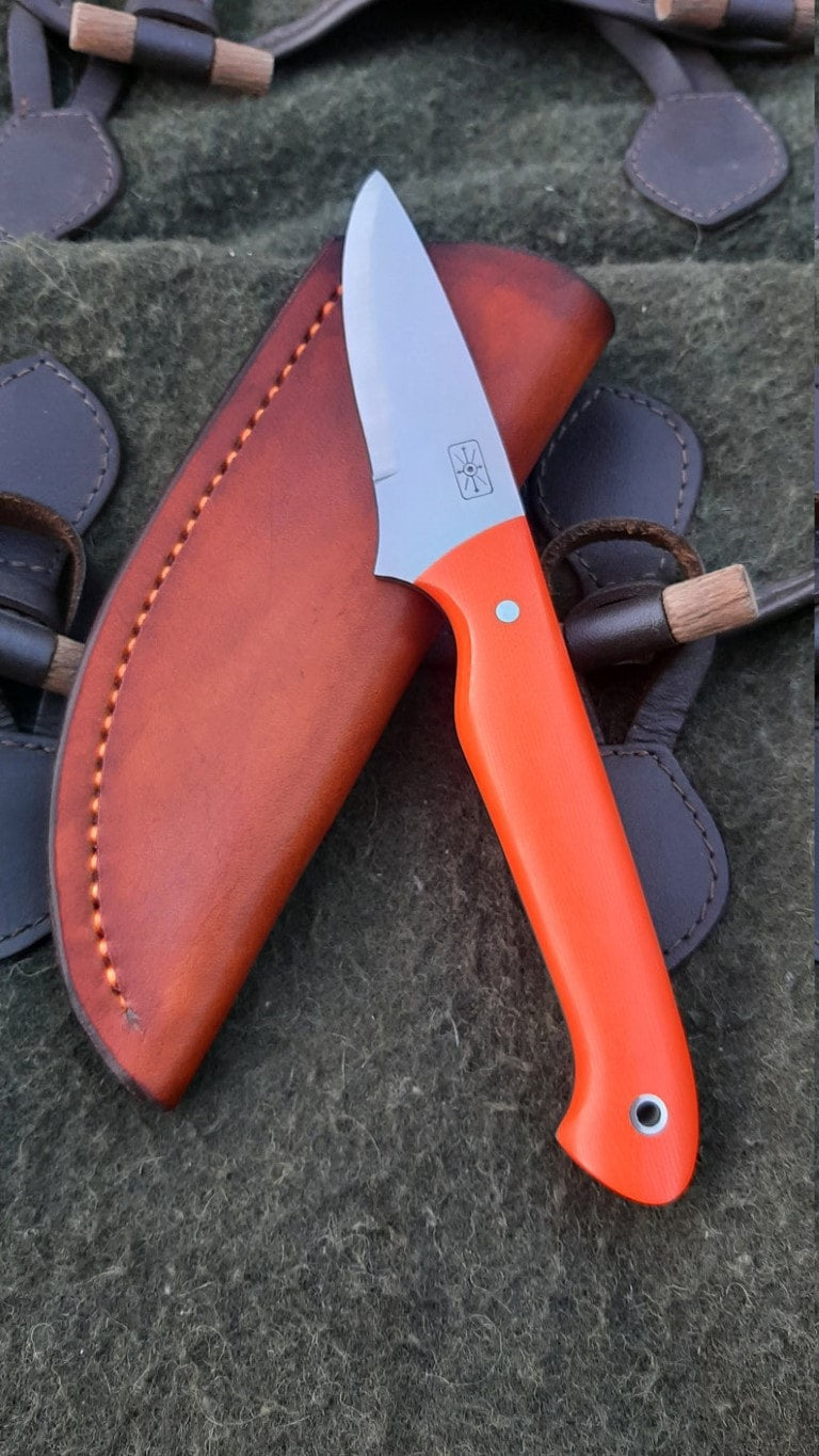 This Catcher has been fitted with Orange G10 Scales. These have been fitted to the blade with a stainless pin and lanyard tube. And comes with a Leather sheath.
