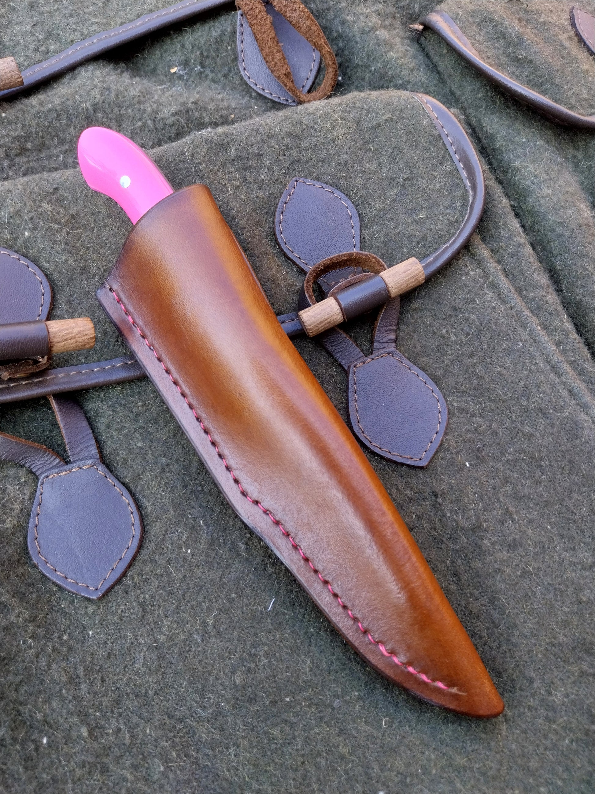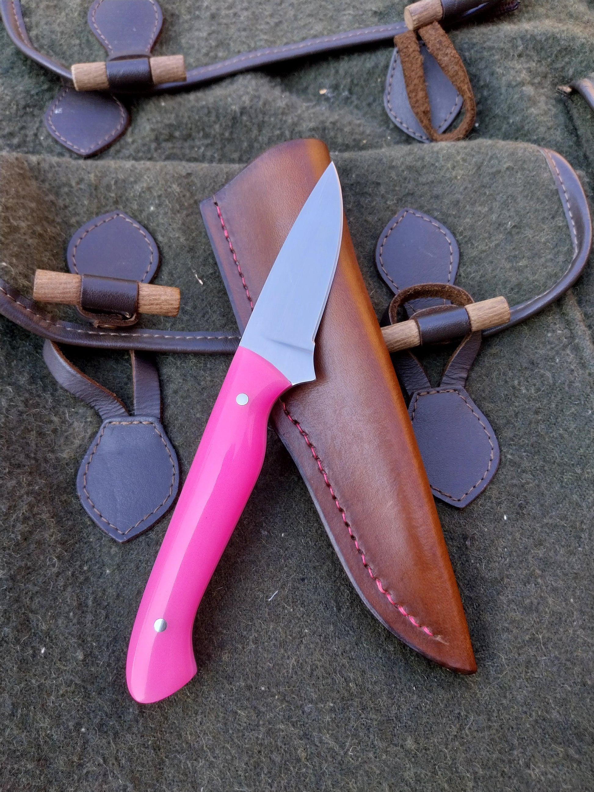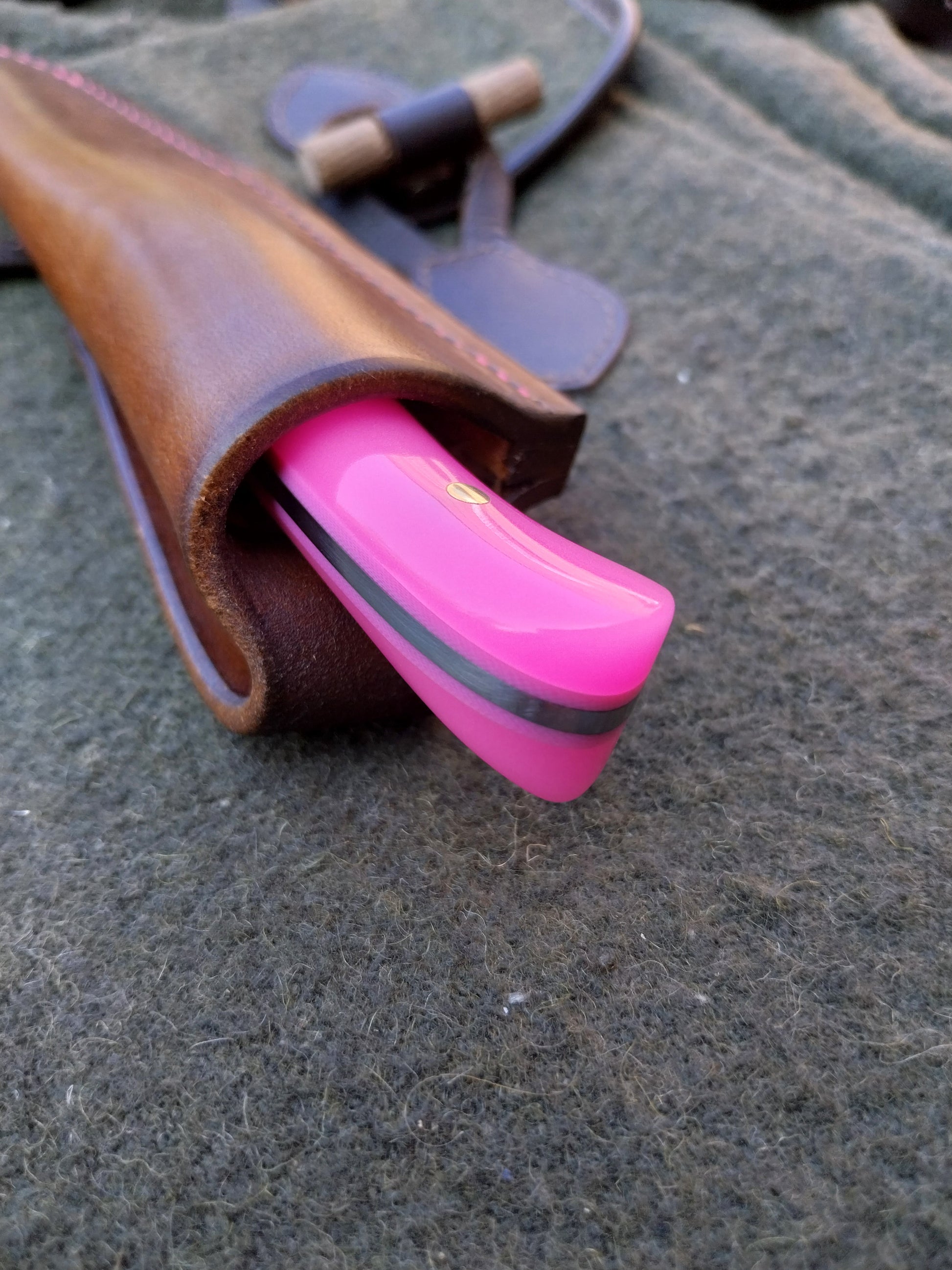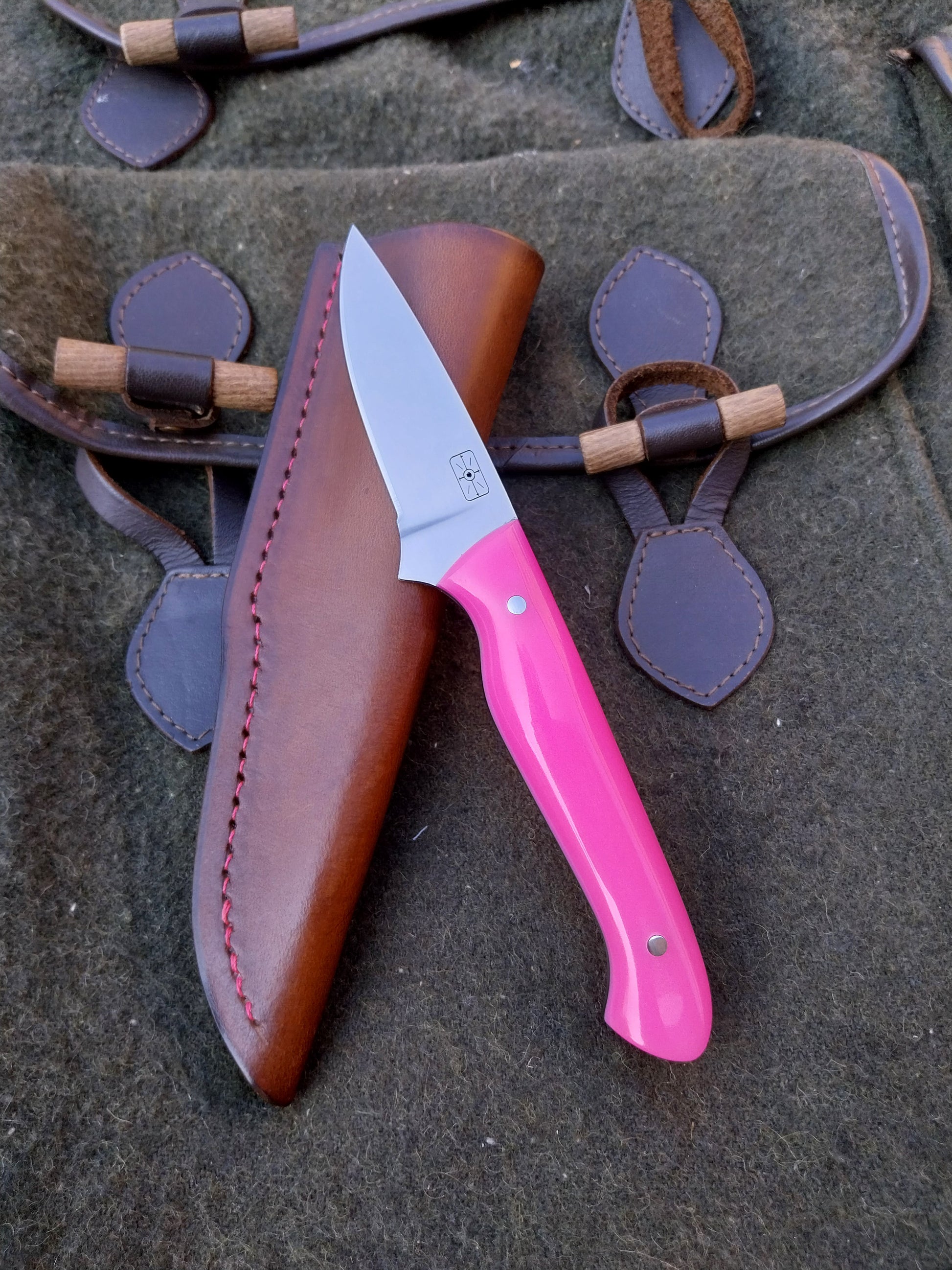This Catcher has been fitted with stabilised Pink Glaow in the dark kirinite Scales with pink G10 liners. These have been fitted to the blade with stainless pins. And comes with a walnut brown leather sheath with pink stitching.