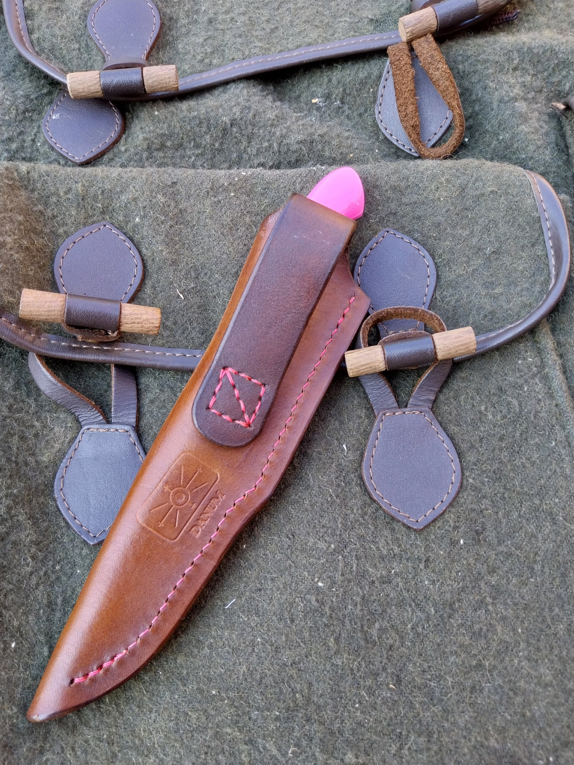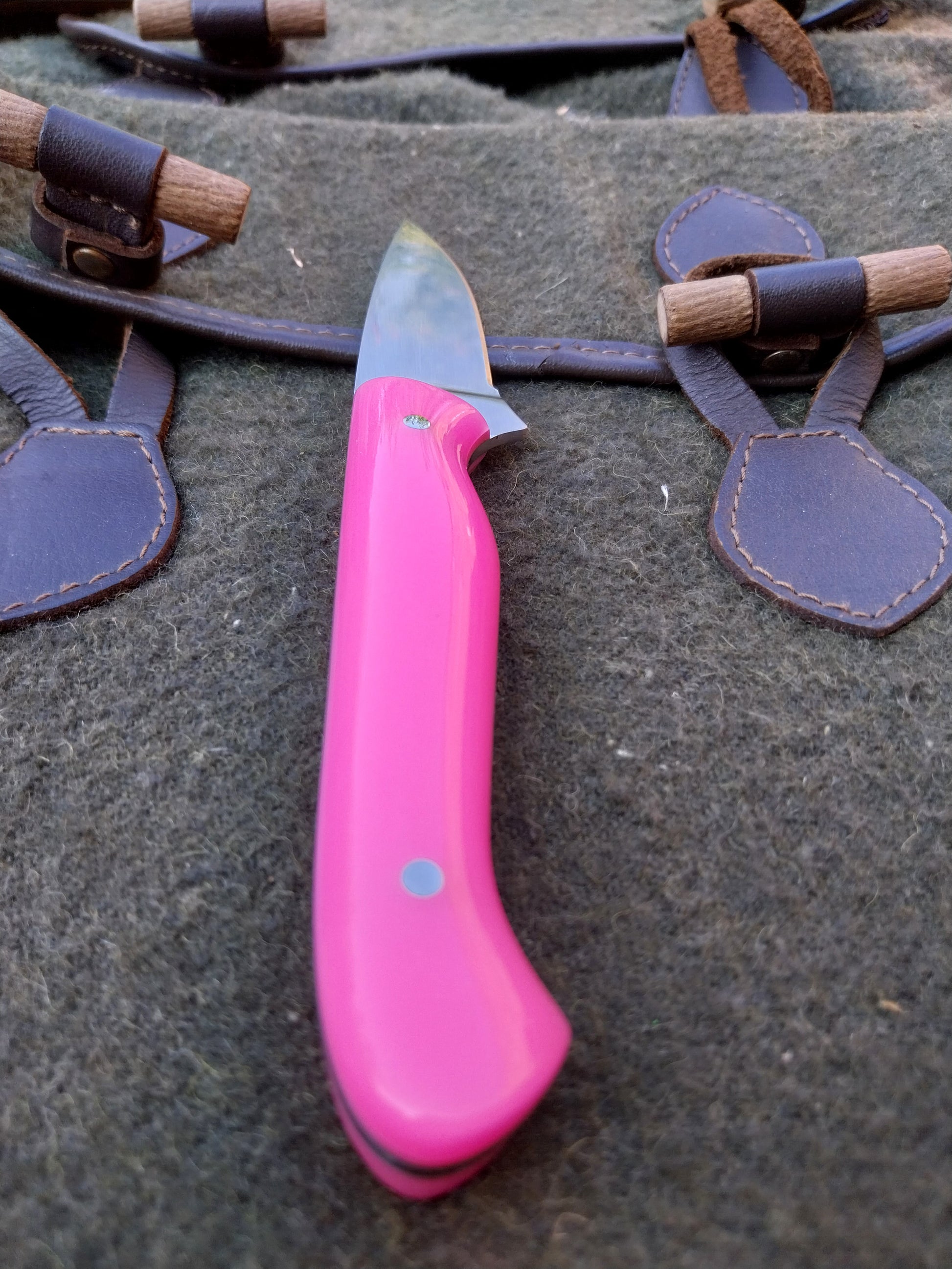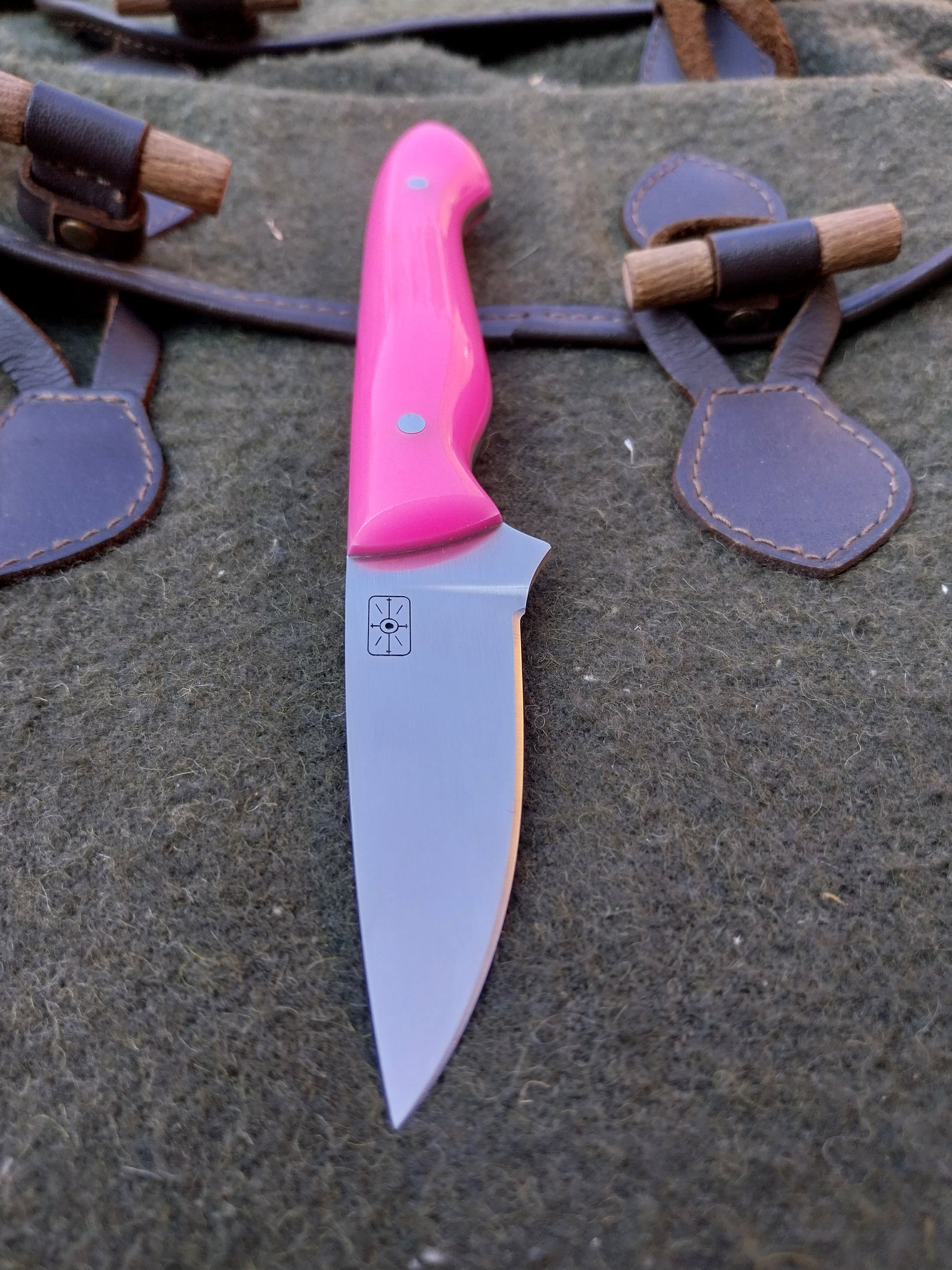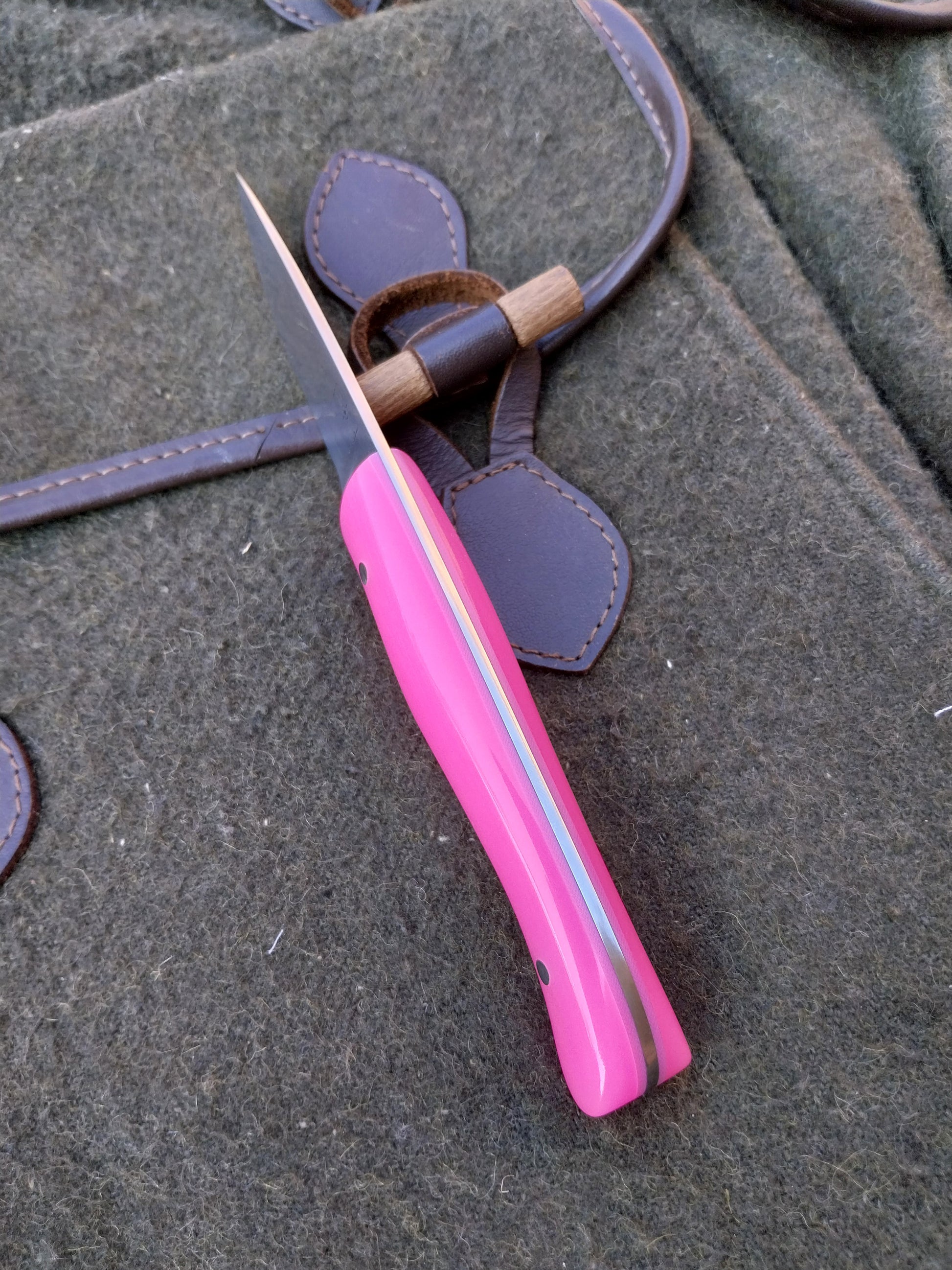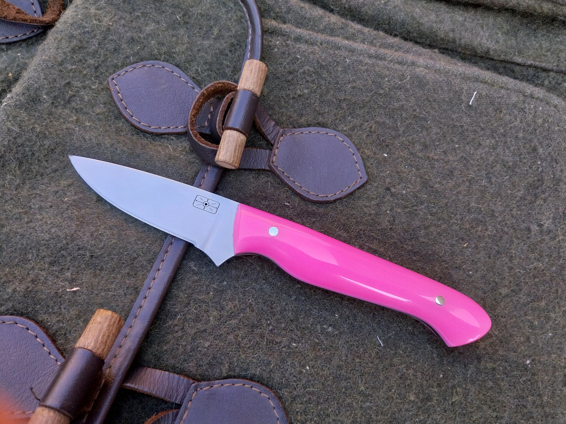 This Catcher has been fitted with stabilised Pink Glaow in the dark kirinite Scales with pink G10 liners. These have been fitted to the blade with stainless pins. And comes with a walnut brown leather sheath with pink stitching.