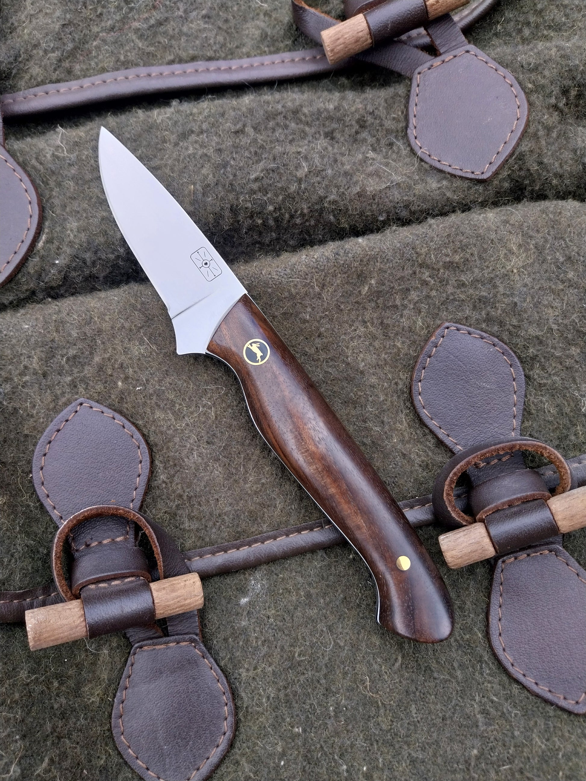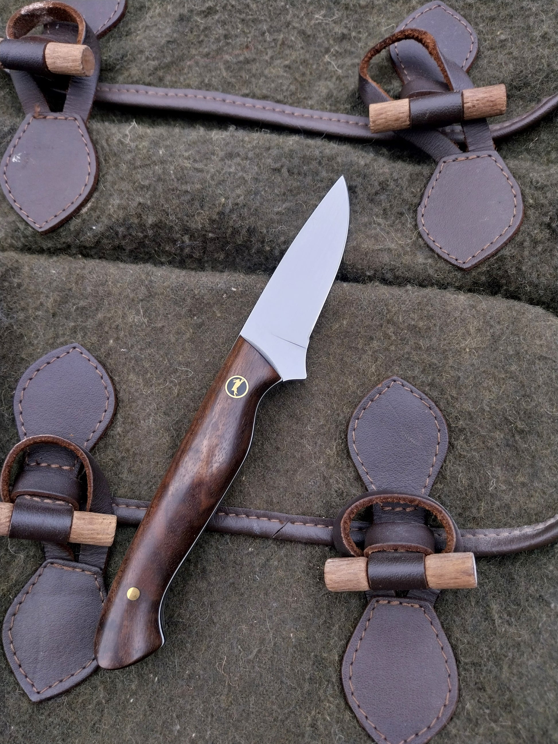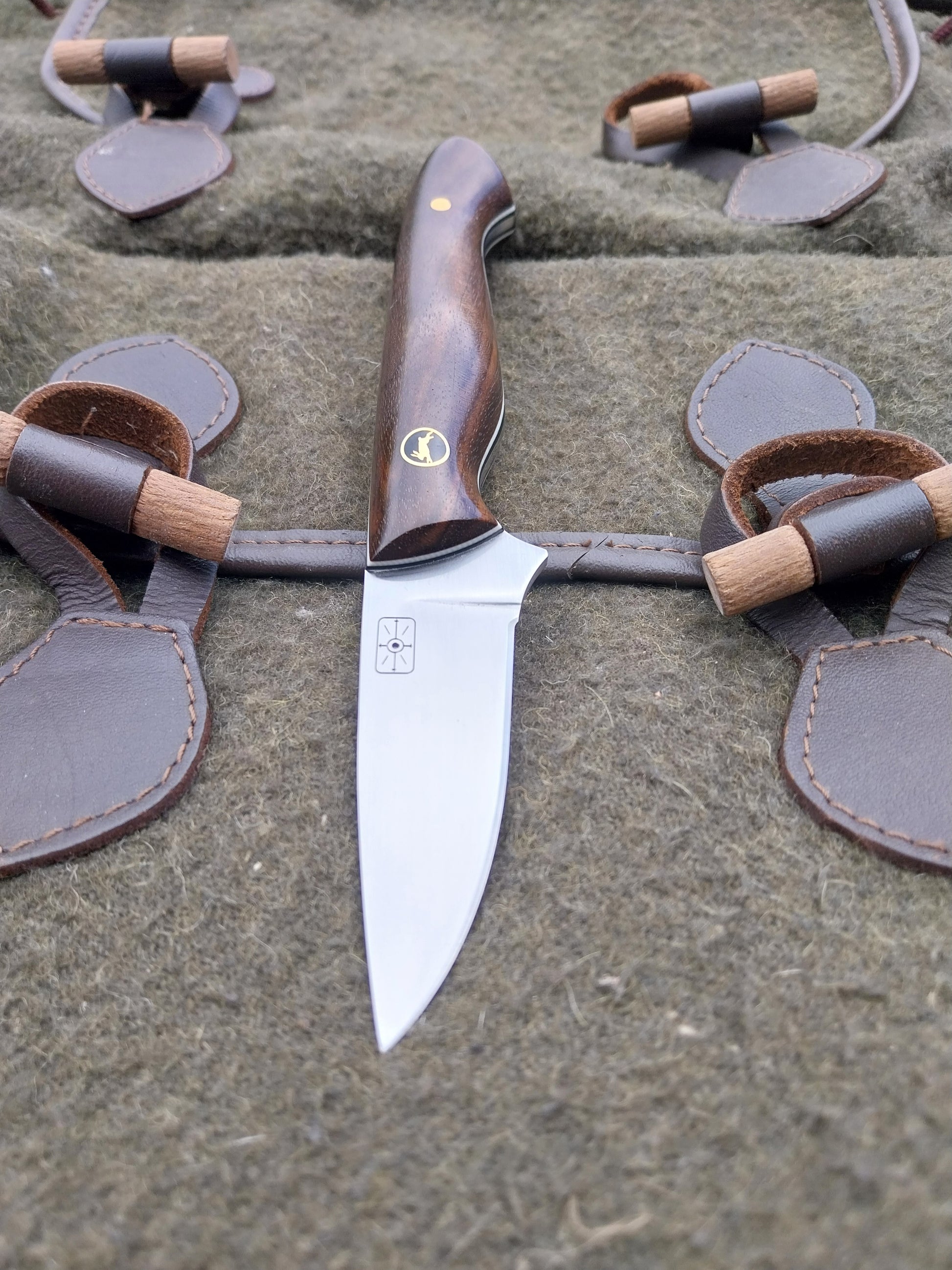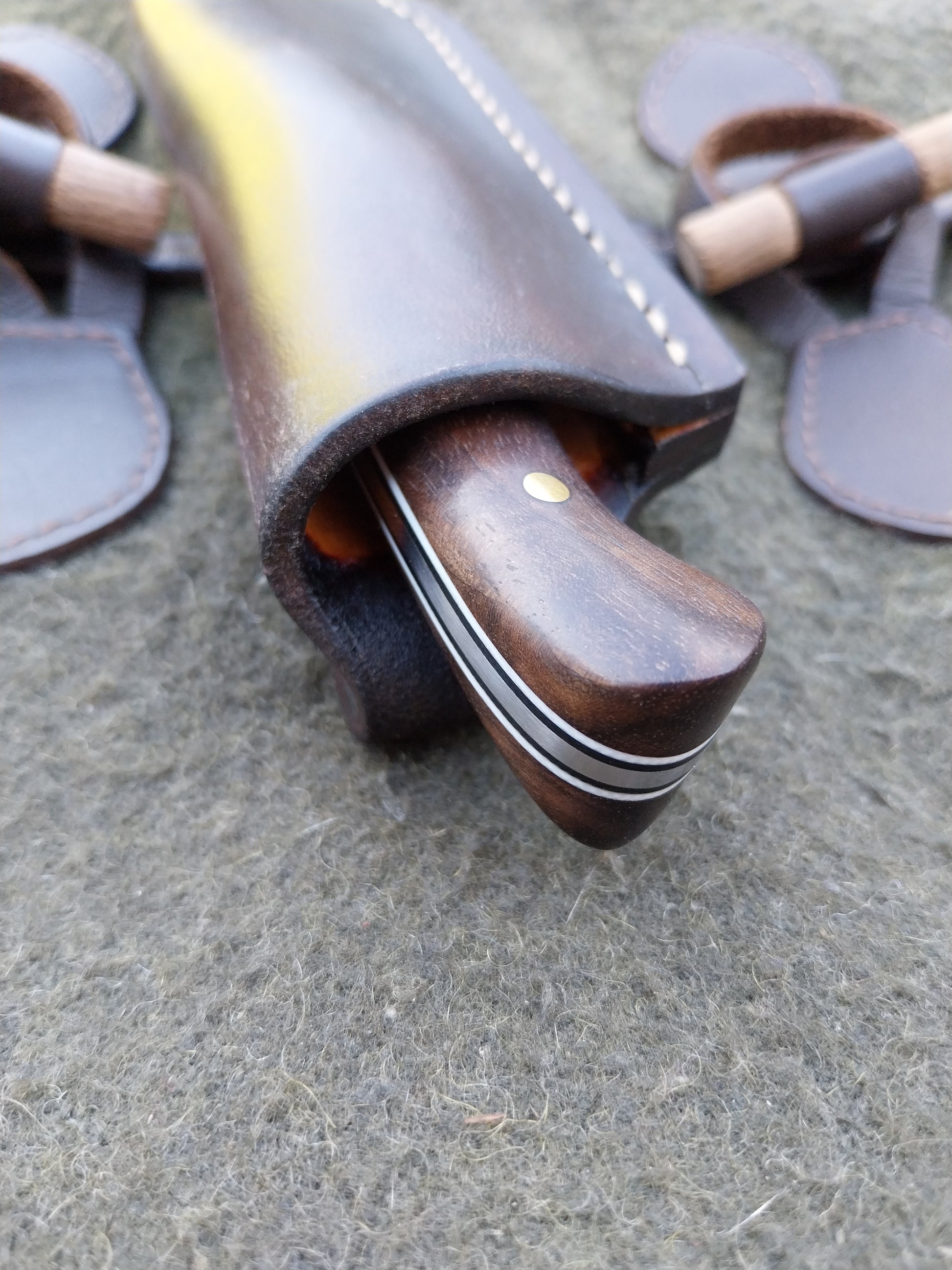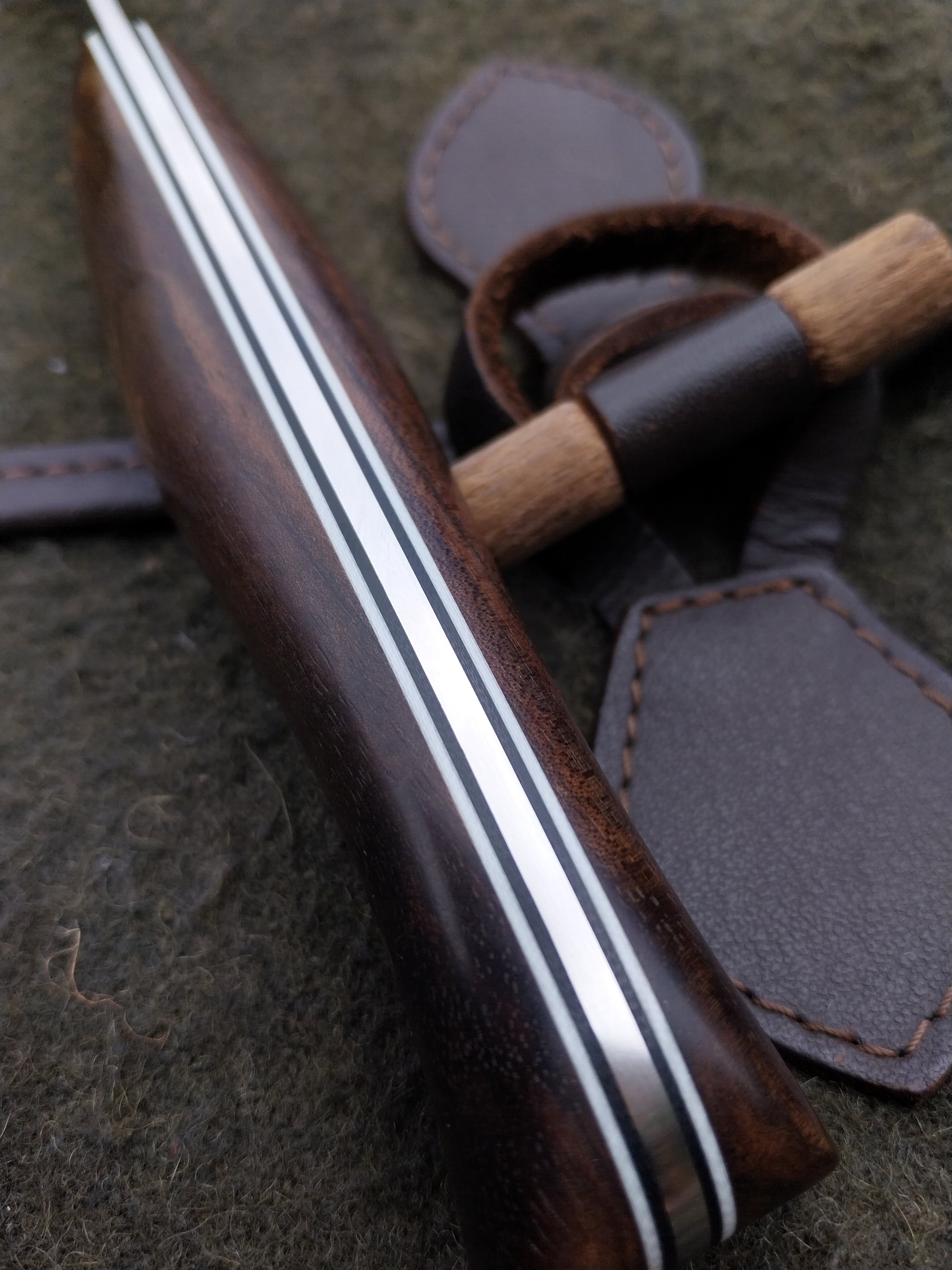 This Catcher has been fitted with stabilised Walnut Scales with black and white G10 liners. These have been fitted to the blade with a brass mosaic Hare and 4mm pin. And comes with a dark brown leather sheath with white.