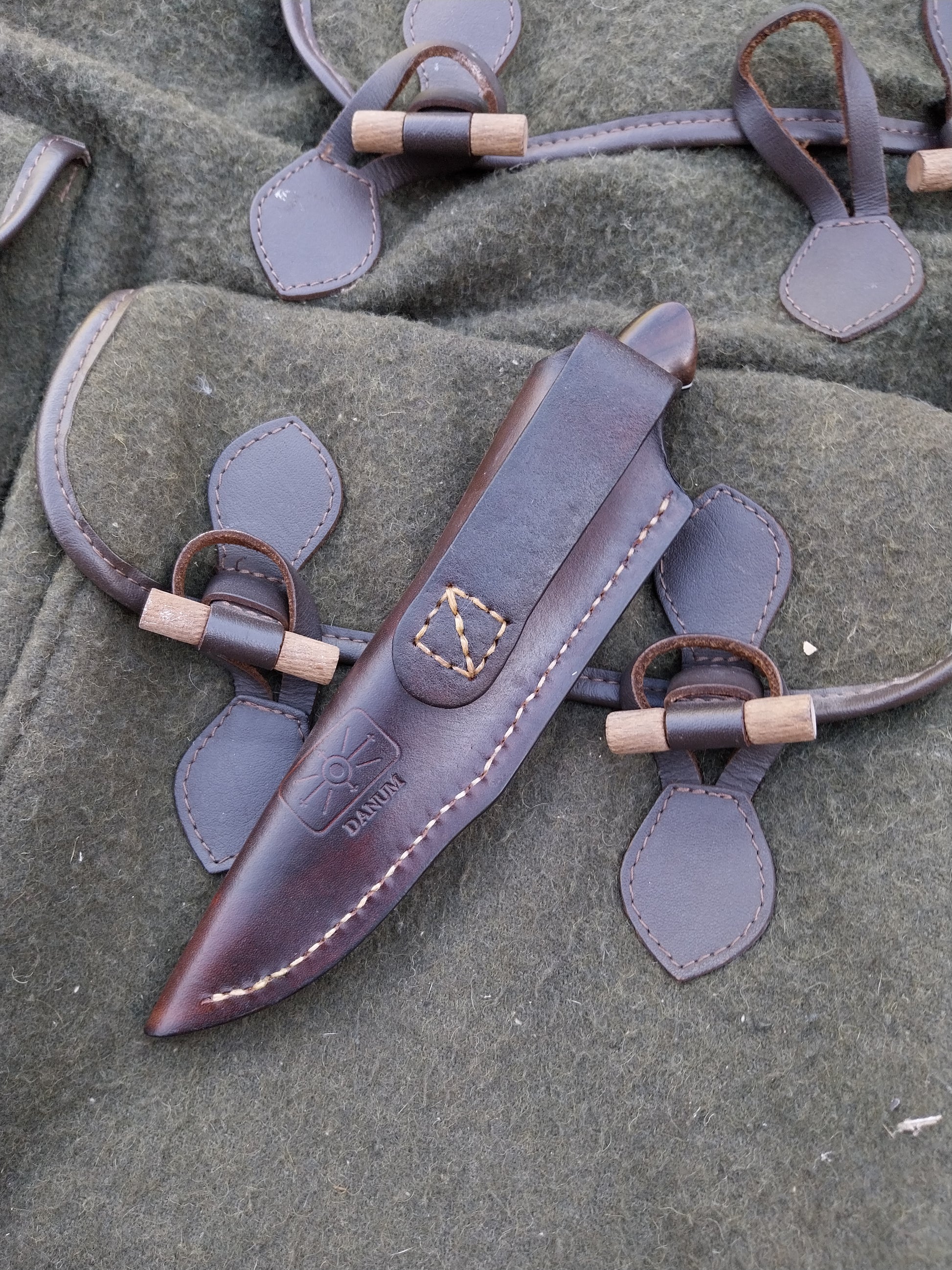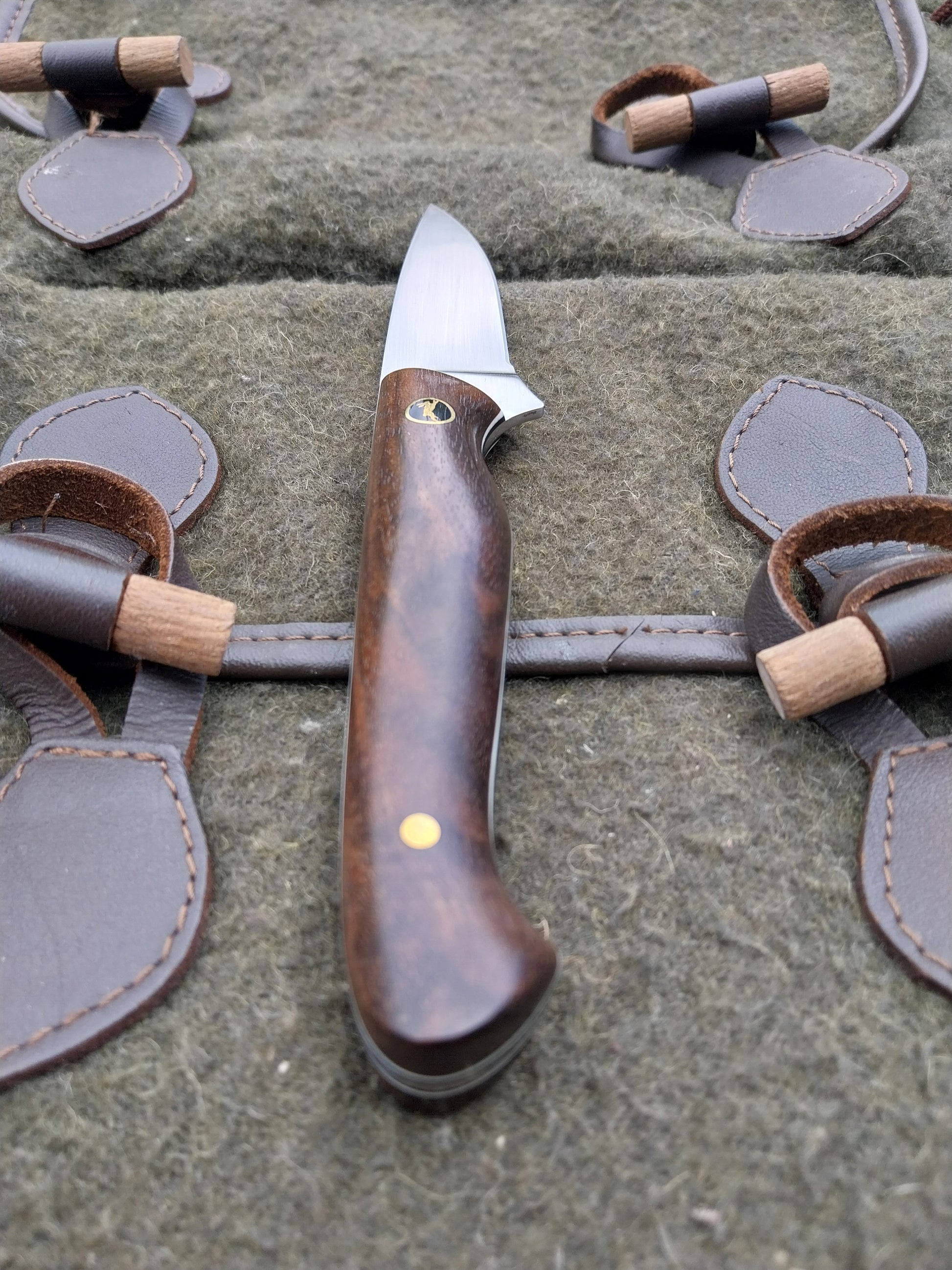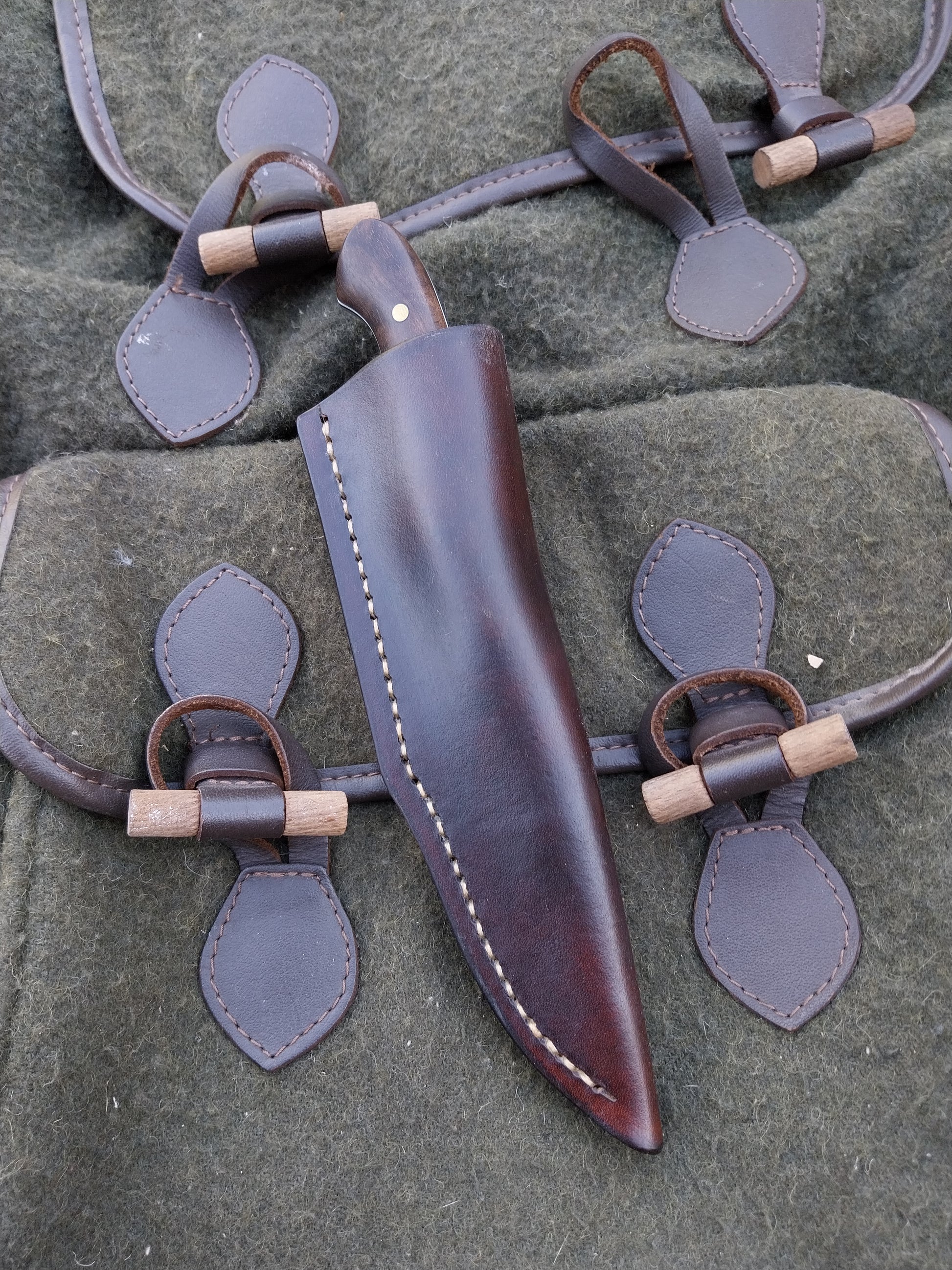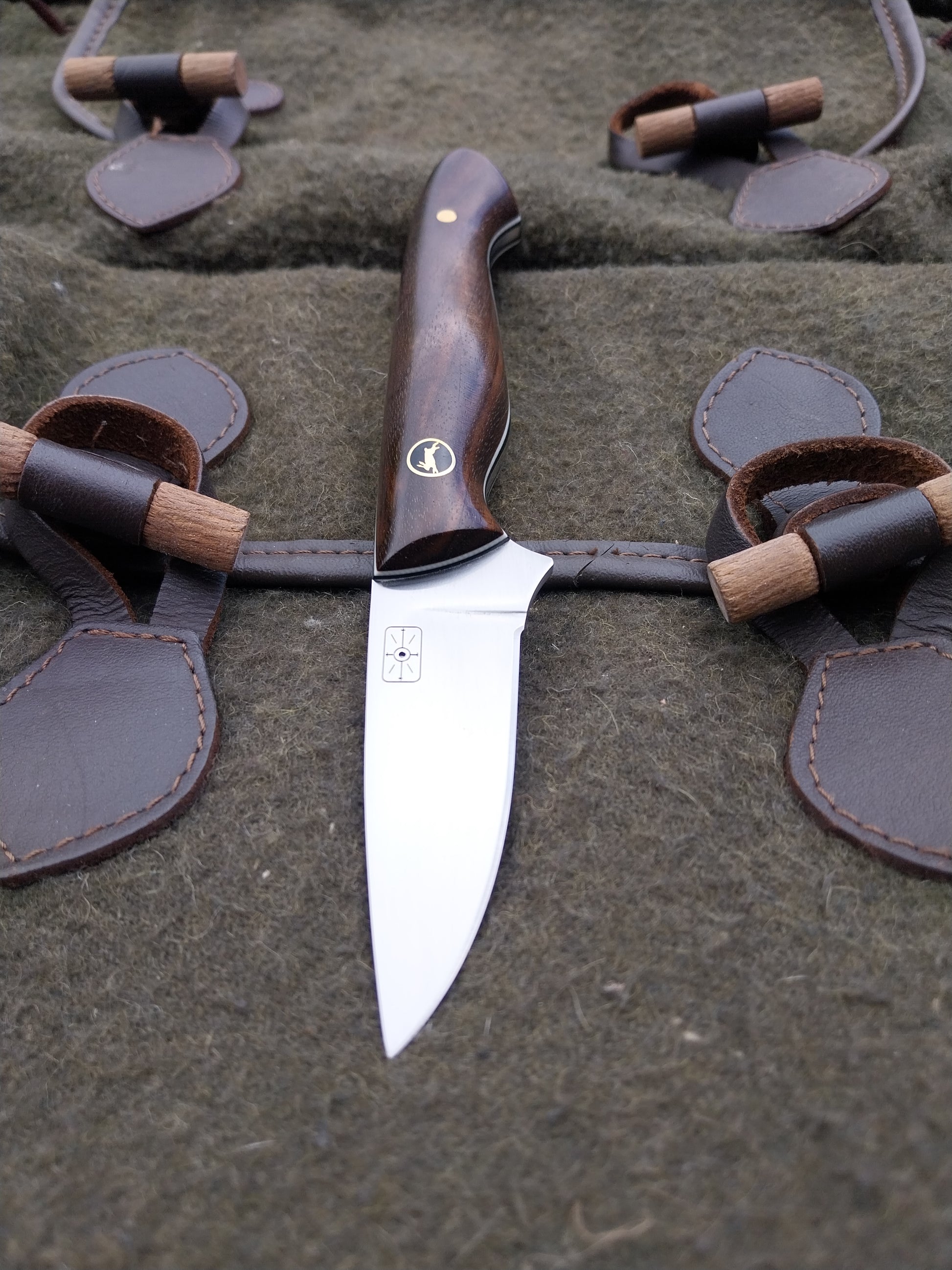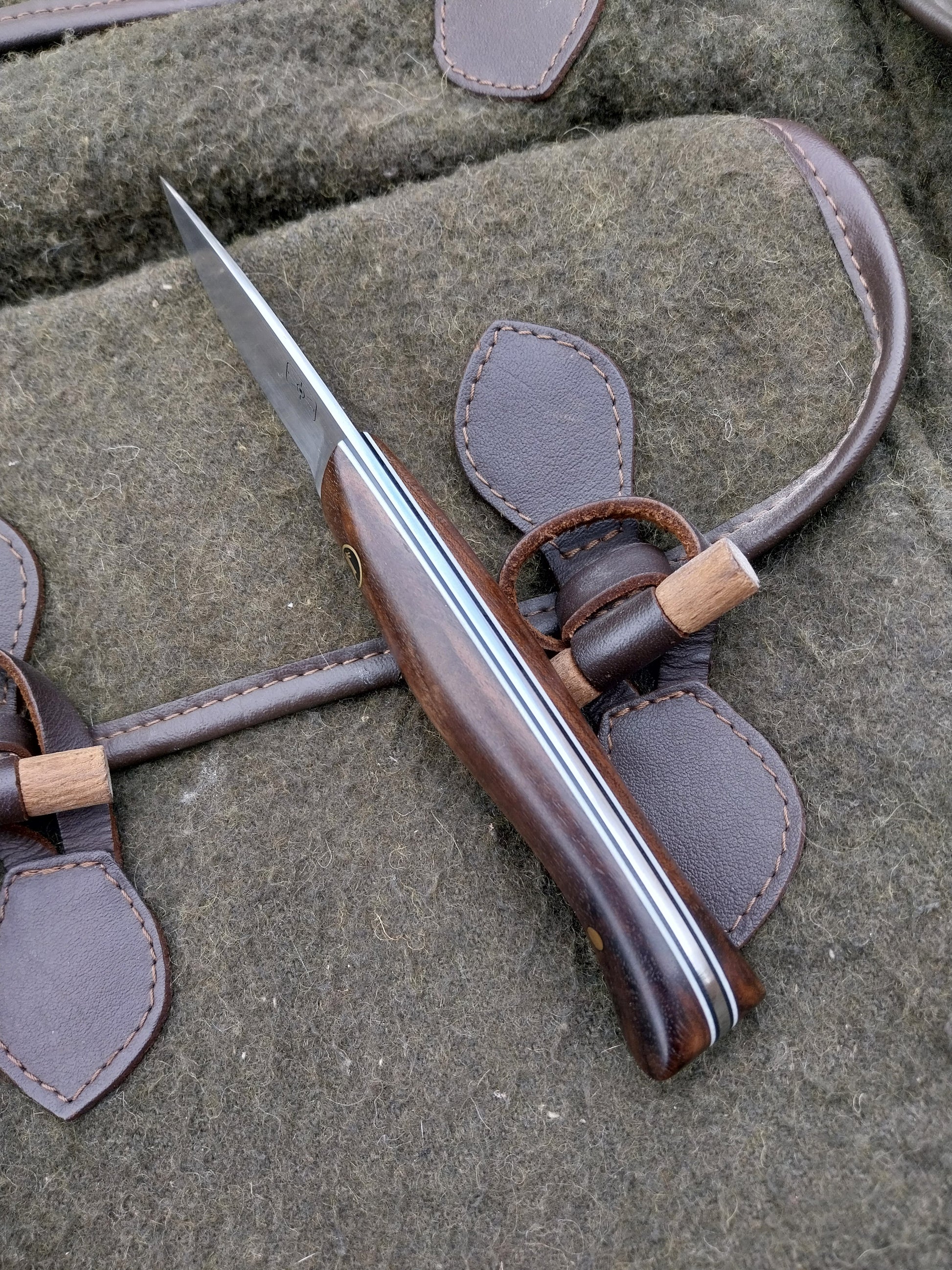 This Catcher has been fitted with stabilised Walnut Scales with black and white G10 liners. These have been fitted to the blade with a brass mosaic Hare and 4mm pin. And comes with a dark brown leather sheath with white.