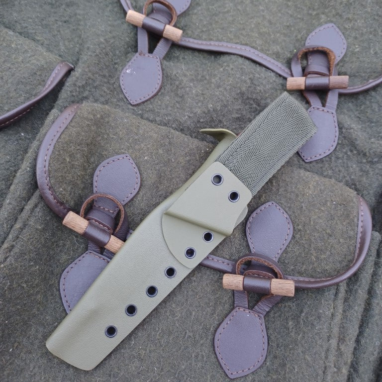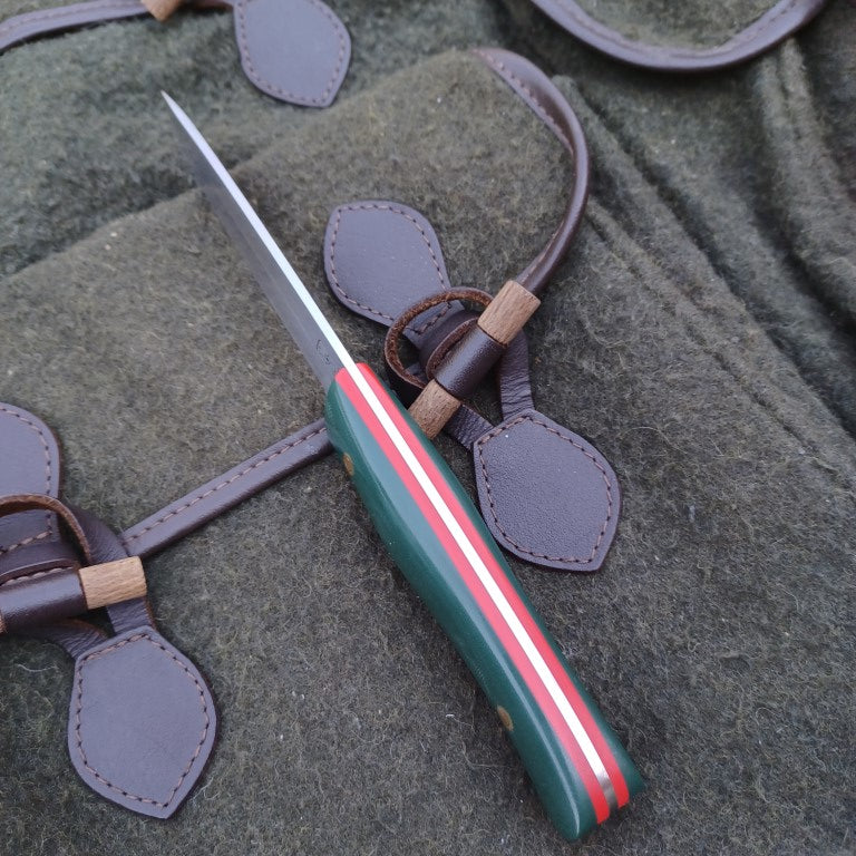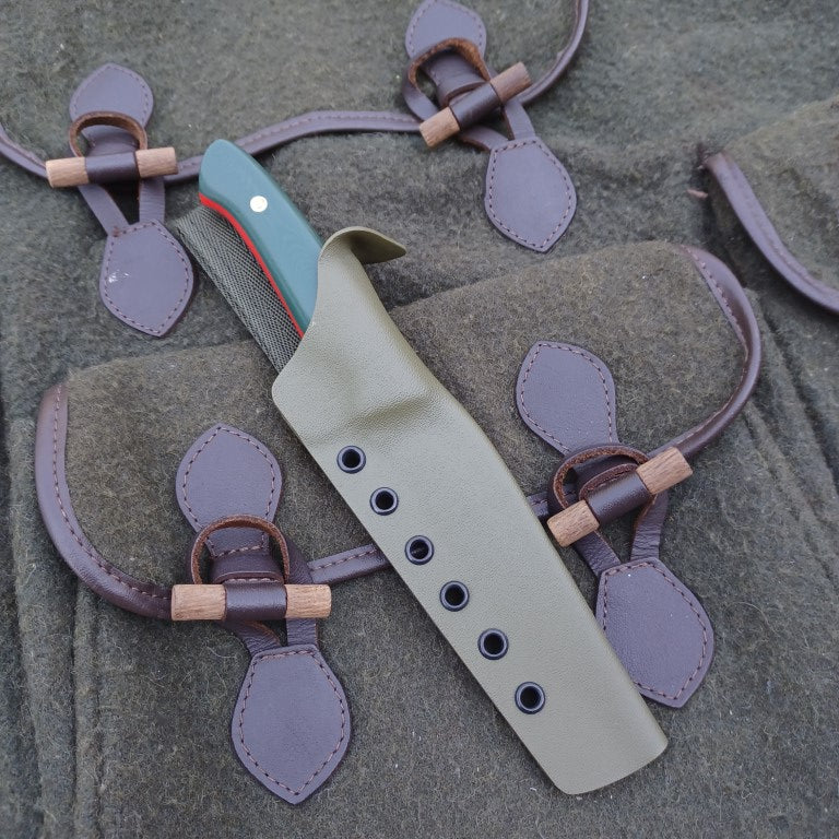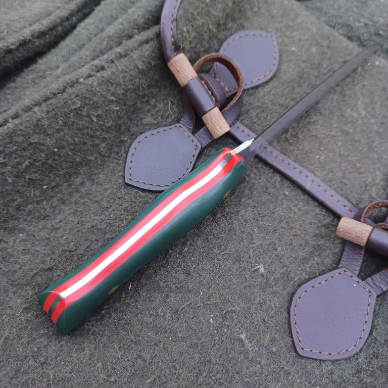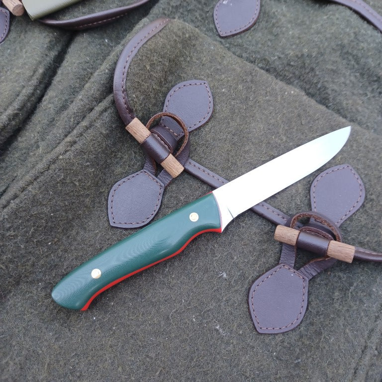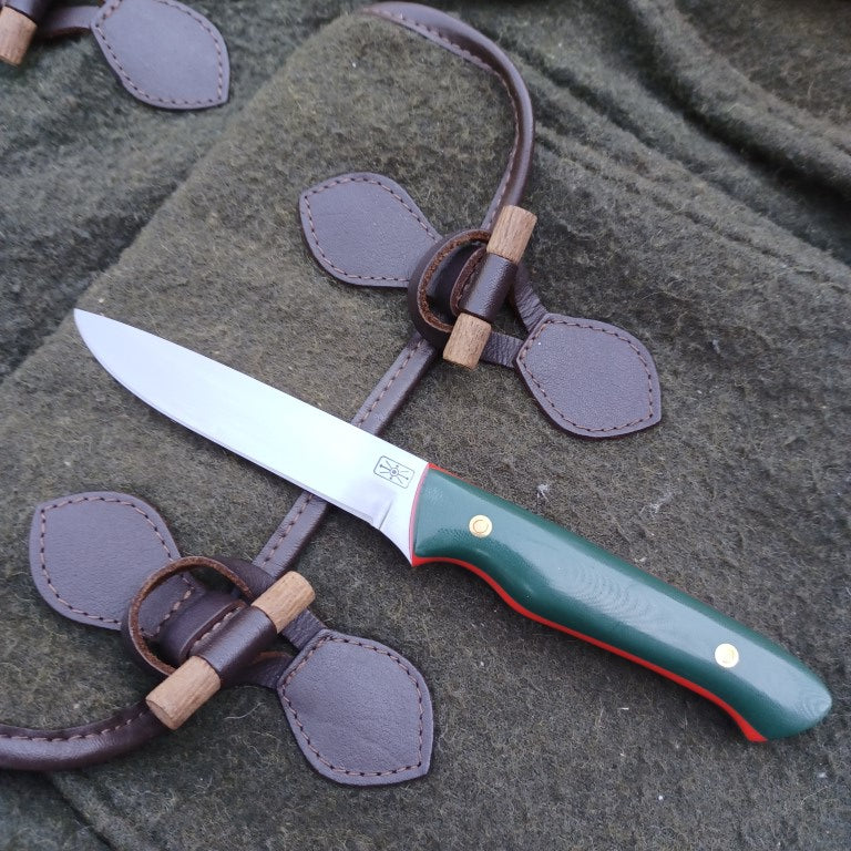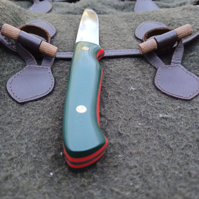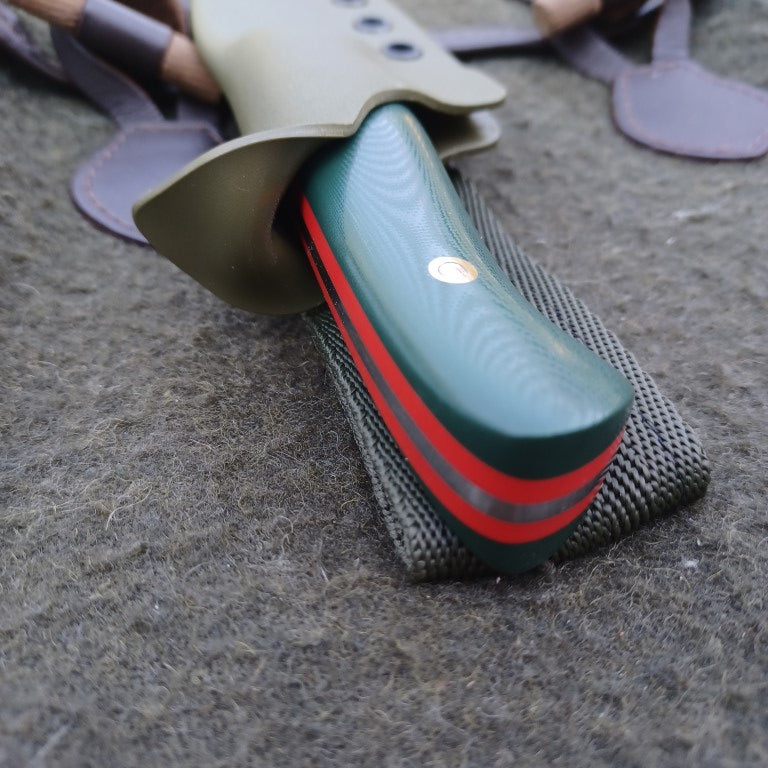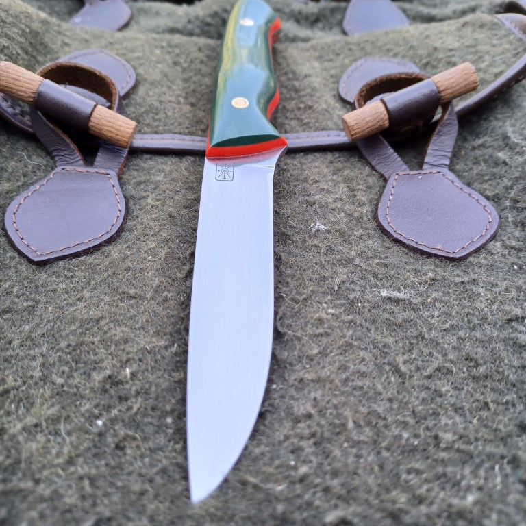 This Deer tracker knife has been fitted with Forrest green G10 scales that have been set with red G10 liners.
