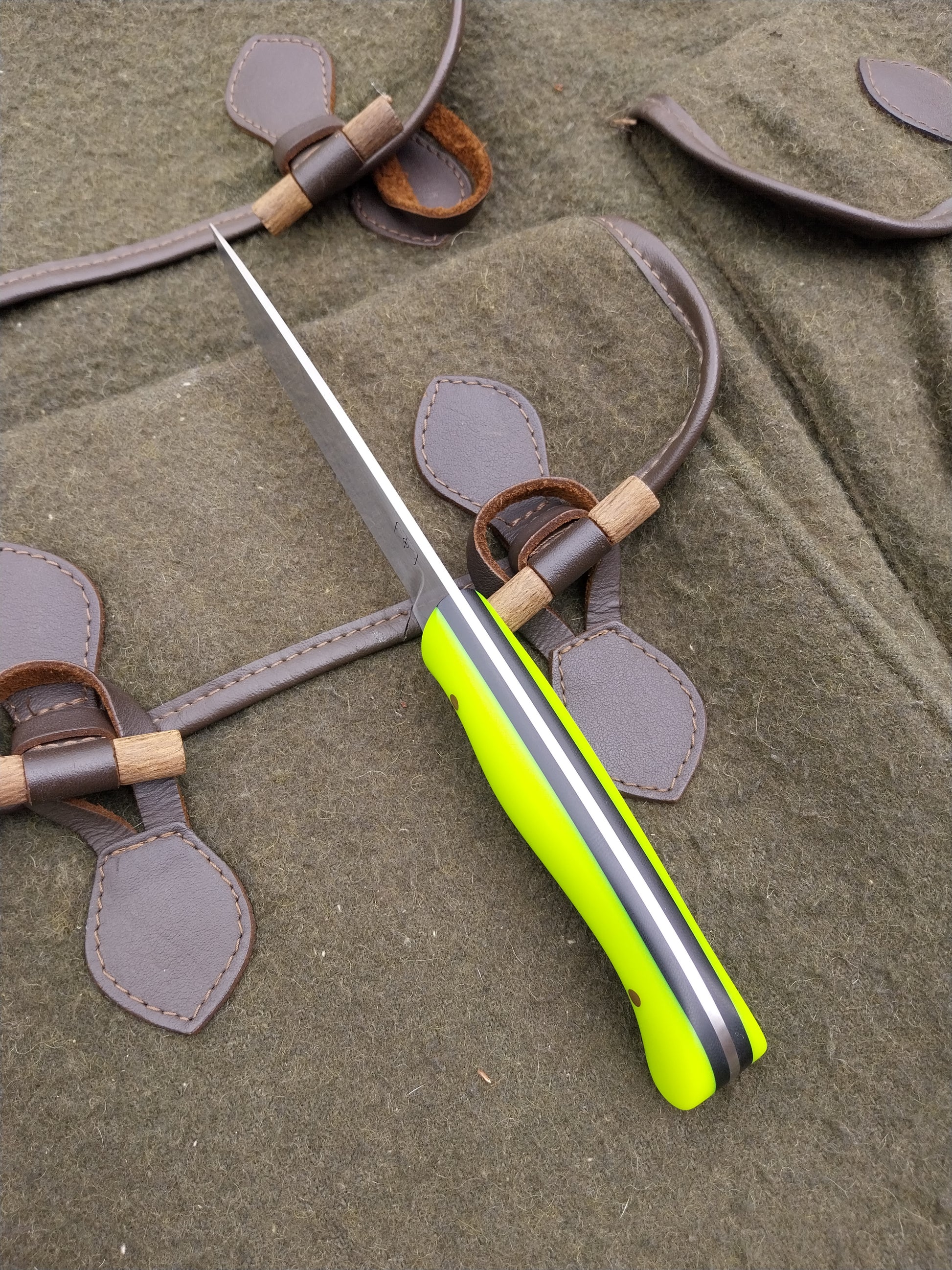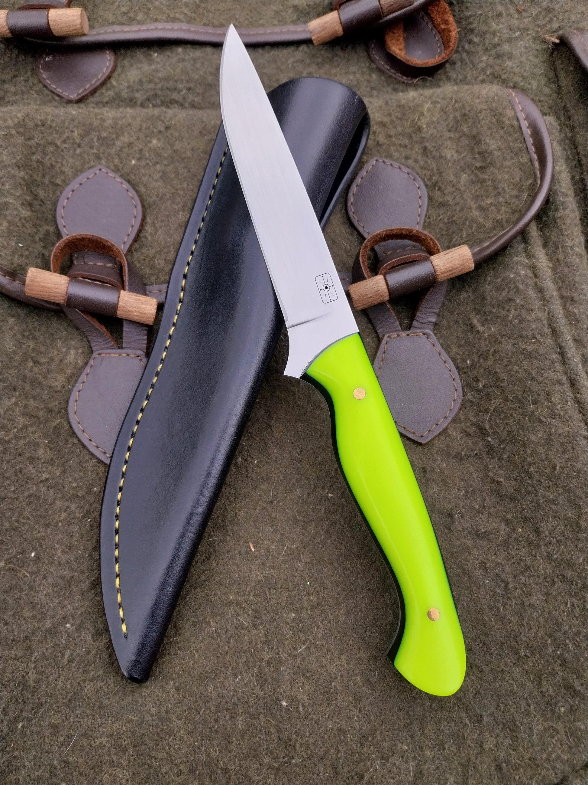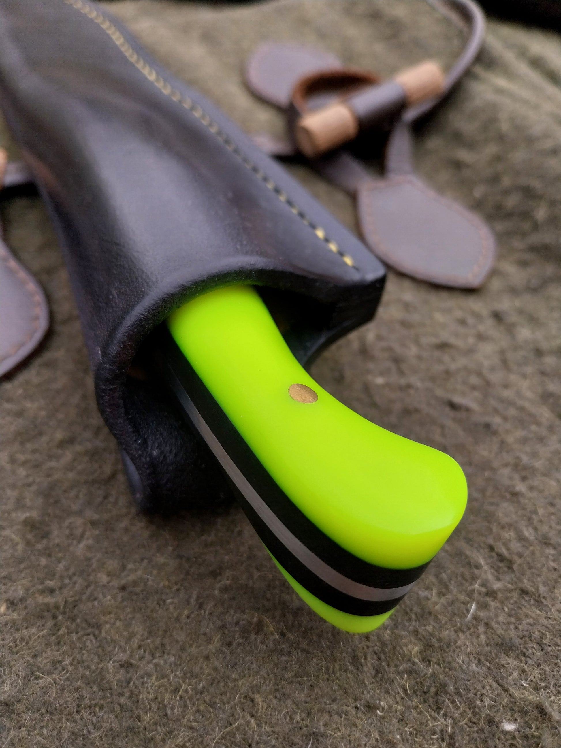 This knife has Glow in the dark Yellow TurboGlow scales with black G10 liners. Which have been fitted to the blade with brass pins. And it comes with a black veg-tan leather sheath with yellow stitching.
