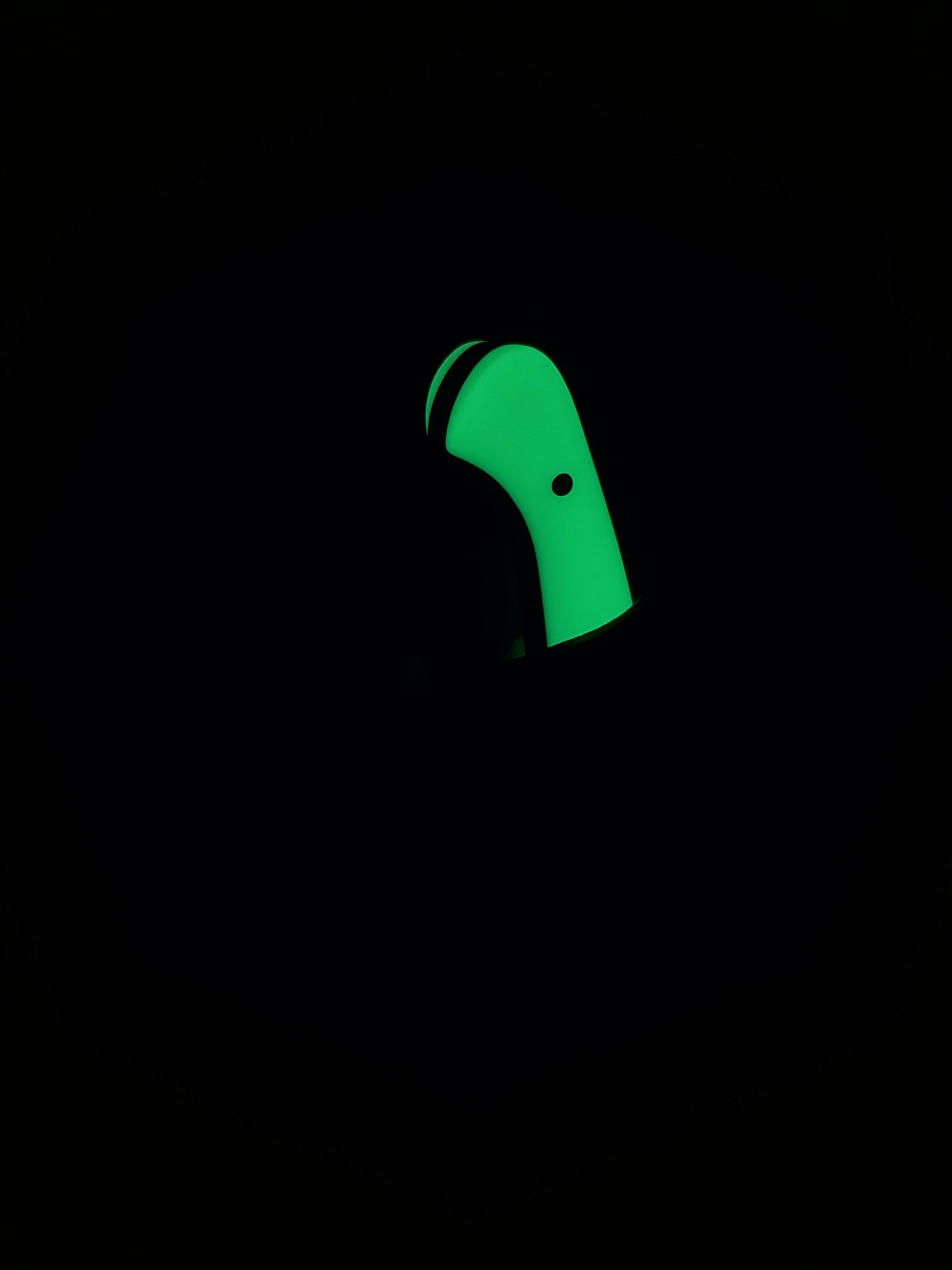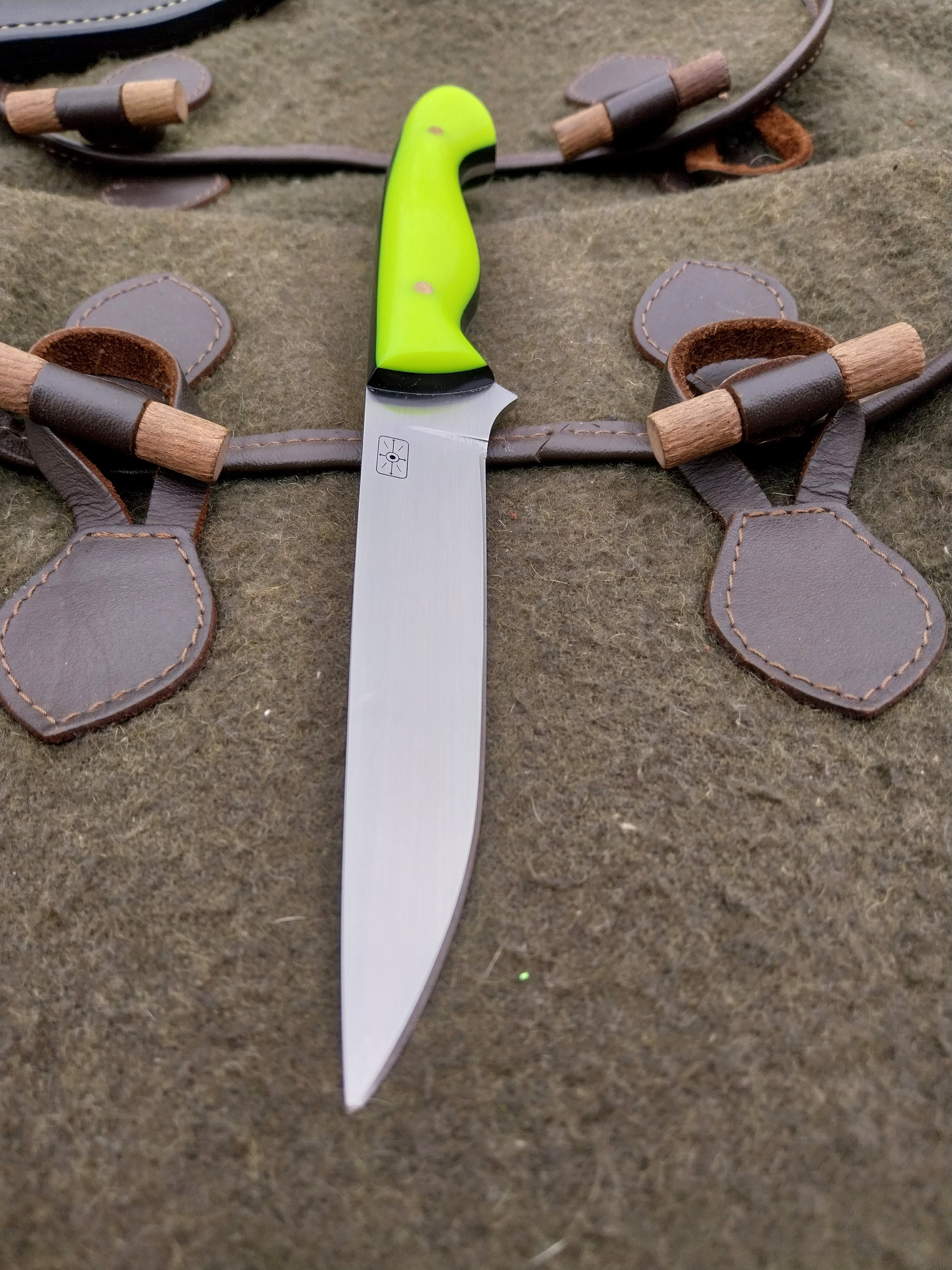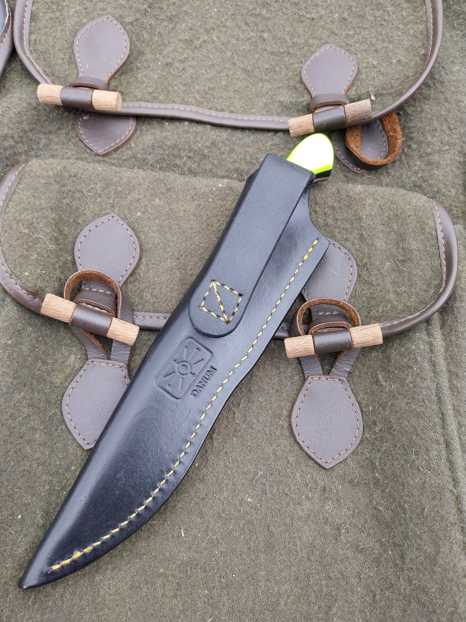 This knife has Glow in the dark Yellow TurboGlow scales with black G10 liners. Which have been fitted to the blade with brass pins. And it comes with a black veg-tan leather sheath with yellow stitching.