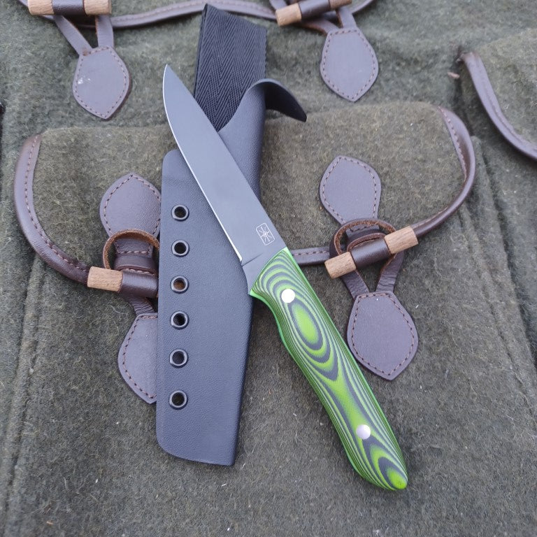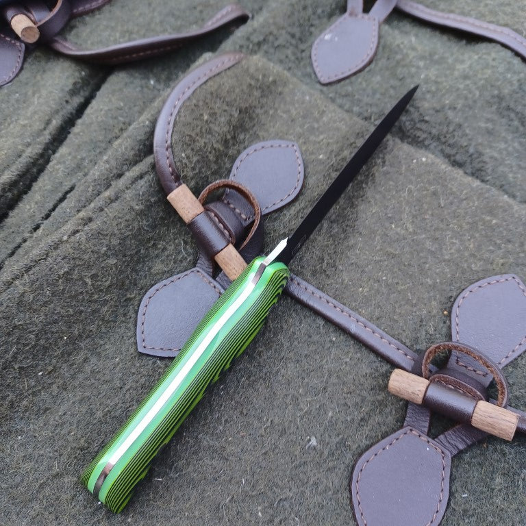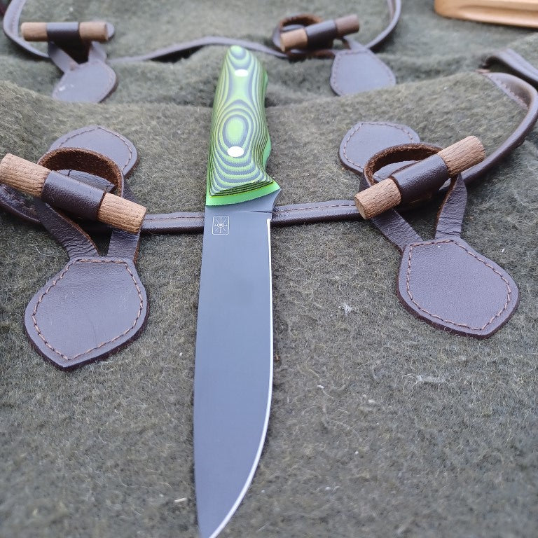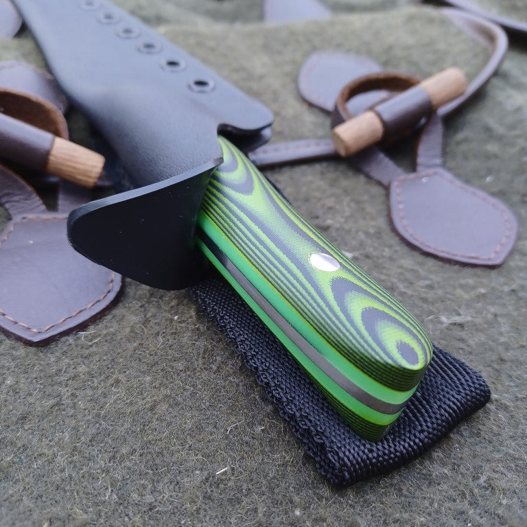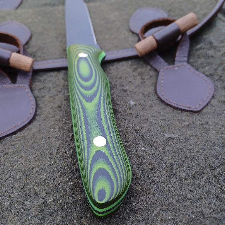 This Fallow Stalker knife it has been fitted with Green and Black suretouch G10 scales with Kirinite starlight neon glow in the dark liners. These fitted to the blade with stainless Corby bolts.