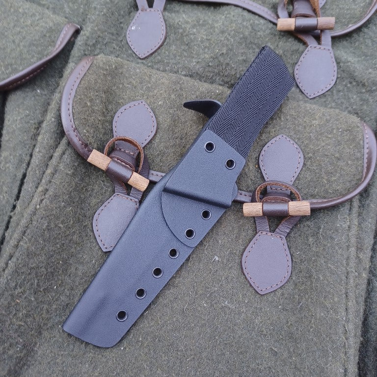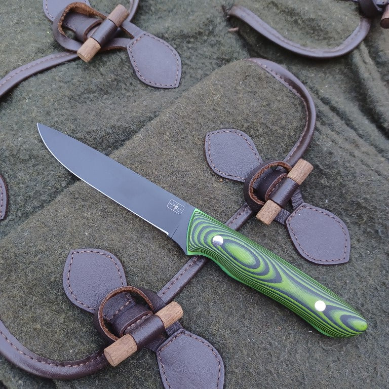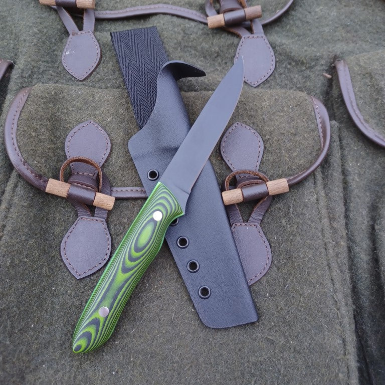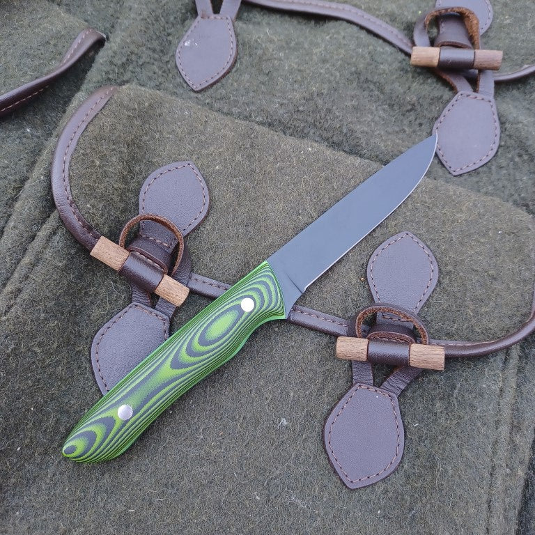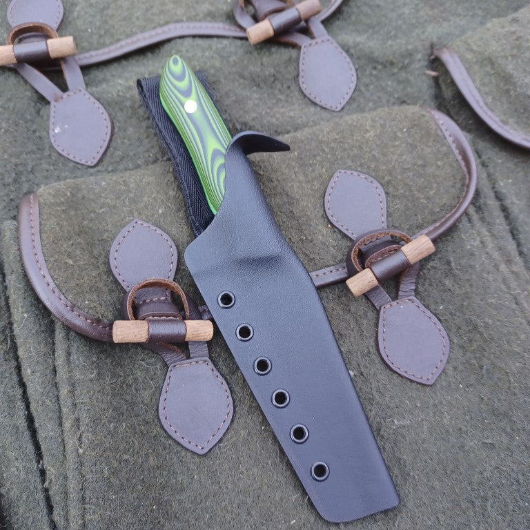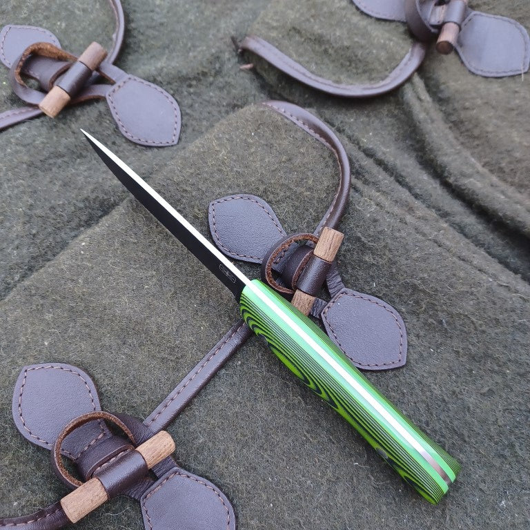 This Fallow Stalker knife it has been fitted with Green and Black suretouch G10 scales with Kirinite starlight neon glow in the dark liners. These fitted to the blade with stainless Corby bolts.