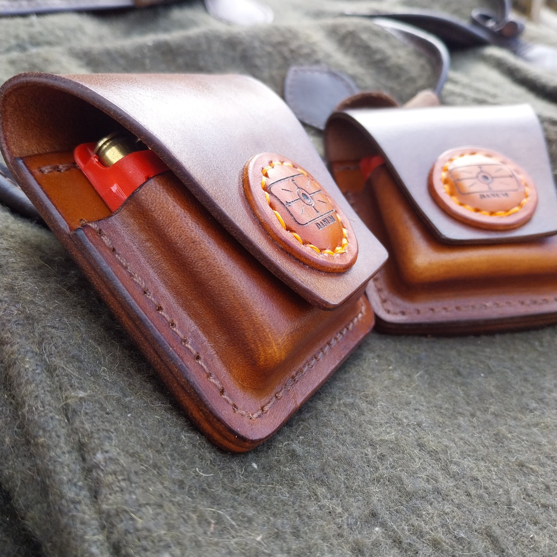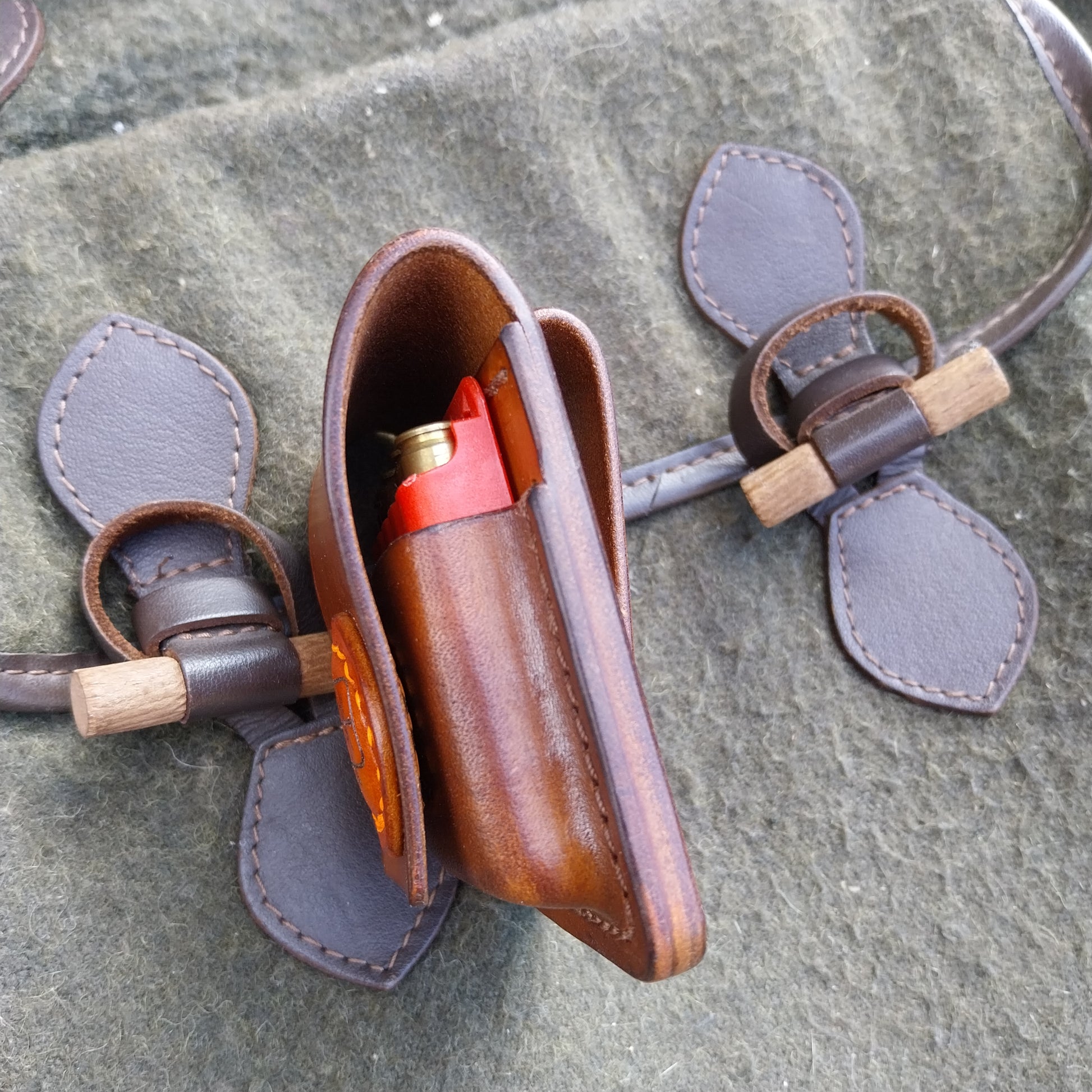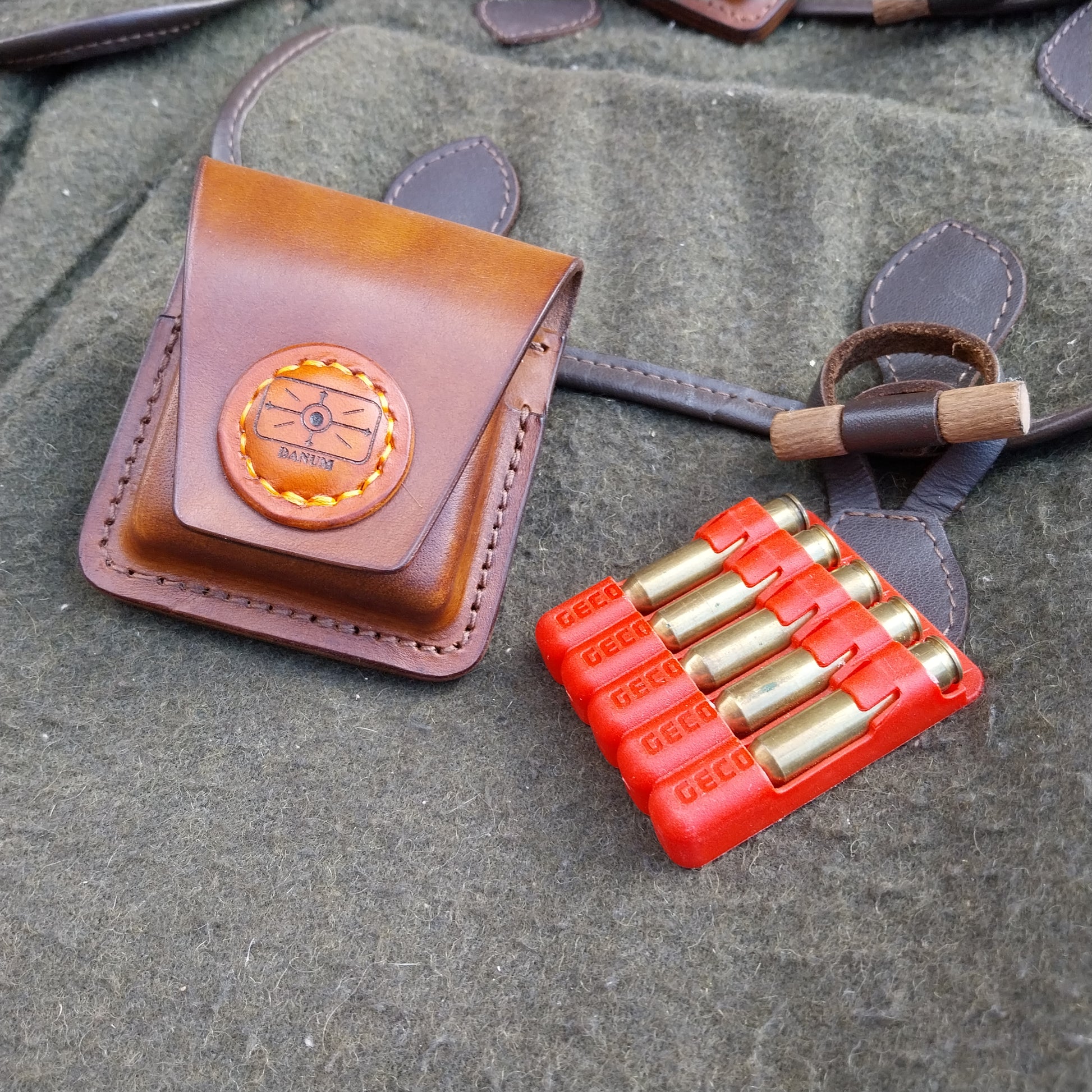 These pouches are made from natural veg-tan leather, which will fit the Geco insert that fit .222, .223 . The lid is held closed with the uses of 2 earth Magnets.