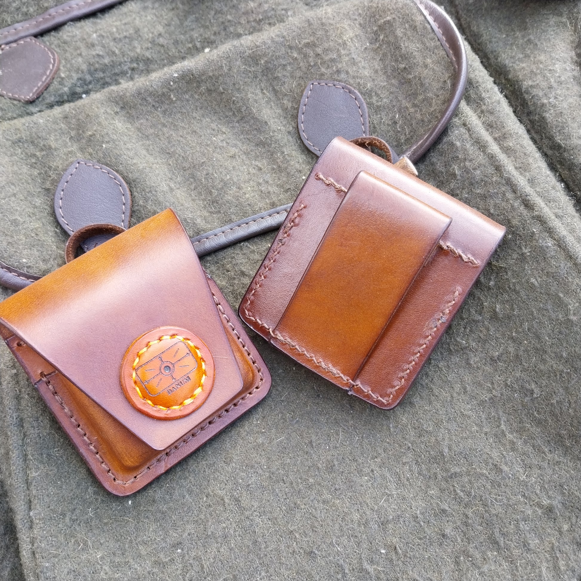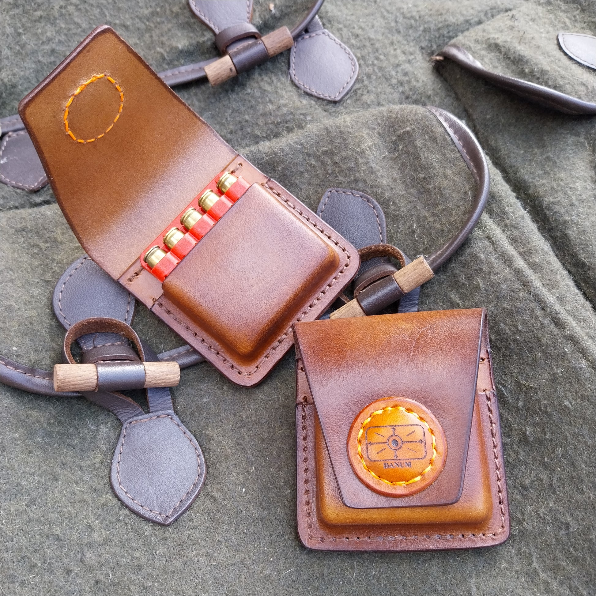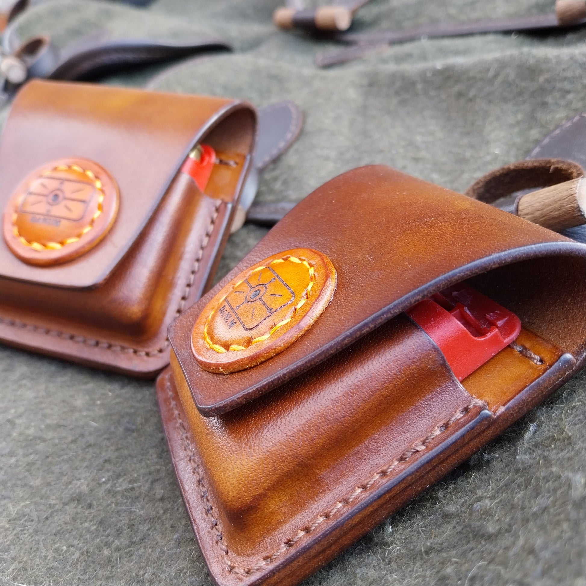 These pouches are made from natural veg-tan leather, which will fit the Geco insert that fit .222, .223 . The lid is held closed with the uses of 2 earth Magnets.