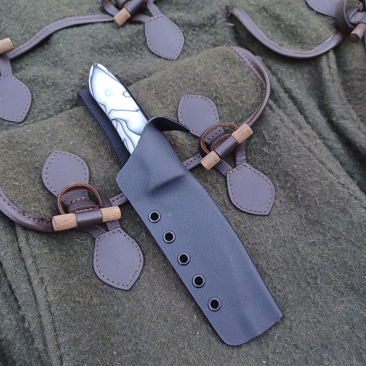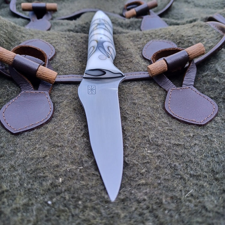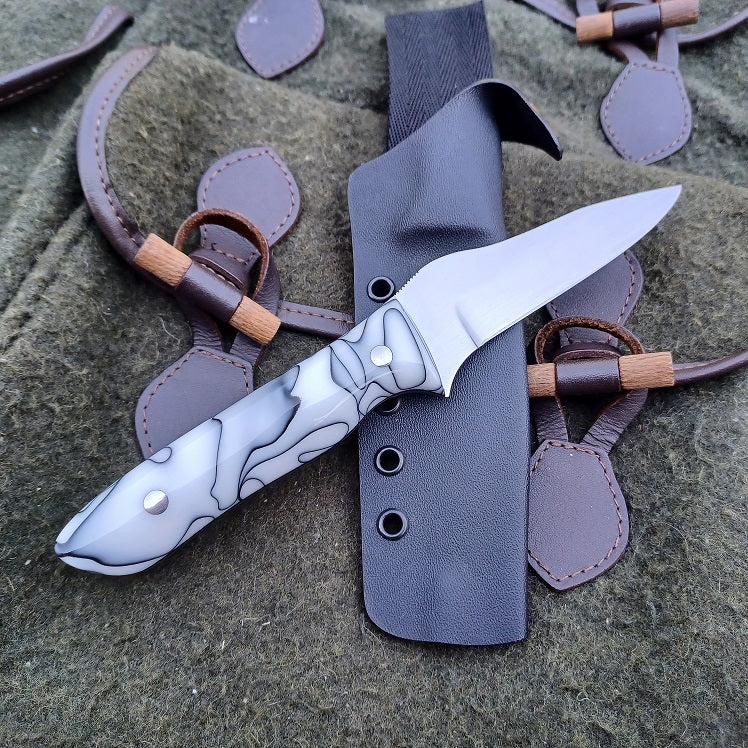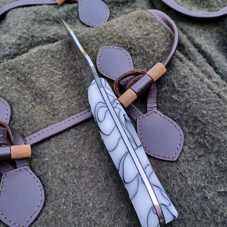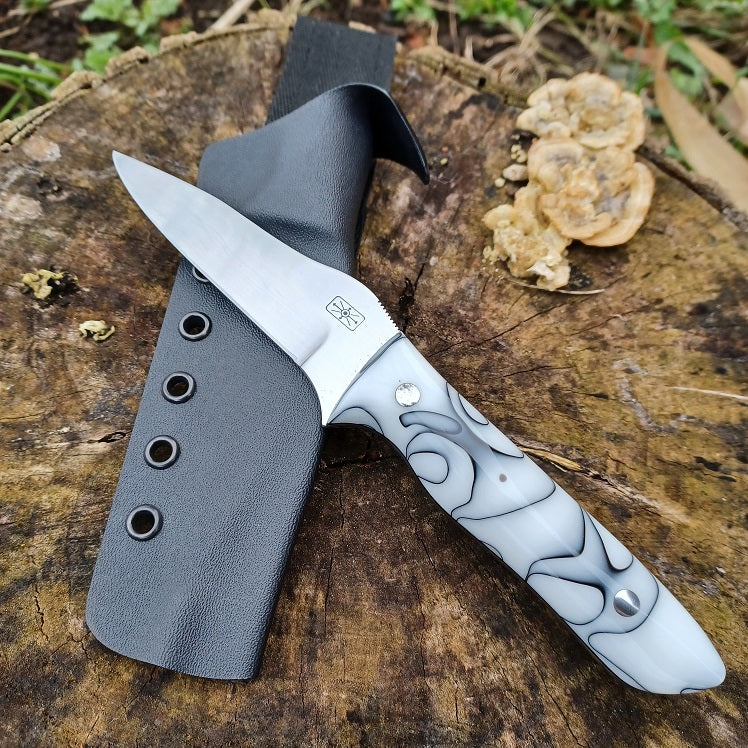 This is a Danum Blades Mulgrave knife it has been fitted with White and Black acrylic scales, these have been set with black G10 liners and fitted to the blade with stainless corby bolts
