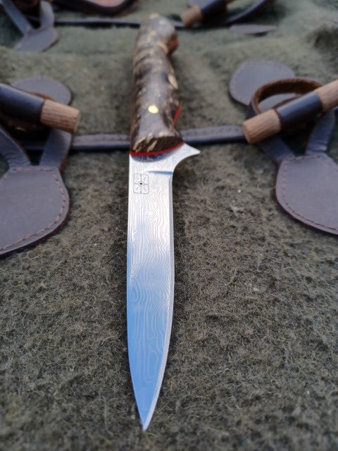 This Muntjac Catcher has been fitted with Dyed maple scales with red G10 liners. These have been fitted to the blade with brass pins. And comes with a "Kybrid" (Leather and kydex hybrid) sheath.