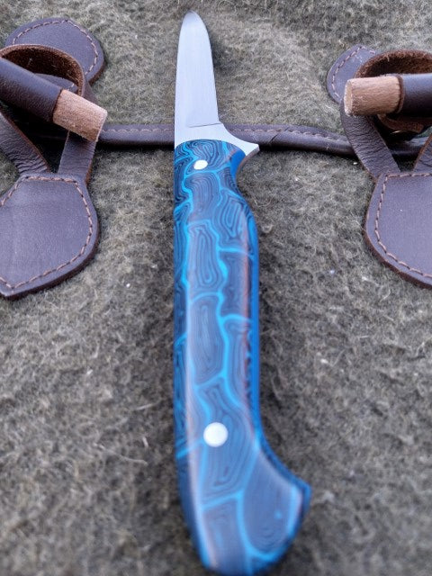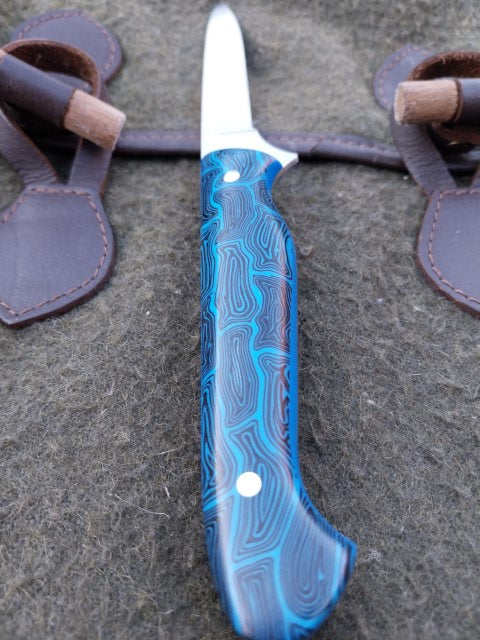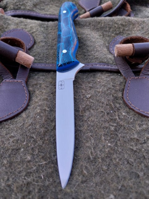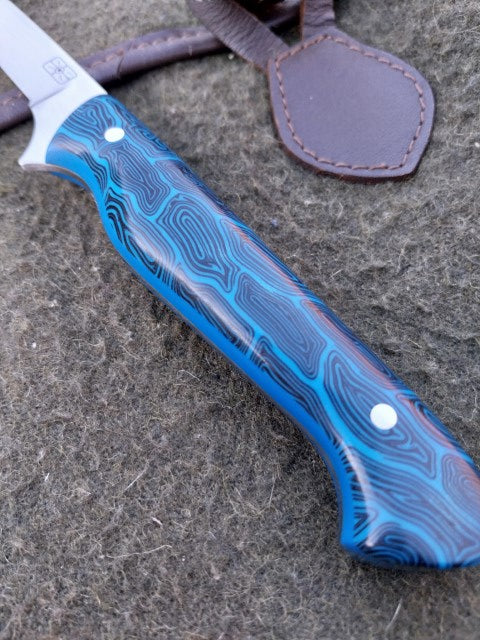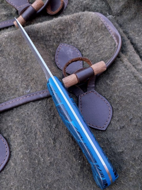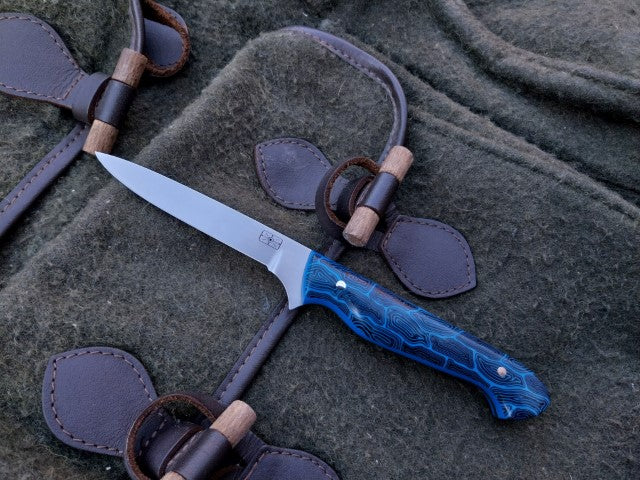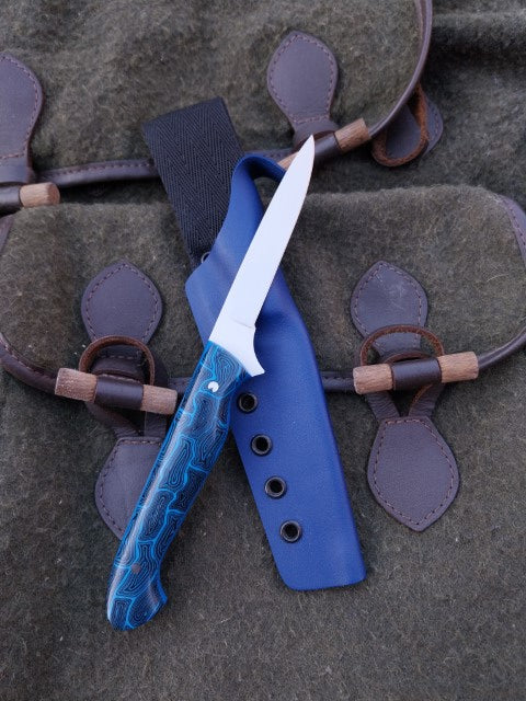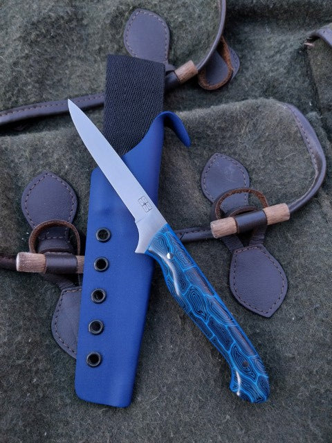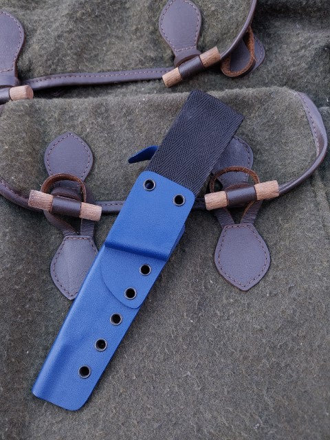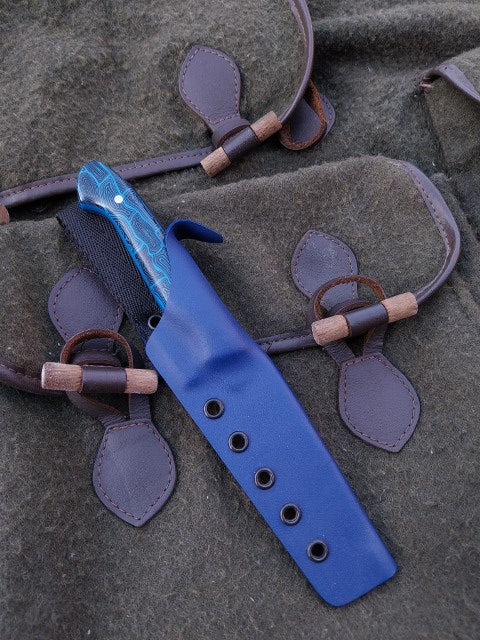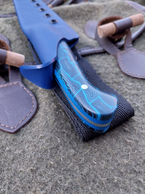 This Muntjac Catcher has been fitted with Black and Blue G10 scales with Blue G10 liners. Which have been fitted to the blade with stainless pins. And comes with a blue kydex sheath.