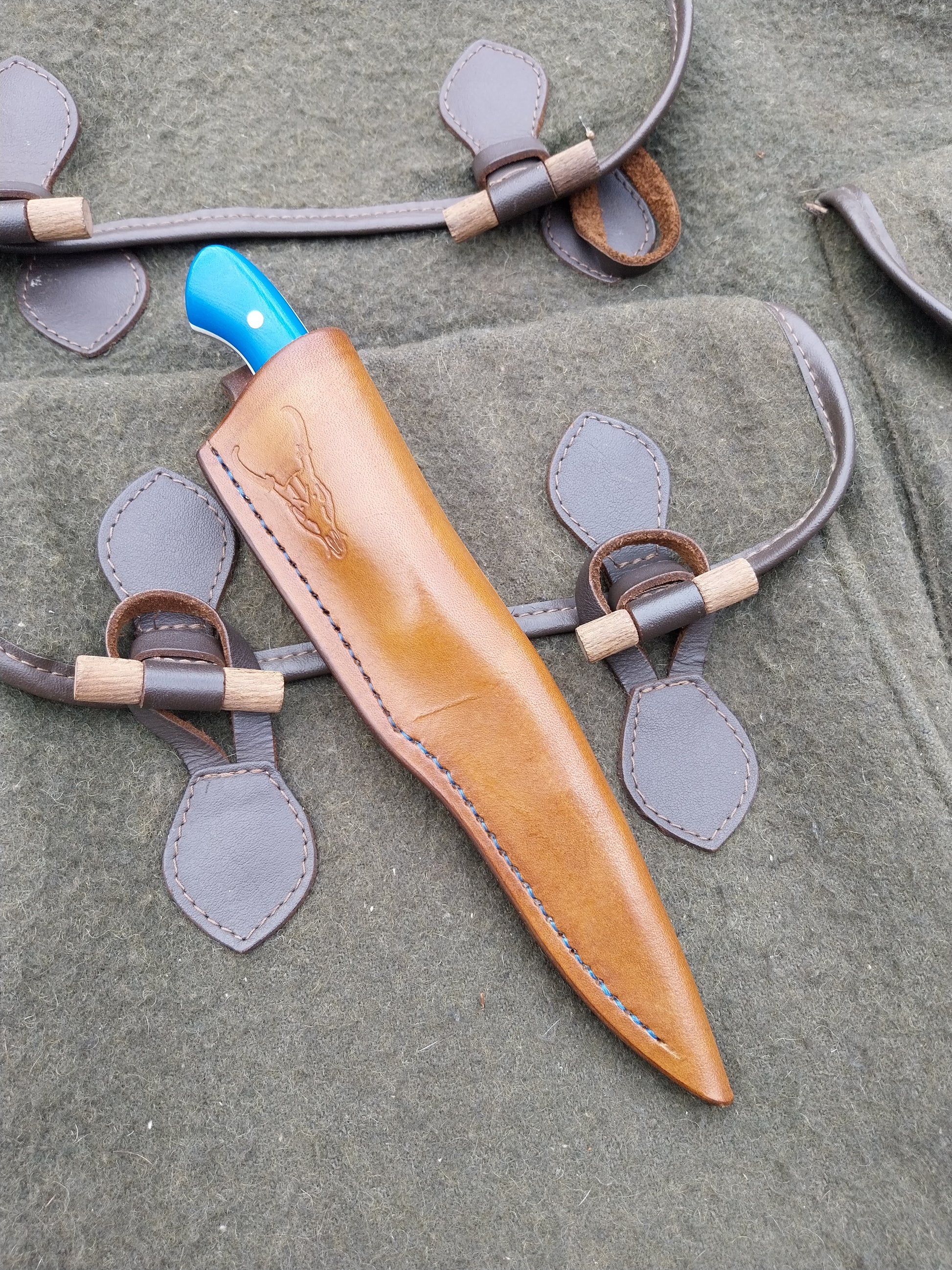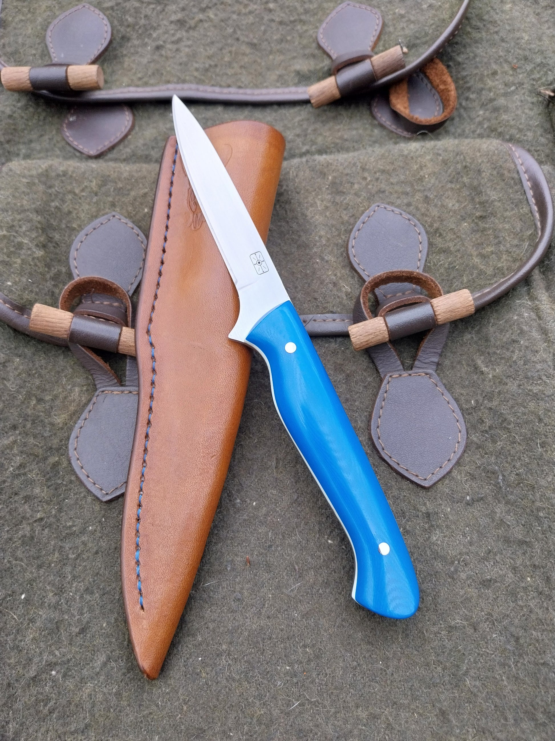 This Muntjac Catcher has been fitted withBlues G10 scales with White liners. Which have been fitted to the blade with stainless pins. And comes with a classic leather sheath.