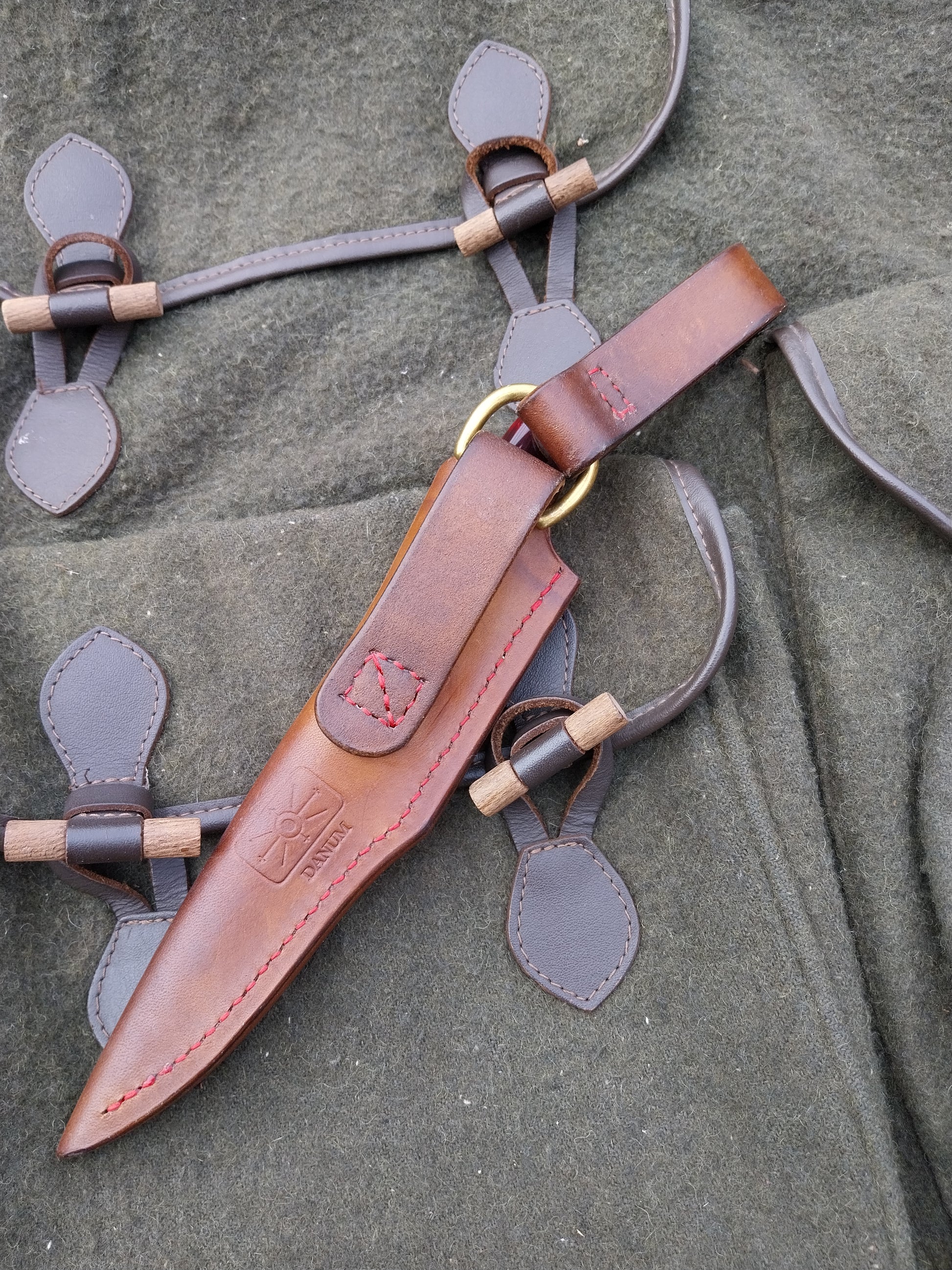 This Muntjac Catcher has been fitted with hybris stabilised Californian Buckeye burl and dark red resin scales. Which have been fitted to the blade with a brass mosaic Muntjac skull and 4mm brass pin. It comes with a walnat brown dyed veg-tan leather sheath with red stitching and a drop dangler belt loop