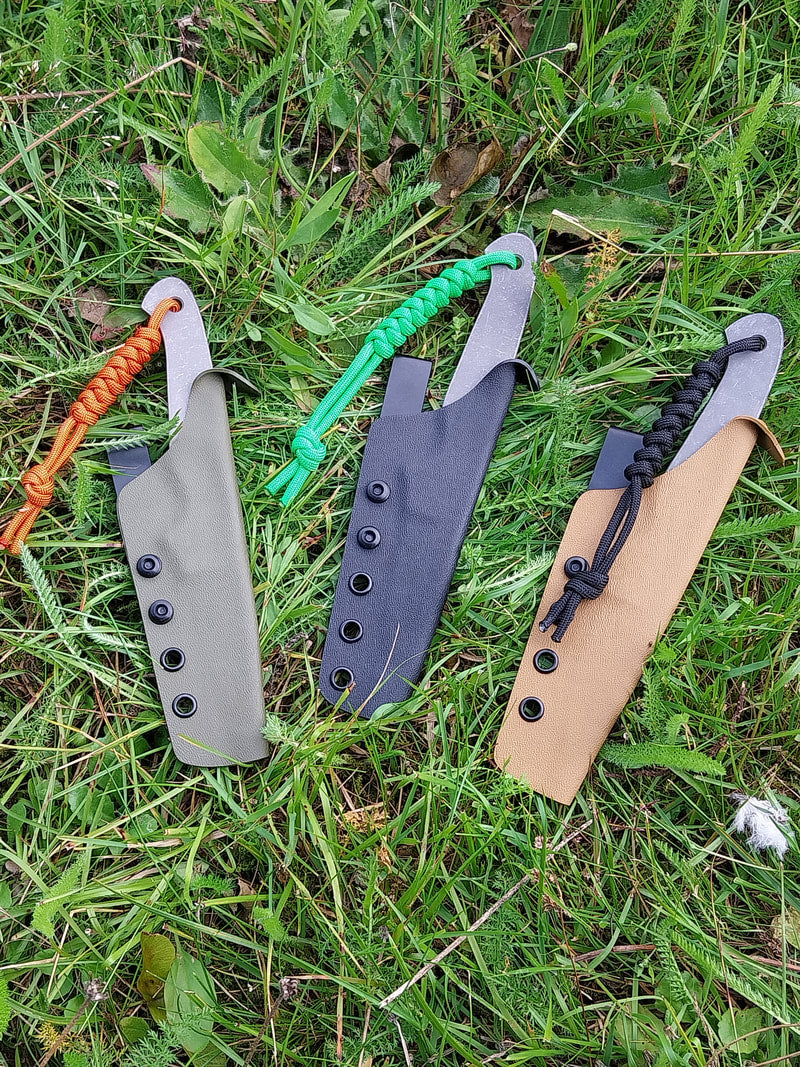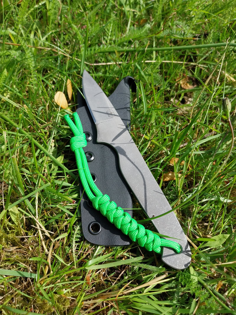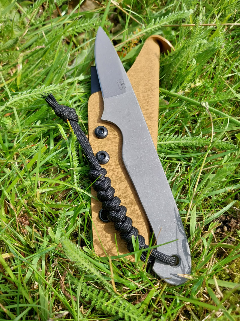 The knife has been acid etched and stone washed with rounded edges to make it comfortable in the hand and has a lanyard added. The sheath is a folded kydex design with a metal belt clip.