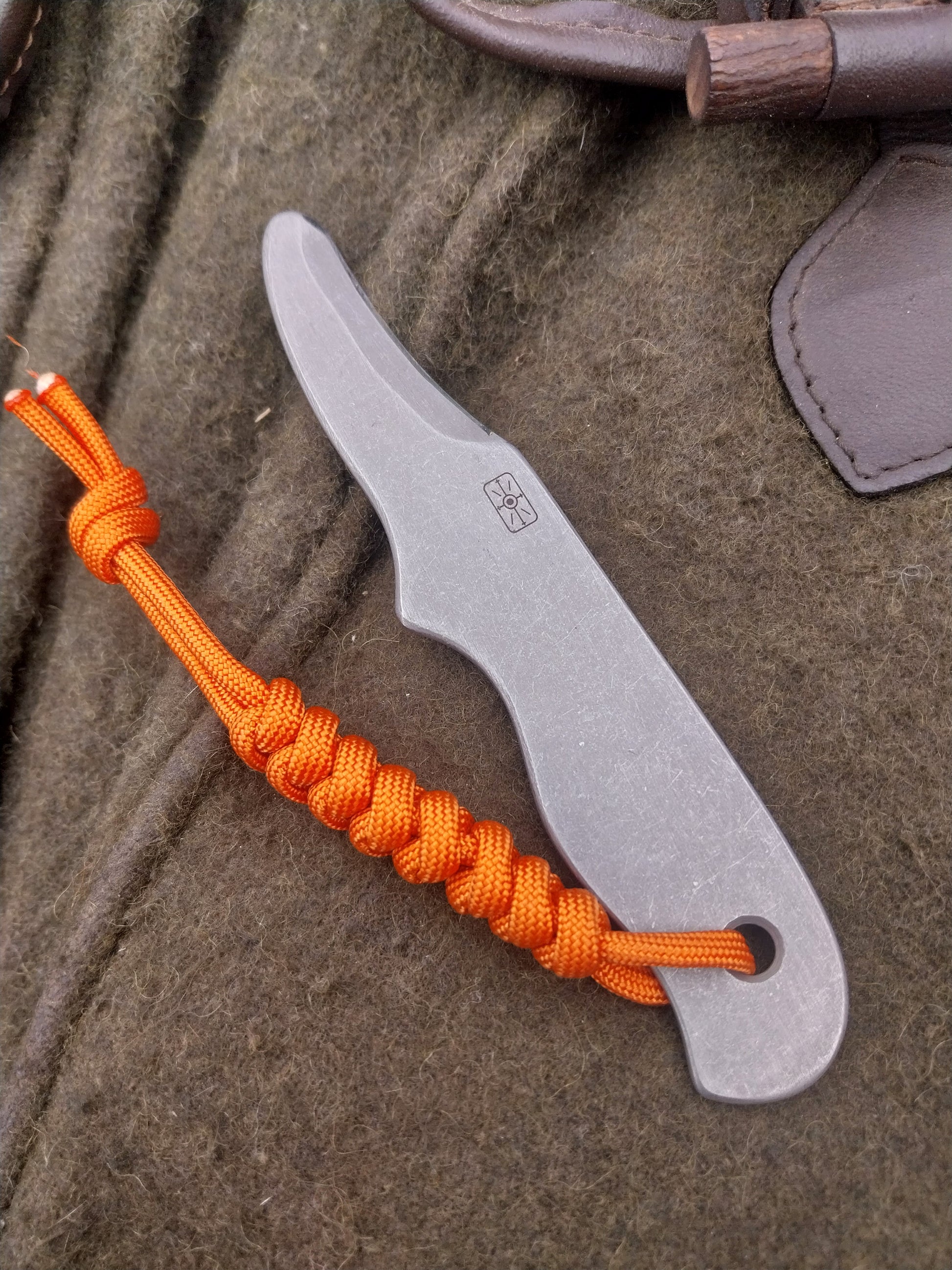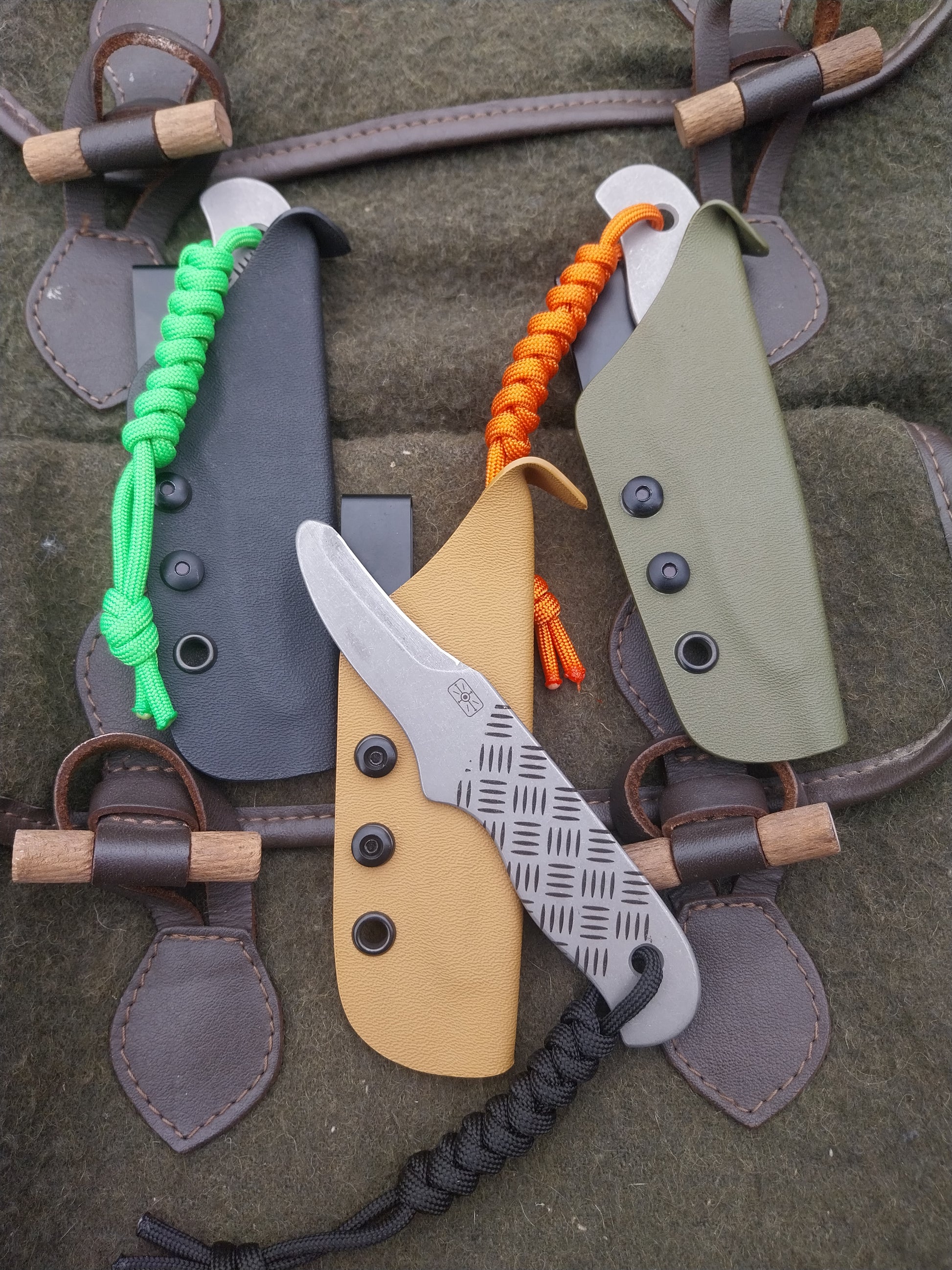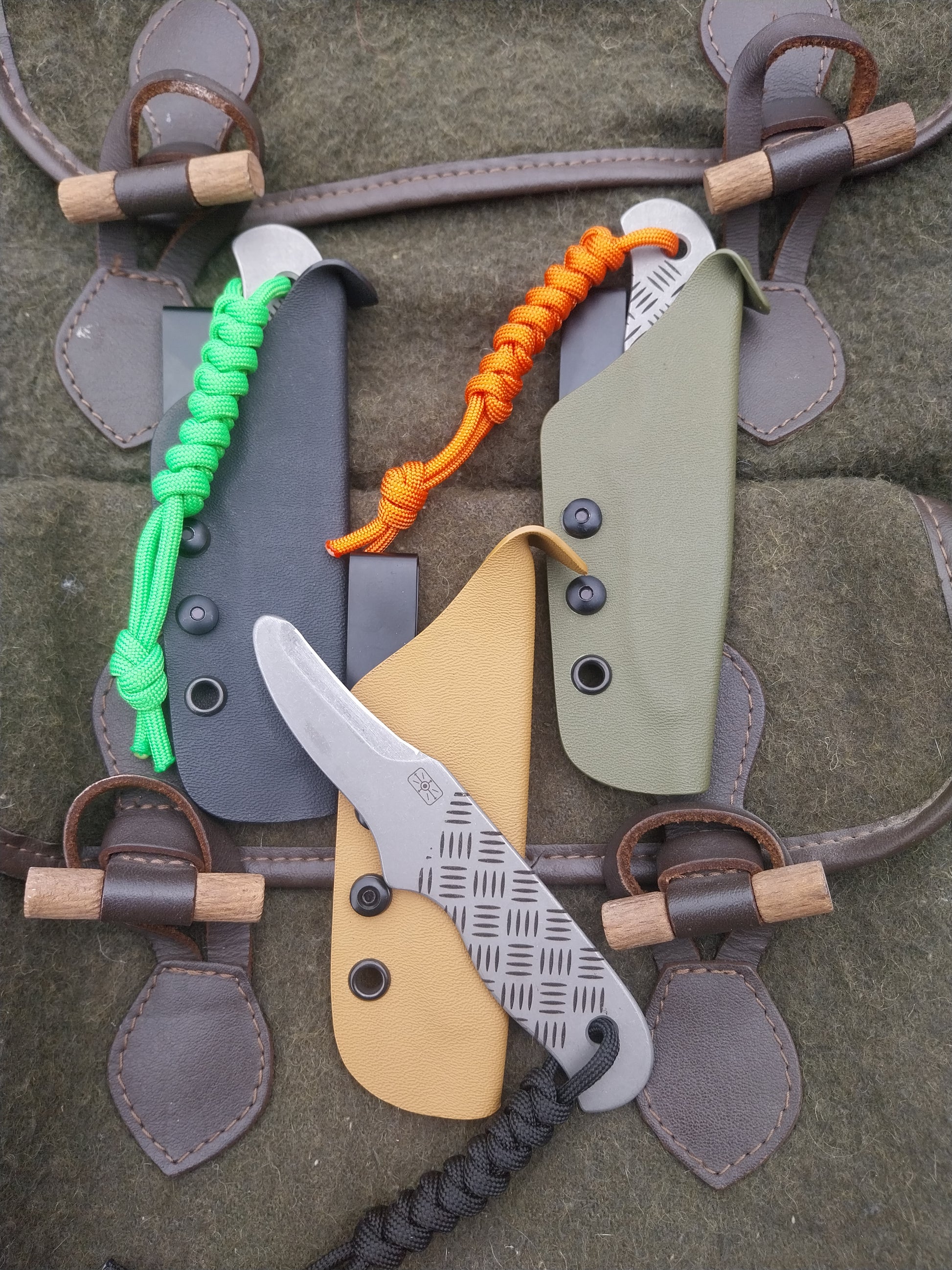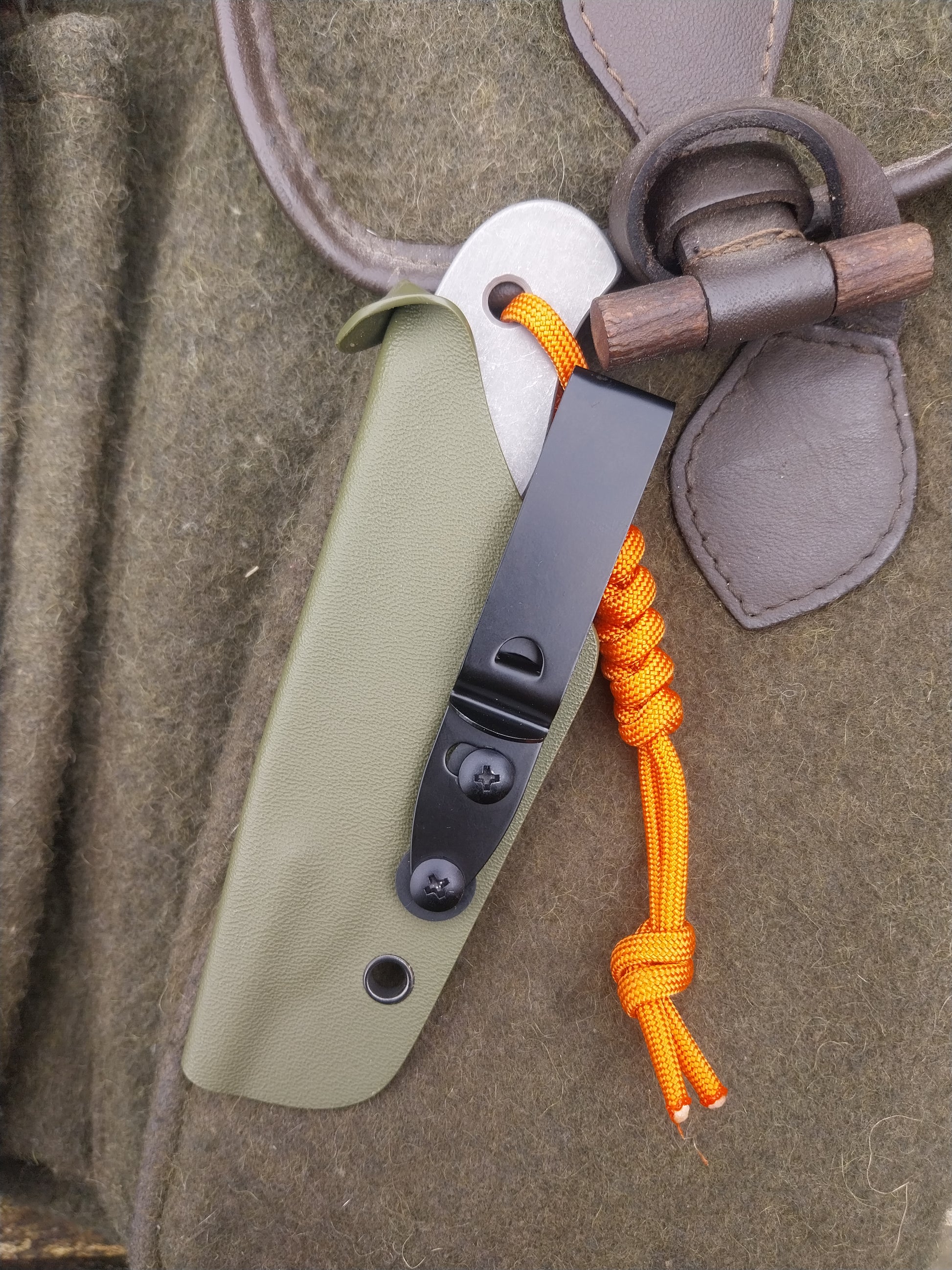 The knife has been acid etched and stone washed with rounded edges to make it comfortable in the hand and has a lanyard added. The sheath is a folded kydex design with a metal belt clip.
