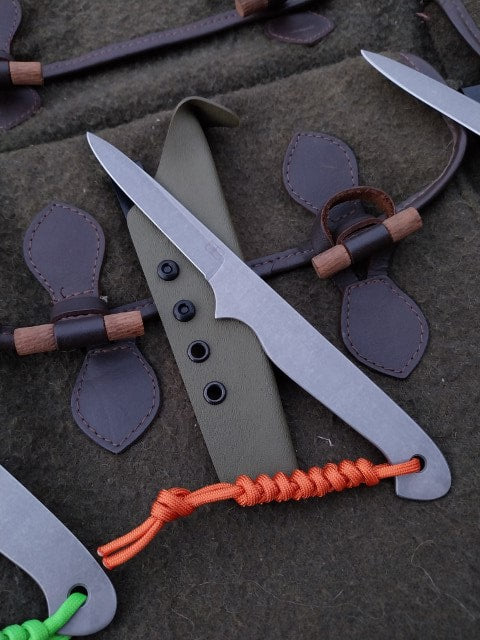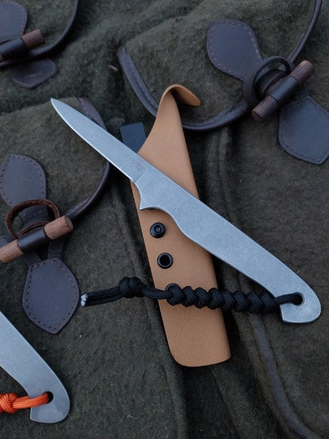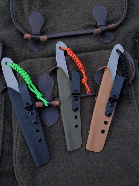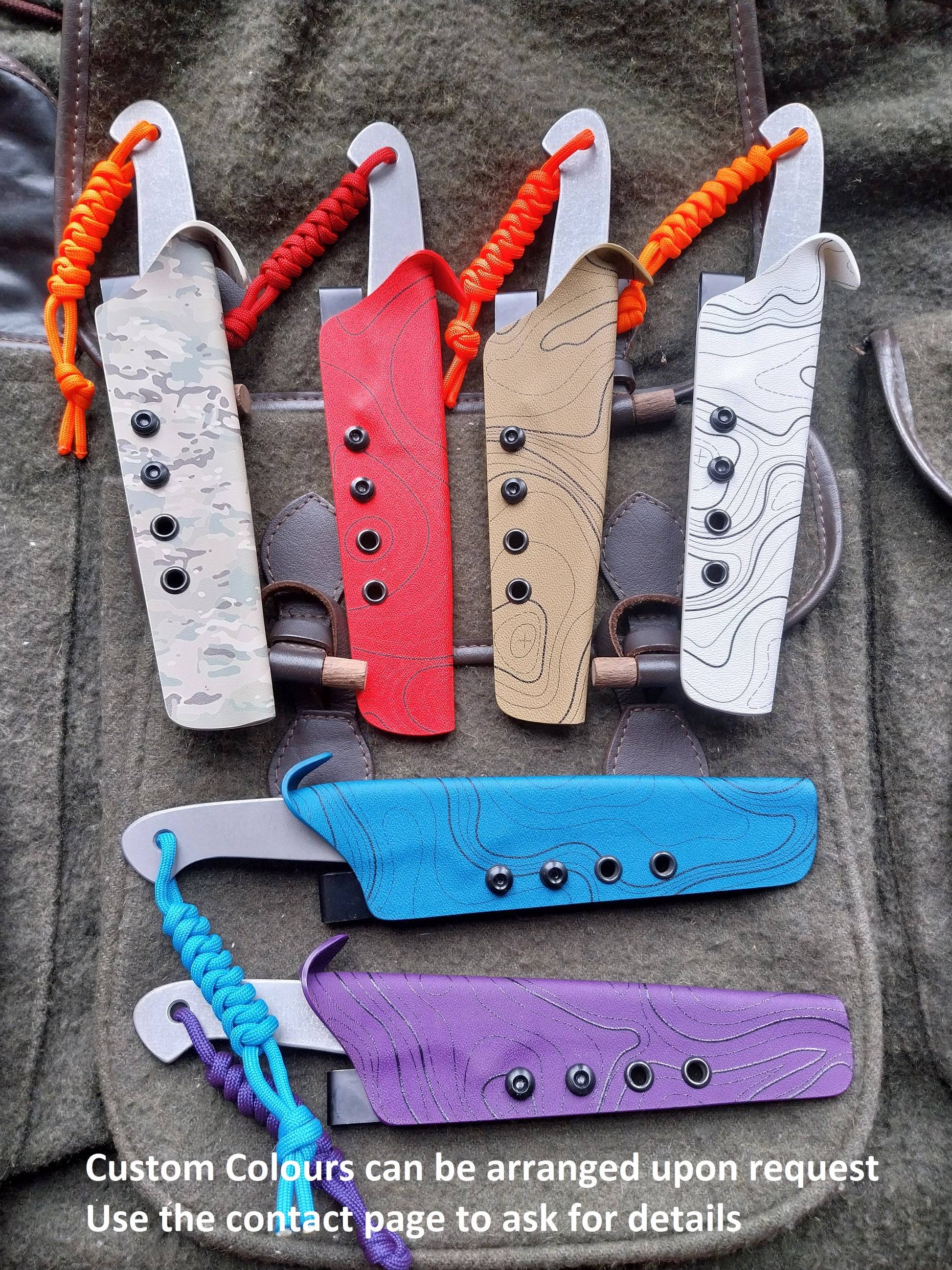 The knife has been acid etched and stone washed with rounded edges to make it comfortable in the hand and has a lanyard added. The sheath is a folded kydex design with a metal belt clip.