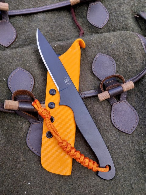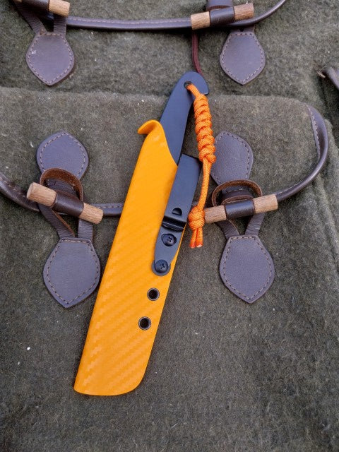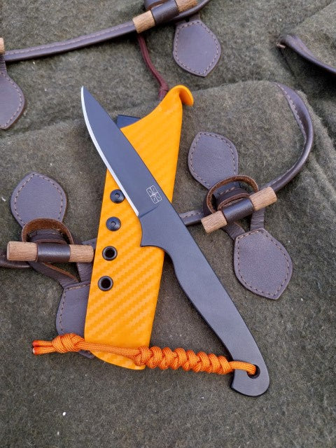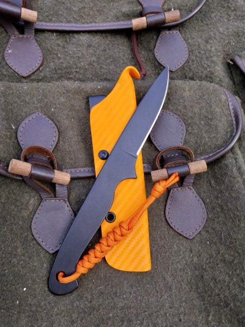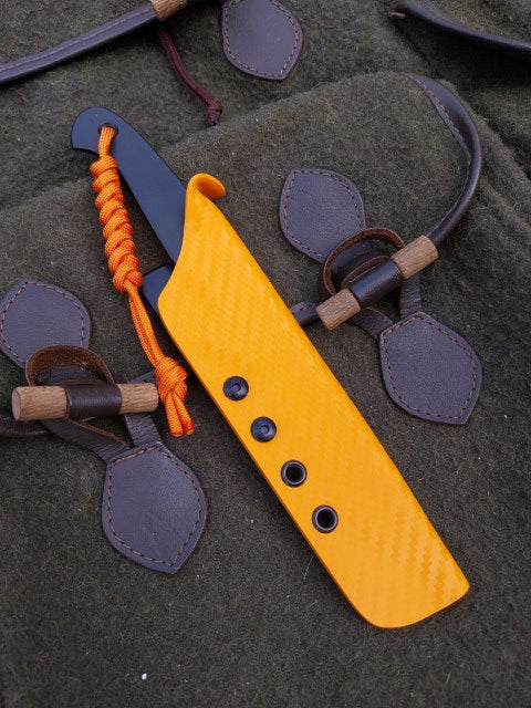 This blade has rounded edges to make it comfortable in the hand, Painted in Cerakote (a ceramic paint used for firearms) and has a lanyard added. The sheath is a folded kydex design with a metal belt clip.