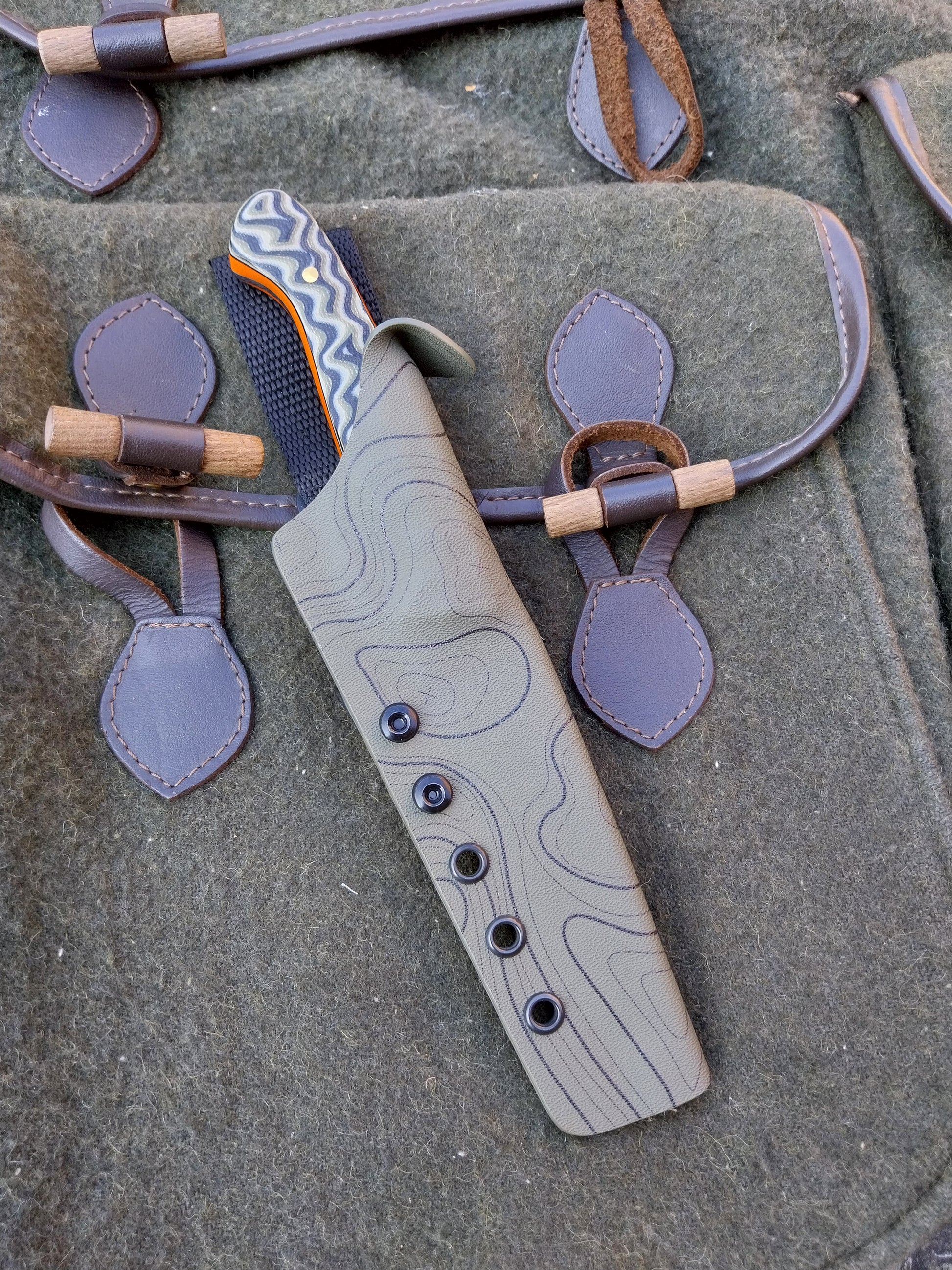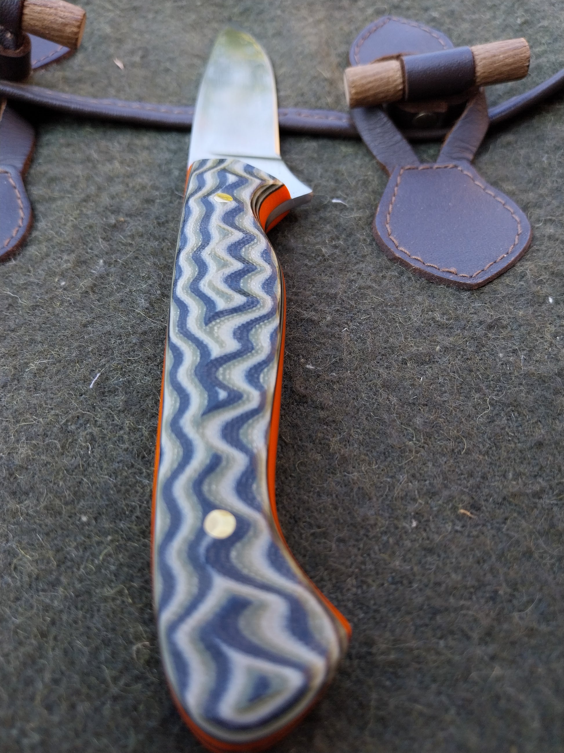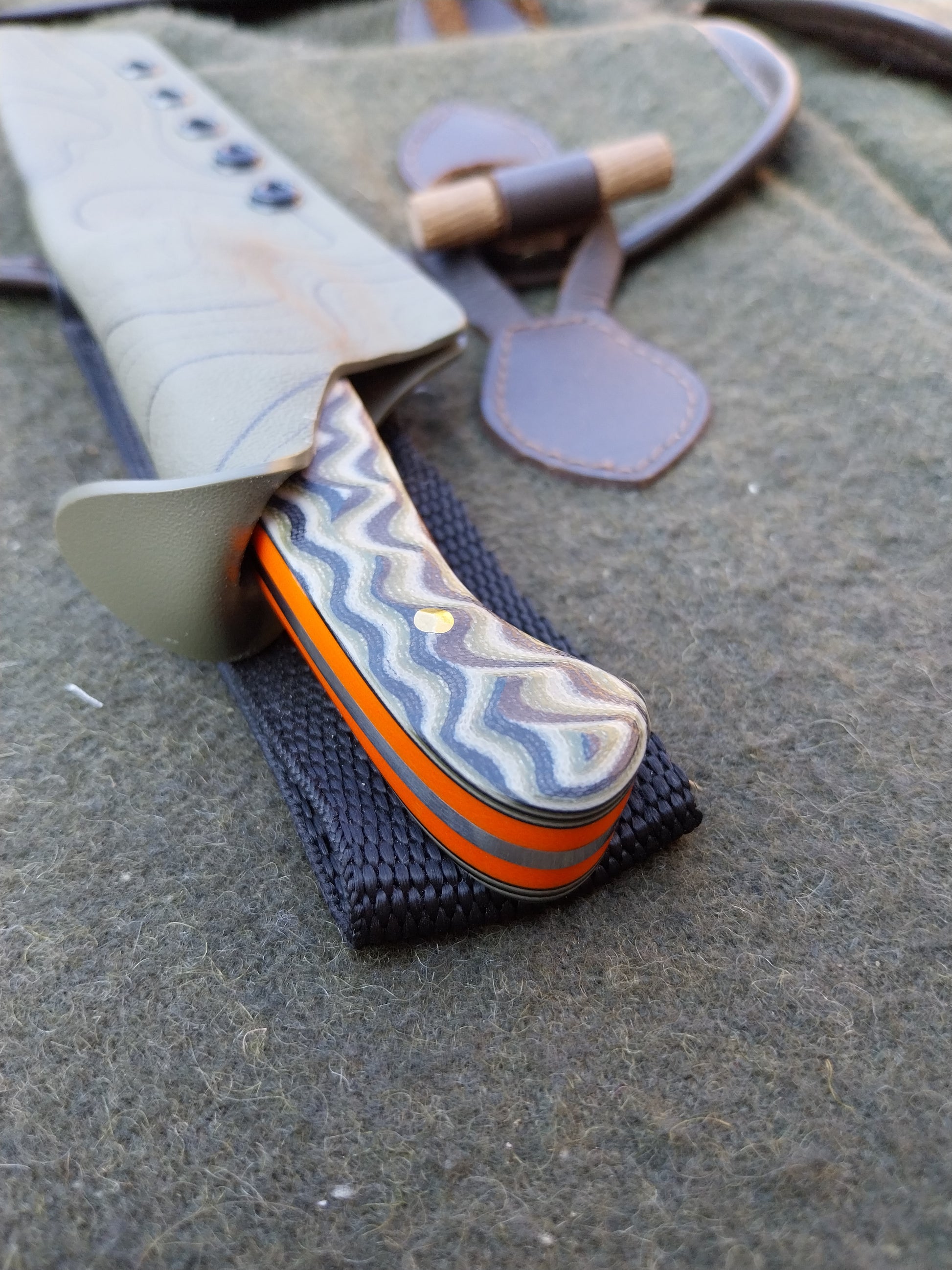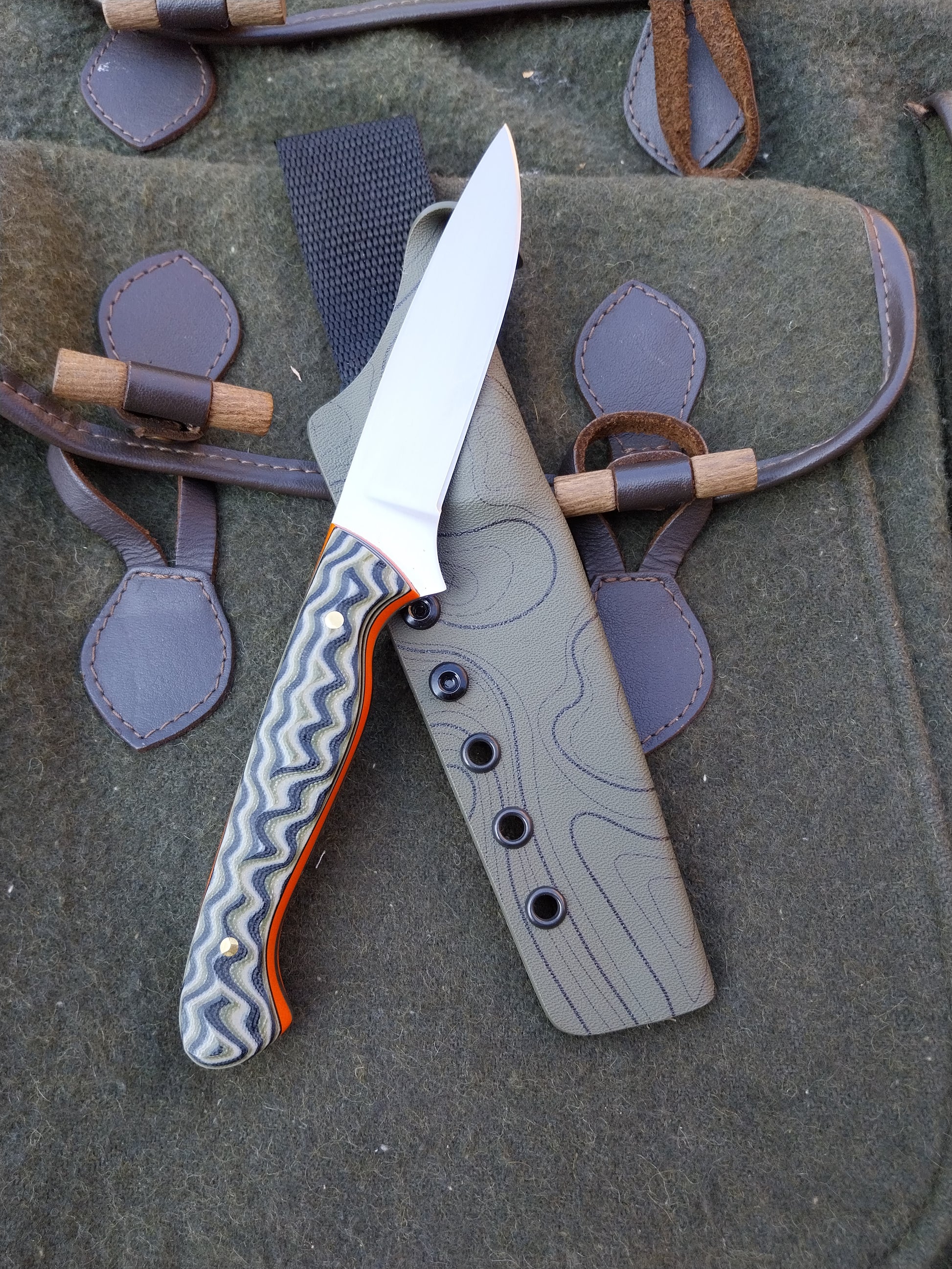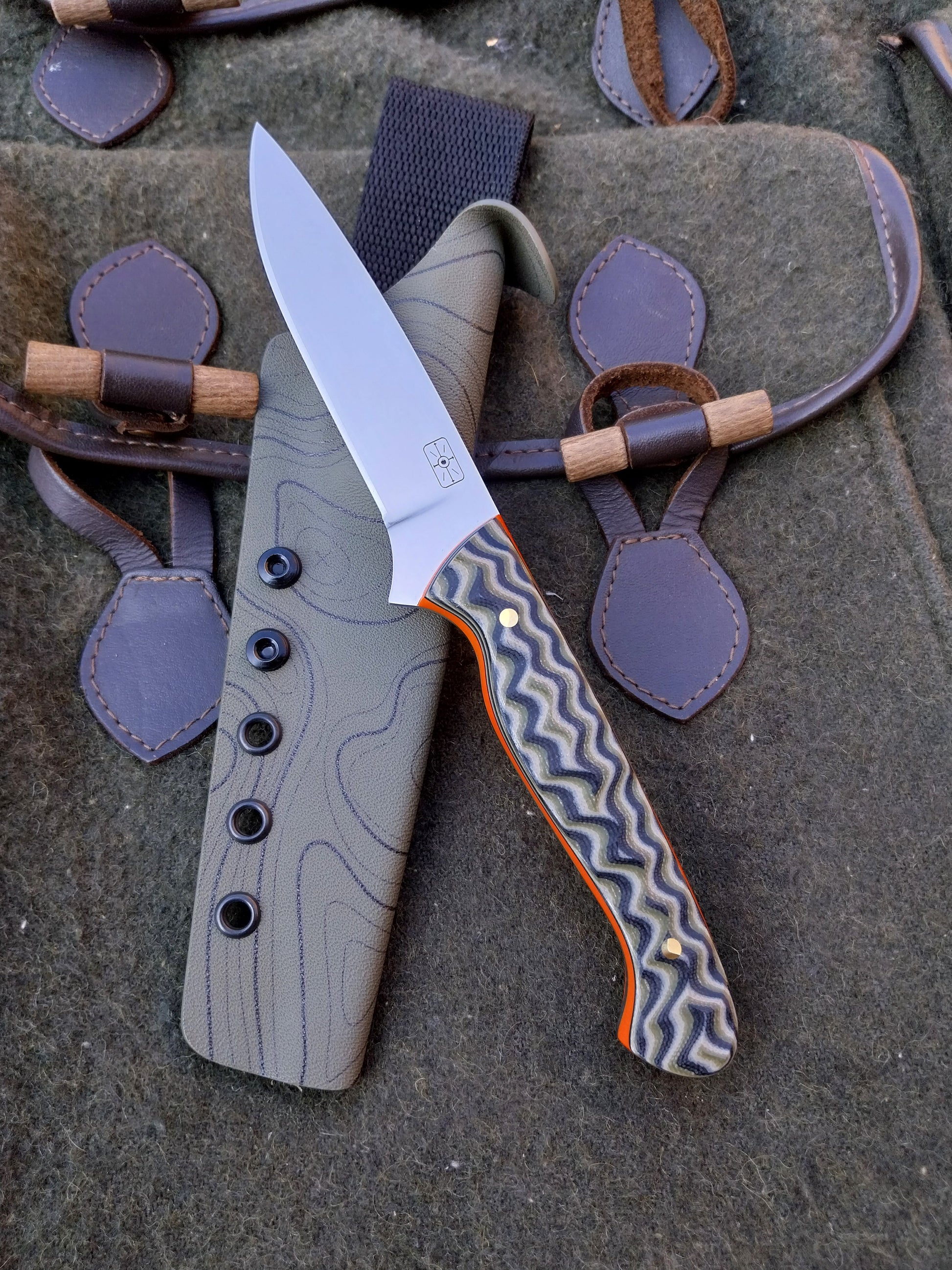 This knife has Camo G10 scales with orange G10 liners. Which have been fitted to the blade with brass pins. And it comes with a green kydex sheath.