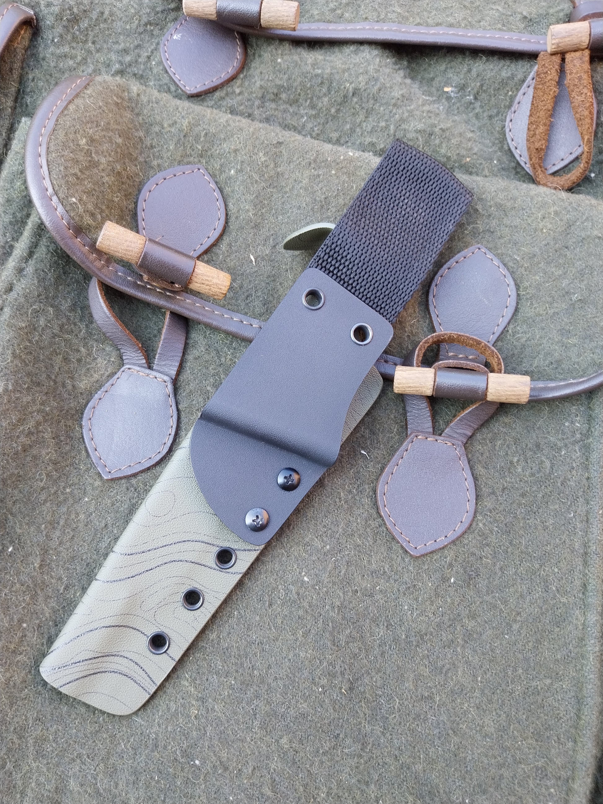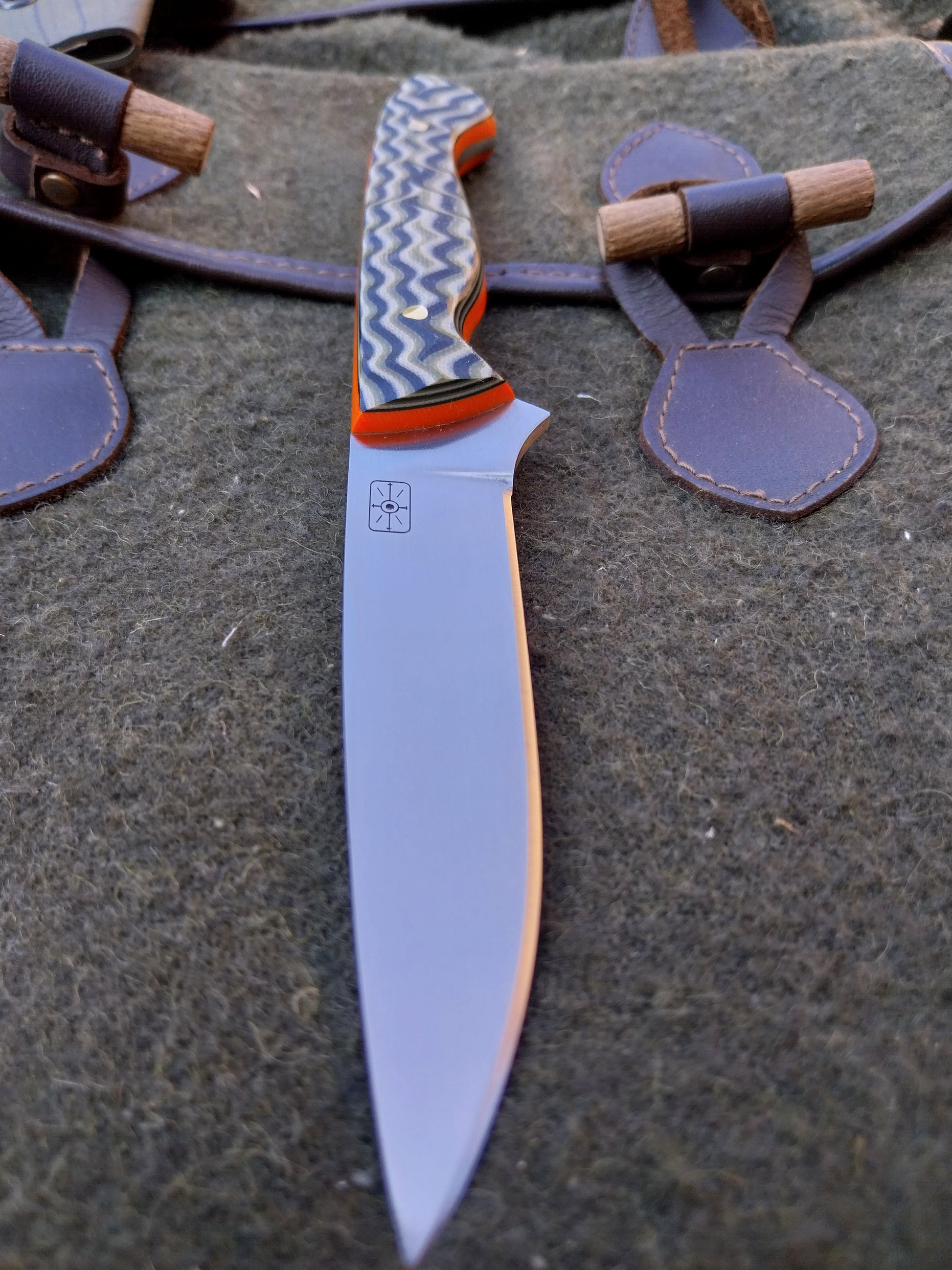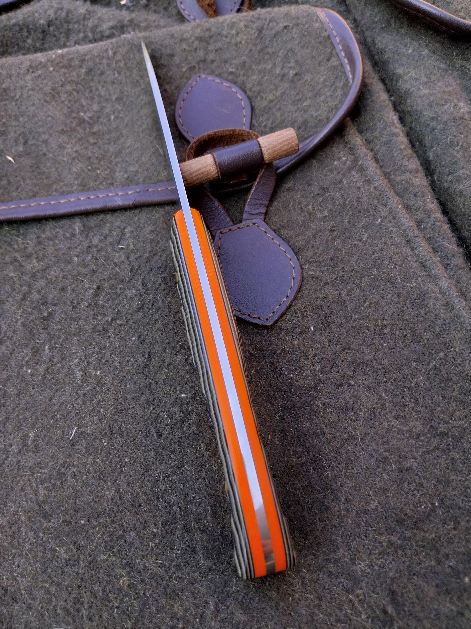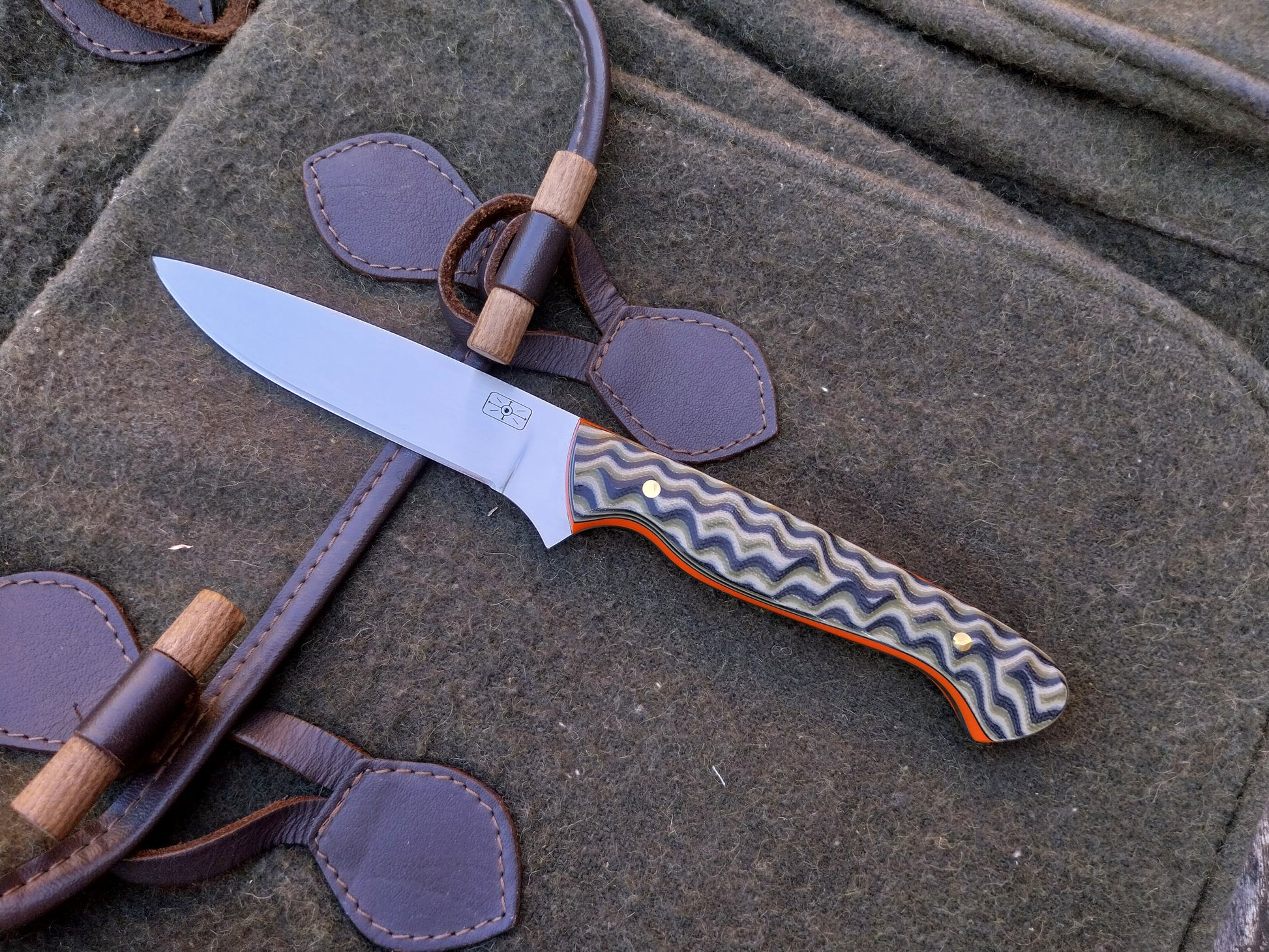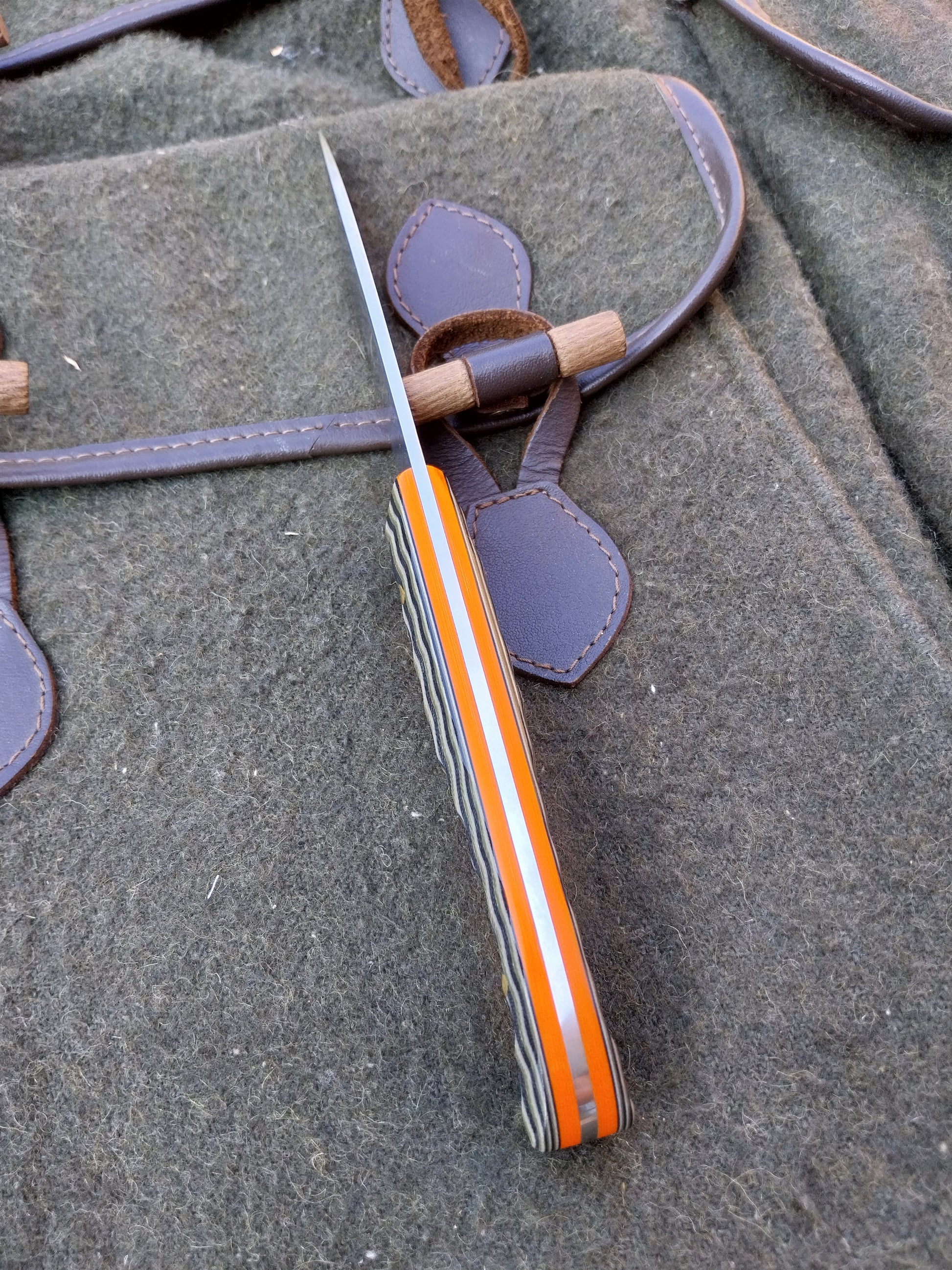 This knife has Camo G10 scales with orange G10 liners. Which have been fitted to the blade with brass pins. And it comes with a green kydex sheath.