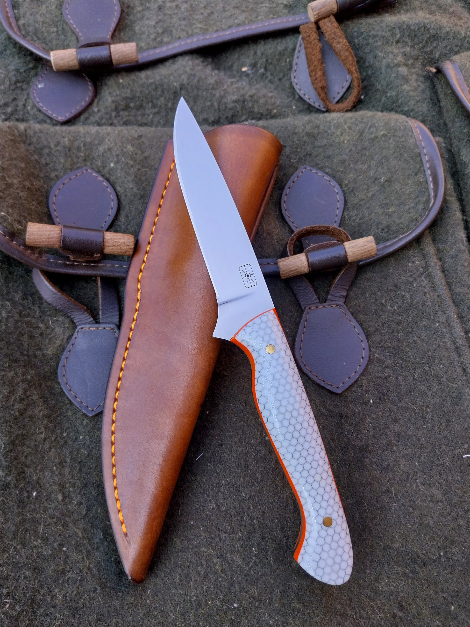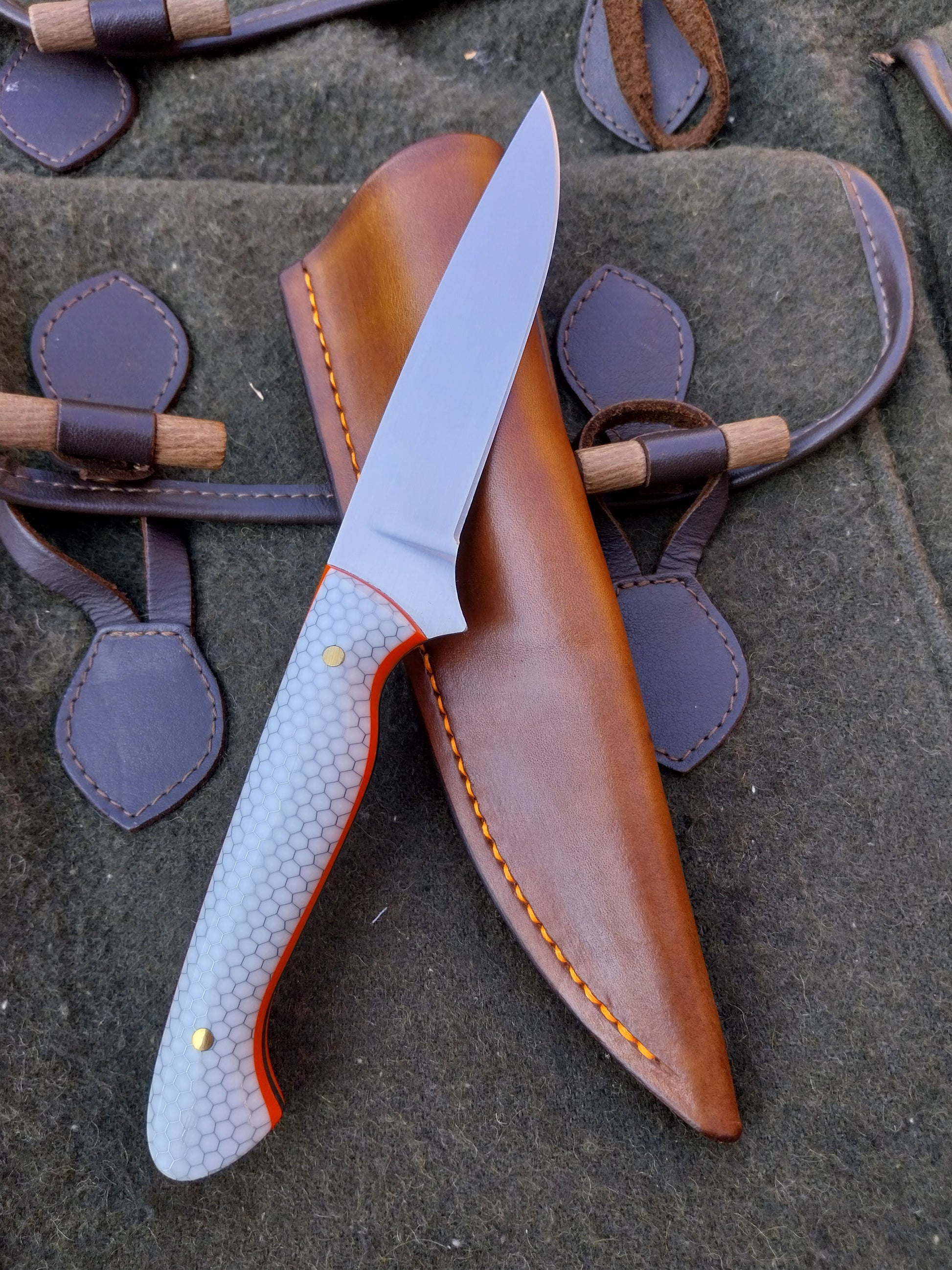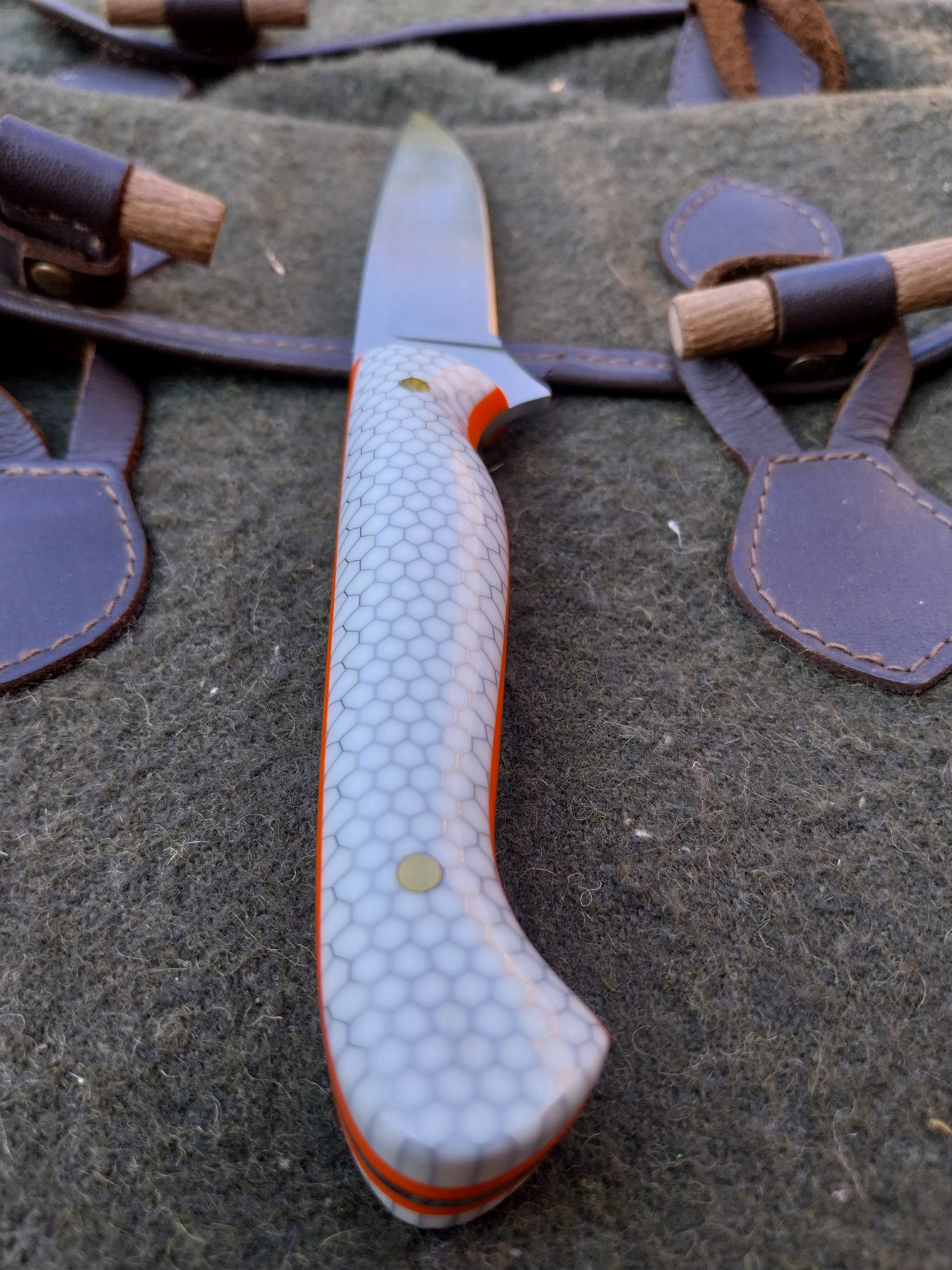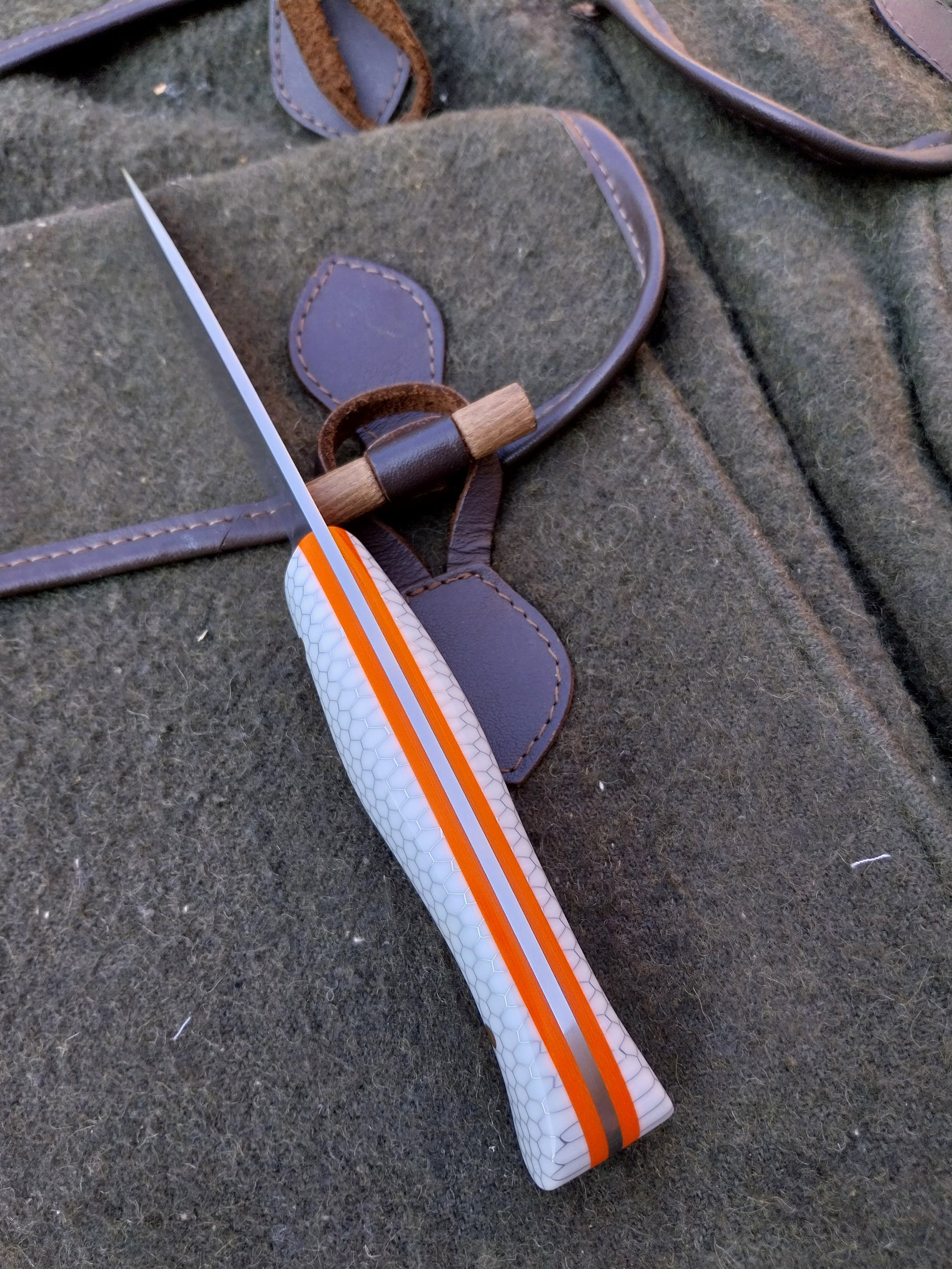 This knife has White C-Tek Honeycomb composite scales with orange G10 liners. Which have been fitted to the blade with stainless steel pins. And it comes with a walnut dyed leather sheath with orange stitching.