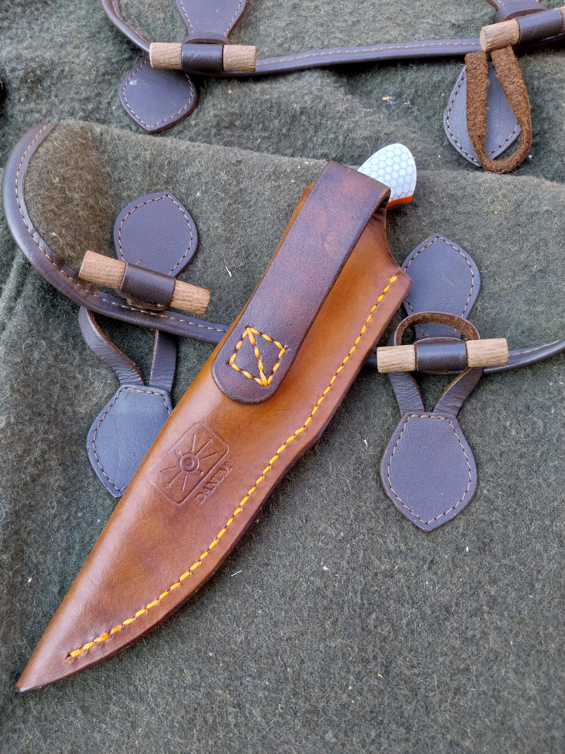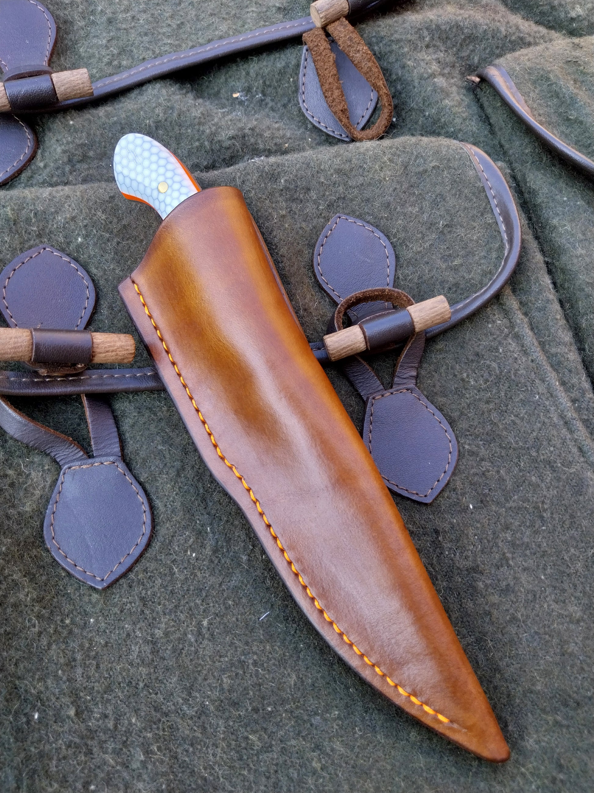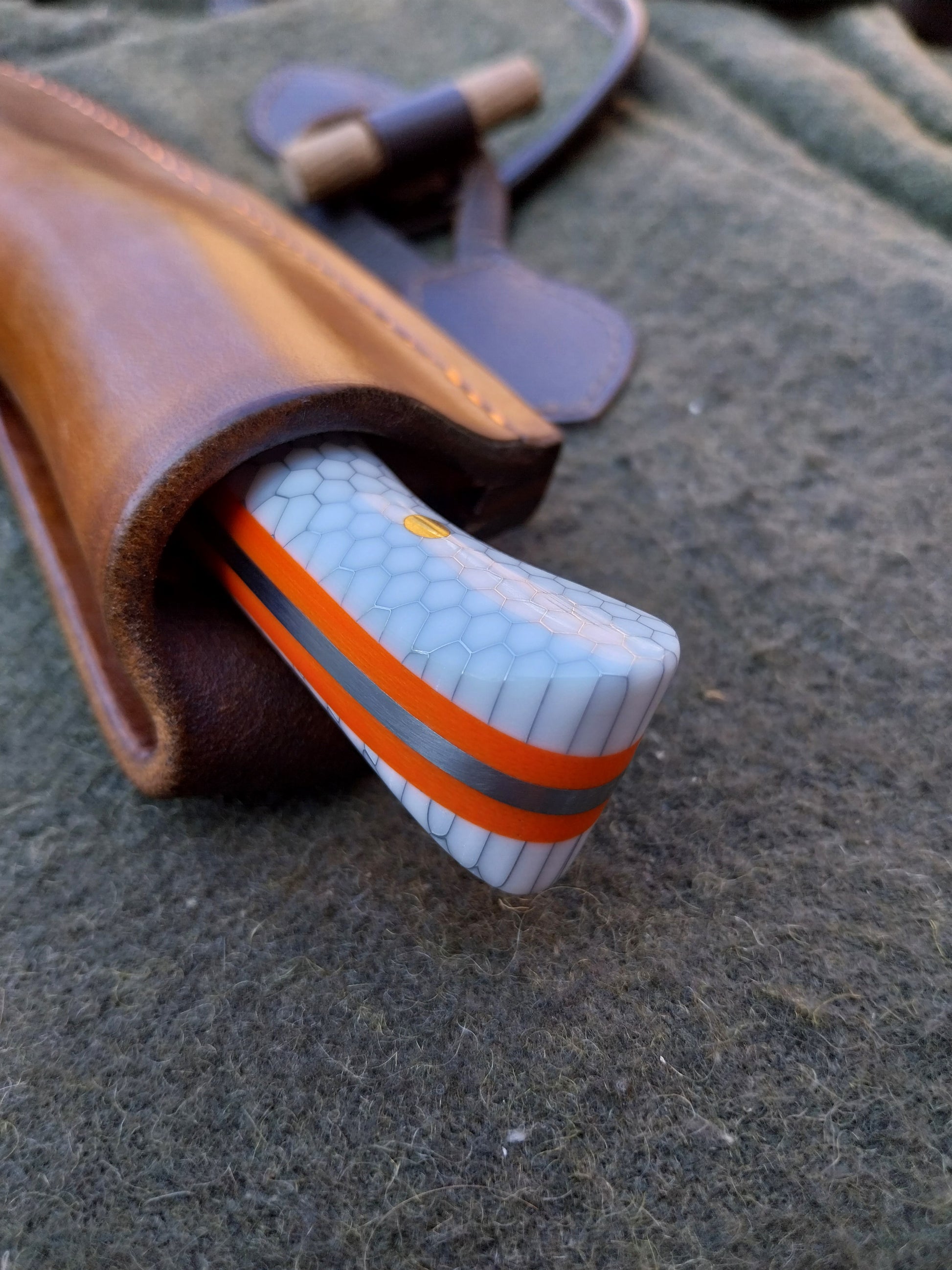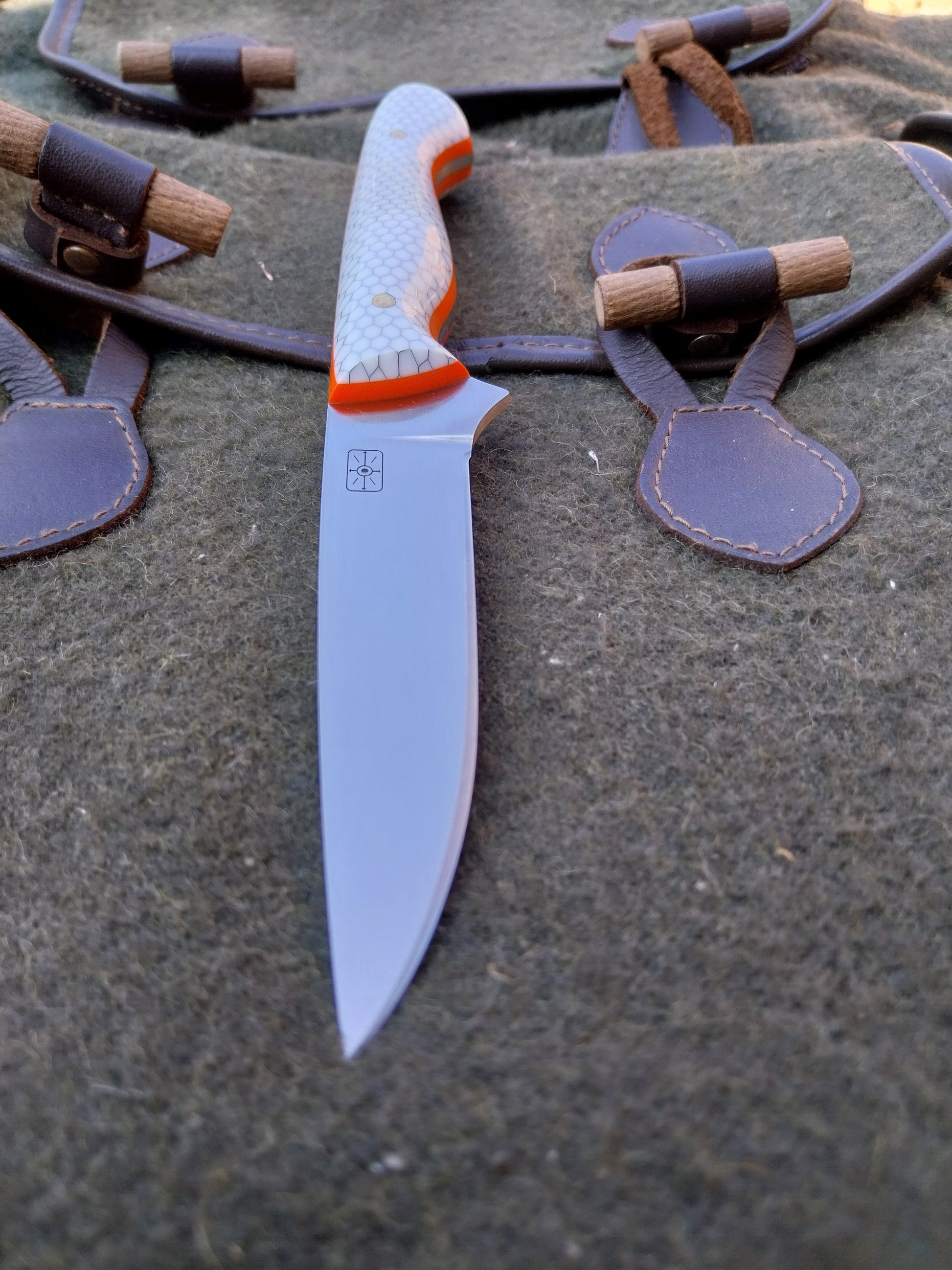 This knife has White C-Tek Honeycomb composite scales with orange G10 liners. Which have been fitted to the blade with stainless steel pins. And it comes with a walnut dyed leather sheath with orange stitching.