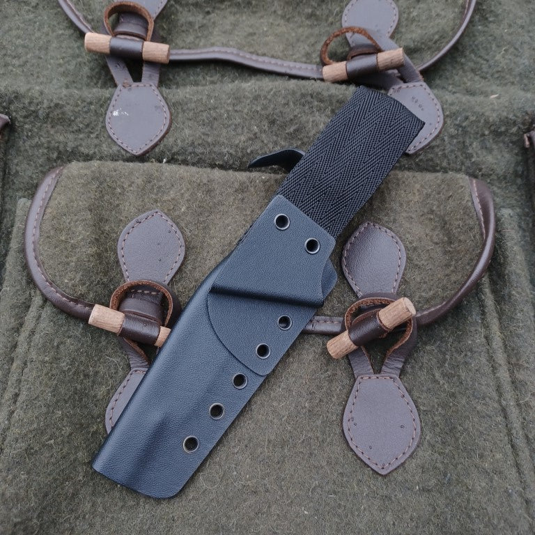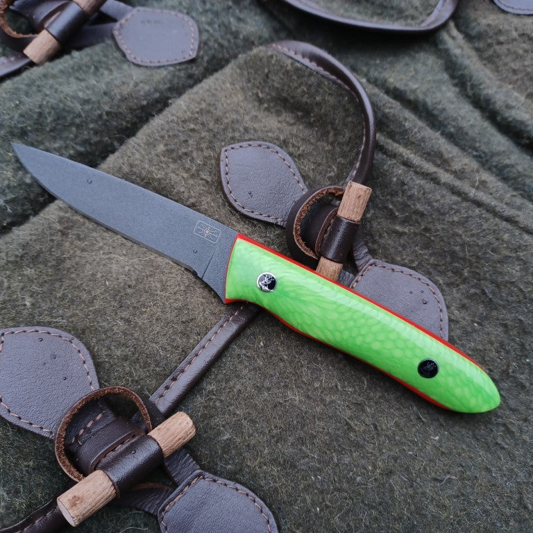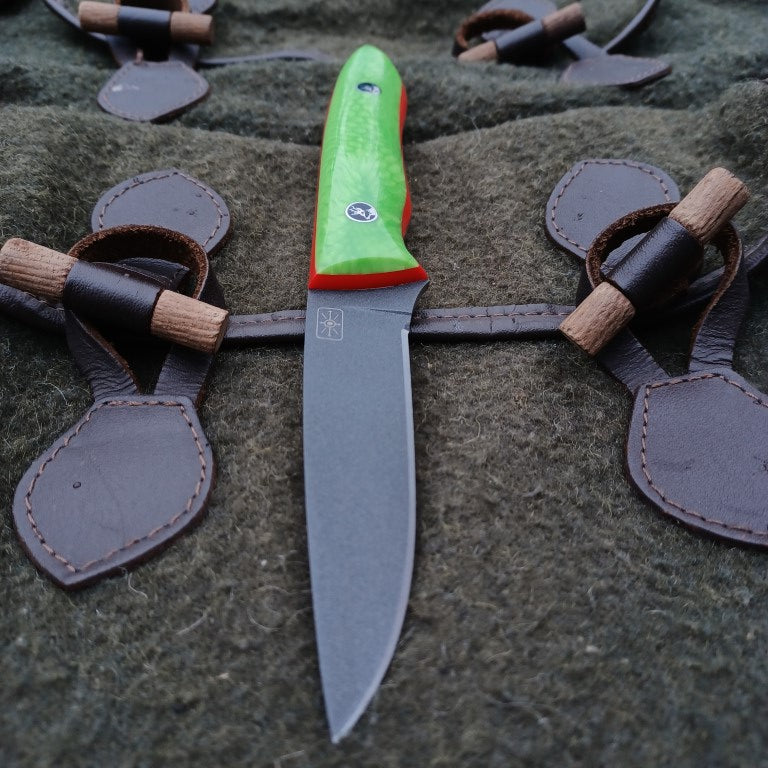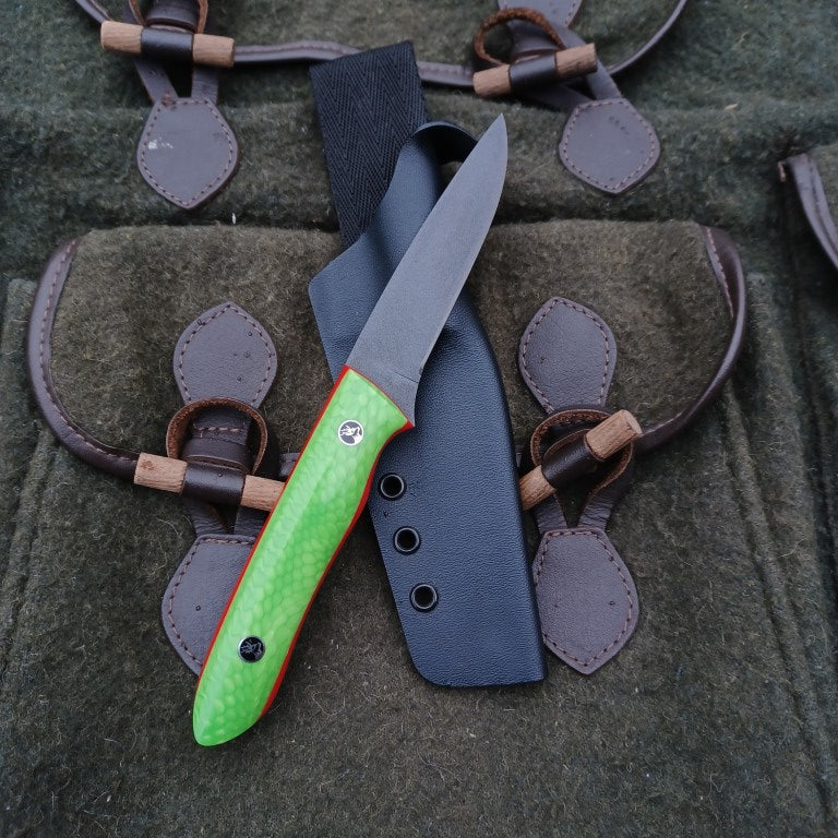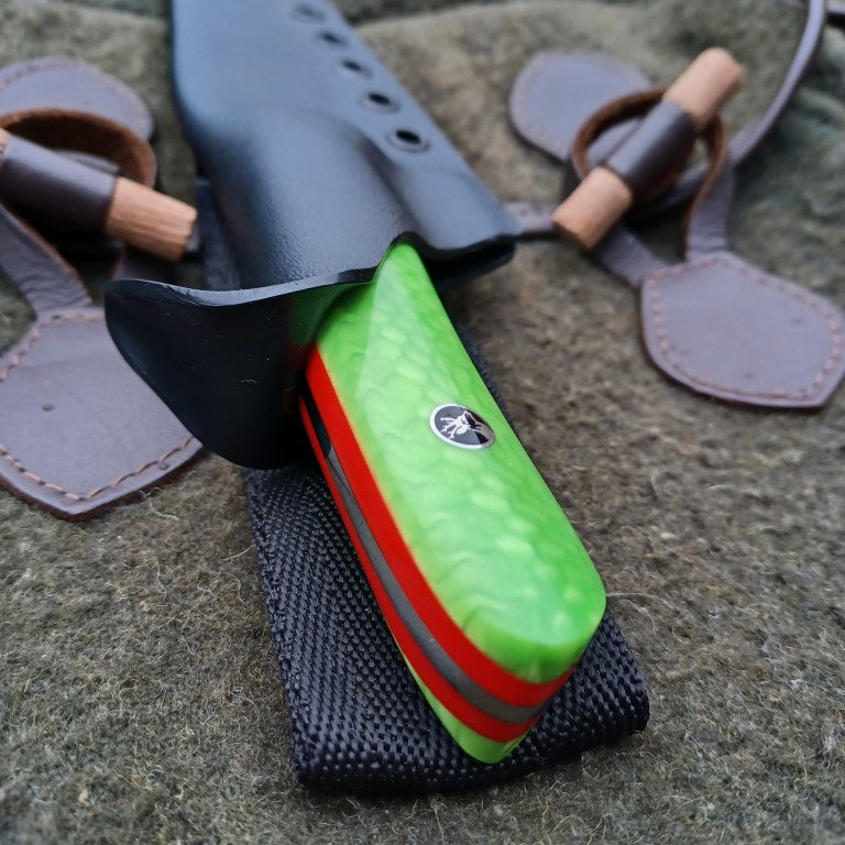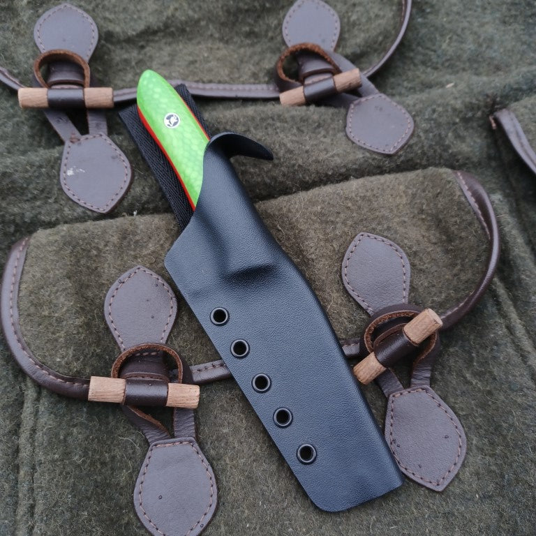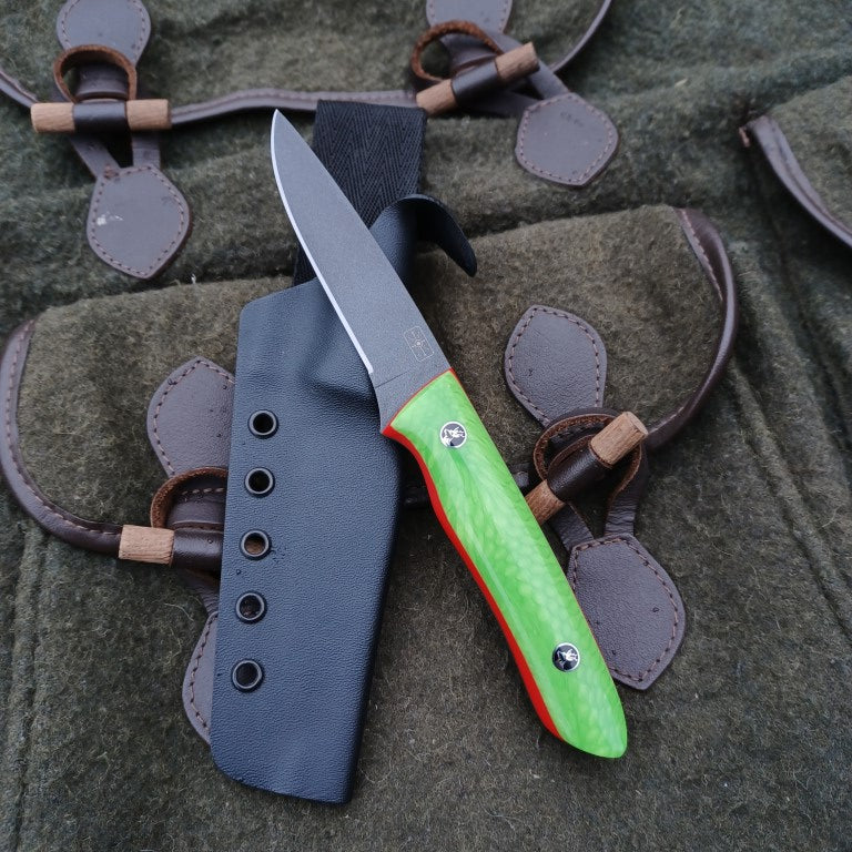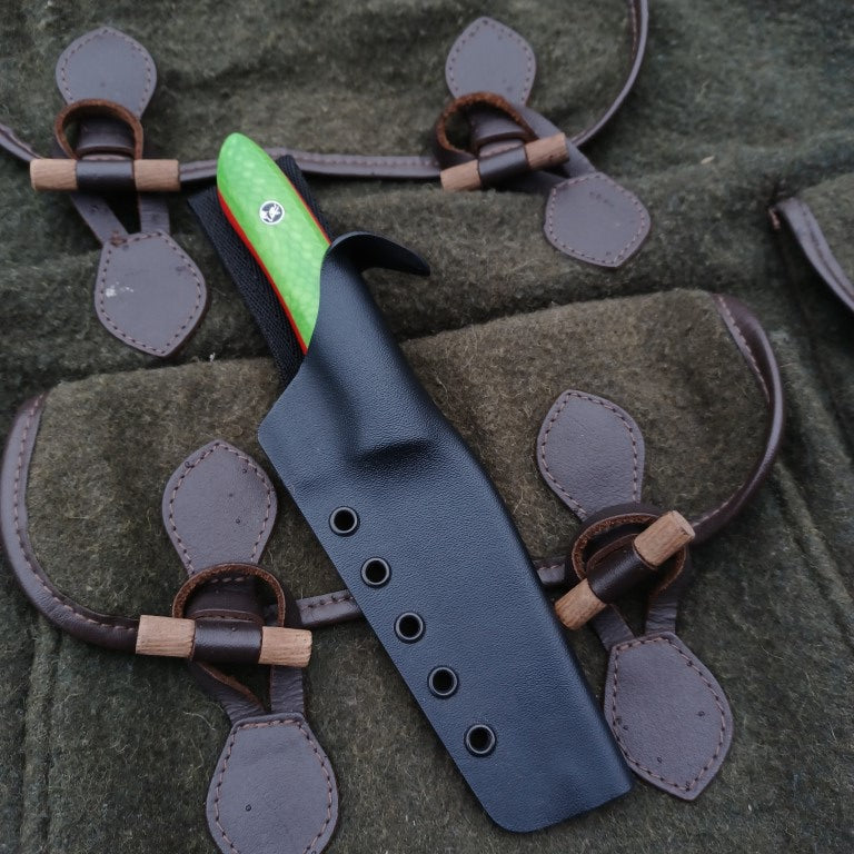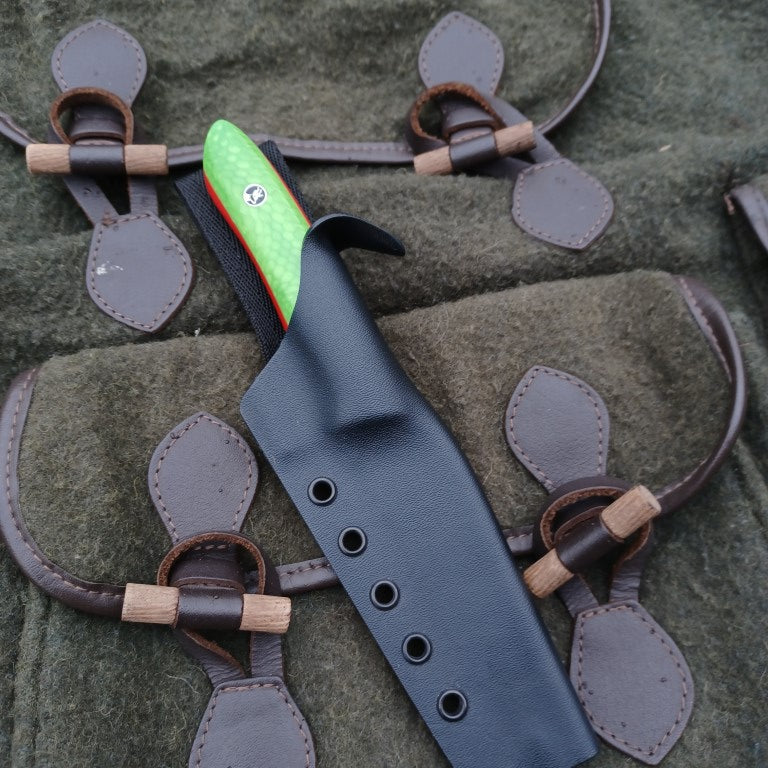 This Roe Stalker knife has been fitted with Green Mamba Juma scales and red G10 liners, these have been fitted to the blade with Stainless Roe Buck pins. And comes with a Black Kydex sheath.