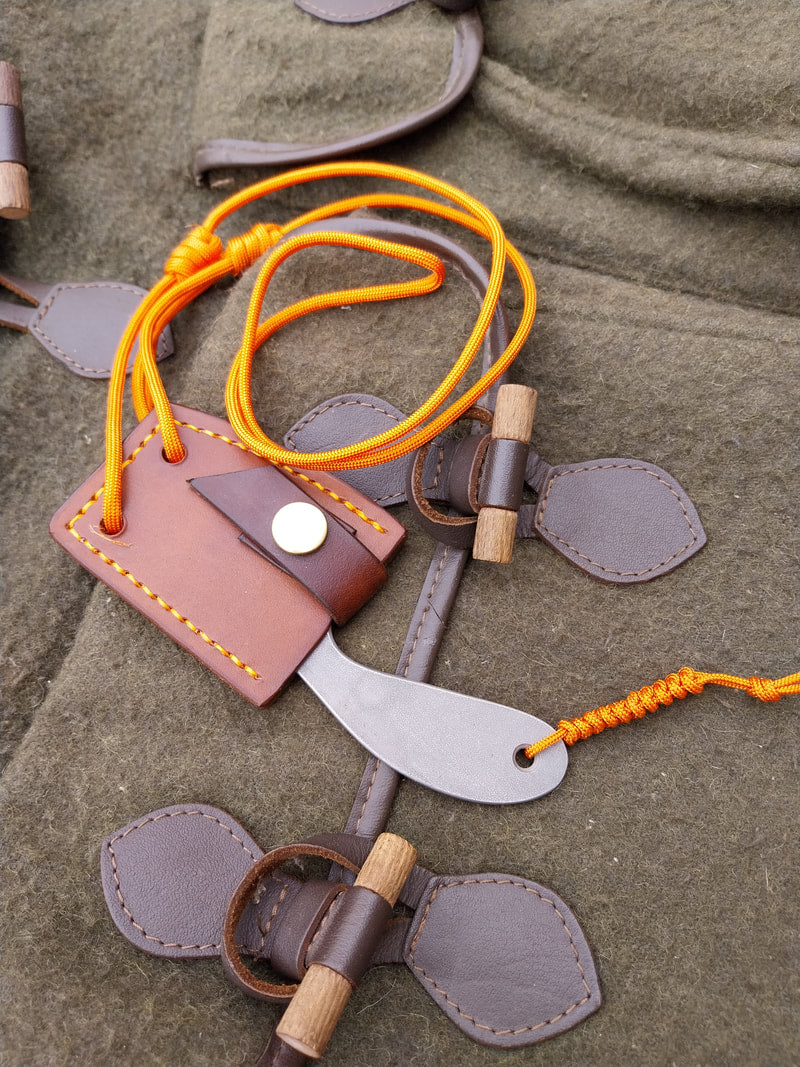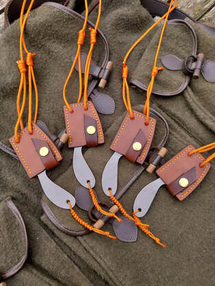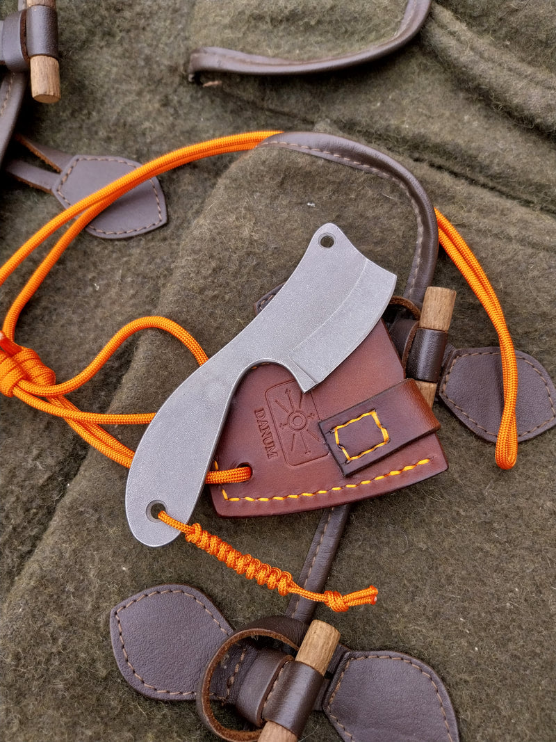 The sheath is a neck carry design made from dark brown veg-tan leather with orange stitching and lanyard.